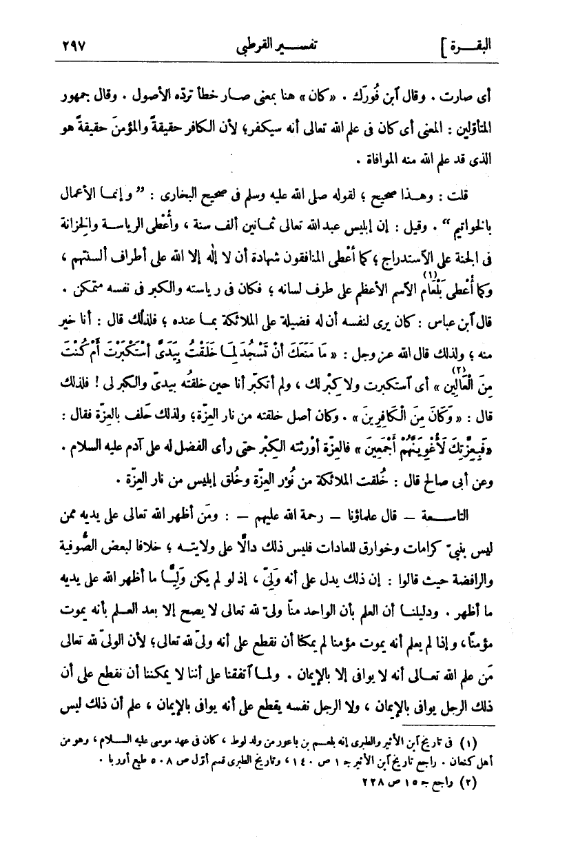 أَيْ صَارَتْ. وَقَالَ ابْنُ فَوْرَكٍ." كَانَ" هُنَا بِمَعْنَى صَارَ خَطَأٌ تَرُدُّهُ الْأُصُولُ. وَقَالَ جُمْهُورُ الْمُتَأَوِّلِينَ: الْمَعْنَى أَيْ كَانَ فِي عِلْمِ اللَّهِ تَعَالَى أَنَّهُ سَيَكْفُرُ، لِأَنَّ الْكَافِرَ حَقِيقَةً وَالْمُؤْمِنَ حَقِيقَةً هُوَ الَّذِي قَدْ عَلِمَ اللَّهُ مِنْهُ الْمُوَافَاةَ. قُلْتُ: وَهَذَا صَحِيحٌ، لِقَوْلِهِ صَلَّى اللَّهُ عَلَيْهِ وَسَلَّمَ فِي صَحِيحِ الْبُخَارِيِّ: (وَإِنَّمَا الْأَعْمَالُ بِالْخَوَاتِيمِ). وَقِيلَ: إِنَّ إِبْلِيسَ عَبَدَ اللَّهَ تَعَالَى ثَمَانِينَ أَلْفَ سَنَةٍ، وَأُعْطِيَ الرِّيَاسَةَ وَالْخِزَانَةَ فِي الْجَنَّةِ عَلَى الِاسْتِدْرَاجِ، كَمَا أُعْطِيَ الْمُنَافِقُونَ شَهَادَةً أَنْ لَا إِلَهَ إِلَّا اللَّهُ عَلَى أَطْرَافِ أَلْسِنَتِهِمْ، وَكَمَا أُعْطِيَ بَلْعَامُ «١» الِاسْمَ الْأَعْظَمَ عَلَى طرف لسانه، فكان في رئاسته وَالْكِبْرُ فِي نَفْسِهِ مُتَمَكِّنٌ. قَالَ ابْنُ عَبَّاسٍ: كَانَ يَرَى لِنَفْسِهِ أَنَّ لَهُ فَضِيلَةً عَلَى الملائكة بما عنده، فلذلك قال: أَنَا خَيْرٌ مِنْهُ، وَلِذَلِكَ قَالَ اللَّهُ عَزَّ وَجَلَّ:" مَا مَنَعَكَ أَنْ تَسْجُدَ لِما خَلَقْتُ بِيَدَيَّ أَسْتَكْبَرْتَ أَمْ كُنْتَ مِنَ الْعالِينَ «٢» " [ص: ٧٥] أَيِ اسْتَكْبَرْتَ وَلَا كِبْرَ لَكَ، وَلَمْ أَتَكَبَّرْ أَنَا حِينَ خَلَقْتُهُ بِيَدَيَّ وَالْكِبْرُ لِي! فَلِذَلِكَ قال:" وَكانَ مِنَ الْكافِرِينَ". [ص: ٧٤]. وَكَانَ أَصْلُ خِلْقَتِهِ مِنْ نَارِ الْعِزَّةِ، وَلِذَلِكَ حلف بالعزة فقال:" فَبِعِزَّتِكَ لَأُغْوِيَنَّهُمْ أَجْمَعِينَ" [ص: ٨٢] فَالْعِزَّةُ أَوْرَثَتْهُ الْكِبْرَ حَتَّى رَأَى الْفَضْلَ لَهُ عَلَى آدَمَ عَلَيْهِ السَّلَامُ. وَعَنْ أَبِي صَالِحٍ قَالَ: خُلِقَتِ الْمَلَائِكَةُ مِنْ نُورِ الْعِزَّةِ وَخُلِقَ إِبْلِيسُ مِنْ نَارِ الْعِزَّةِ. التَّاسِعَةُ- قَالَ عُلَمَاؤُنَا- رَحْمَةُ اللَّهِ عَلَيْهِمْ-: وَمَنْ أَظْهَرَ اللَّهُ تَعَالَى عَلَى يَدَيْهِ مِمَّنْ لَيْسَ بِنَبِيٍّ كَرَامَاتٍ وَخَوَارِقَ لِلْعَادَاتِ فَلَيْسَ ذَلِكَ دَالًّا عَلَى وِلَايَتِهِ، خِلَافًا لِبَعْضِ الصُّوفِيَّةِ وَالرَّافِضَةِ حَيْثُ قَالُوا: إِنَّ ذَلِكَ يَدُلُّ عَلَى أَنَّهُ وَلِيٌّ، إِذْ لَوْ لَمْ يَكُنْ وَلِيًّا مَا أَظْهَرَ اللَّهُ عَلَى يَدَيْهِ مَا أَظْهَرَ. وَدَلِيلُنَا أَنَّ الْعِلْمَ بِأَنَّ الْوَاحِدَ مِنَّا وَلِيٌّ لِلَّهِ تَعَالَى لَا يَصِحُّ إِلَّا بَعْدَ الْعِلْمِ بِأَنَّهُ يَمُوتُ مُؤْمِنًا، وَإِذَا لَمْ يُعْلَمْ أَنَّهُ يَمُوتُ مُؤْمِنًا لَمْ يُمْكِنَّا أَنْ نَقْطَعَ عَلَى أَنَّهُ وَلِيٌّ لِلَّهِ تَعَالَى، لِأَنَّ الْوَلِيَّ لِلَّهِ تَعَالَى مَنْ عَلِمَ اللَّهُ تَعَالَى أَنَّهُ لَا يُوَافِي إِلَّا بِالْإِيمَانِ. وَلَمَّا اتَّفَقْنَا عَلَى أَنَّنَا لَا يُمْكِنُنَا أَنْ نَقْطَعَ عَلَى أَنَّ ذَلِكَ الرَّجُلَ يُوَافِي بِالْإِيمَانِ، وَلَا الرَّجُلُ نَفْسُهُ يَقْطَعُ عَلَى أَنَّهُ يُوَافِي بِالْإِيمَانِ، عُلِمَ أن ذلك ليس