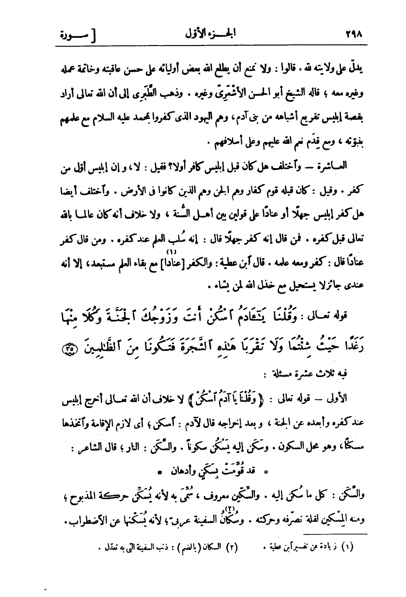فِيهِ ثَلَاثَ عَشْرَةَ مَسْأَلَةً: الْأُولَى- قَوْلُهُ تَعَالَى-: (وَقُلْنا يَا آدَمُ اسْكُنْ) لَا خِلَافَ أَنَّ اللَّهَ تَعَالَى أَخْرَجَ إِبْلِيسَ عِنْدَ كُفْرِهِ وَأَبْعَدَهُ عَنِ الْجَنَّةِ، وَبَعْدَ إِخْرَاجِهِ قَالَ لِآدَمَ: اسْكُنْ، أَيْ لَازِمِ الْإِقَامَةَ وَاتَّخِذْهَا مَسْكَنًا، وَهُوَ مَحَلُّ السُّكُونِ. وَسَكَنَ إِلَيْهِ يَسْكُنُ سُكُونًا. وَالسَّكَنُ: النَّارُ، قَالَ الشَّاعِرُ: