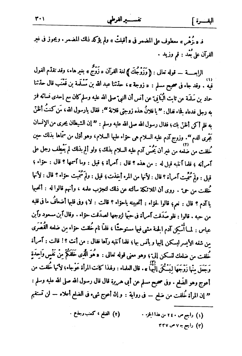 فَ" زُهْرٌ" مَعْطُوفٌ عَلَى الْمُضْمَرِ فِي" أَقْبَلَتْ" وَلَمْ يُؤَكِّدْ ذَلِكَ الْمُضْمَرَ. وَيَجُوزُ فِي غَيْرِ الْقُرْآنِ عَلَى بُعْدٍ: قُمْ وَزَيْدٌ. الرَّابِعَةُ- قَوْلُهُ تَعَالَى:" وَزَوْجُكَ" لُغَةُ الْقُرْآنِ" زَوْجٌ" بِغَيْرِ هَاءٍ، وقد تقدم القول فيه «١». وَقَدْ جَاءَ فِي صَحِيحِ مُسْلِمٍ:" زَوْجَةٌ" حَدَّثَنَا عَبْدُ اللَّهِ بْنُ مَسْلَمَةَ بْنِ قَعْنَبٍ قَالَ حَدَّثَنَا حَمَّادُ بْنُ سَلَمَةَ عَنْ ثَابِتٍ الْبُنَانِيِّ عَنْ أَنَسٍ أَنَّ النَّبِيَّ صَلَّى اللَّهُ عَلَيْهِ وَسَلَّمَ كَانَ مَعَ إِحْدَى نِسَائِهِ فَمَرَّ بِهِ رَجُلٌ فَدَعَاهُ فَجَاءَ فَقَالَ: (يَا فُلَانُ هَذِهِ زَوْجَتِي فُلَانَةُ): فَقَالَ يَا رَسُولَ اللَّهِ، مَنْ كُنْتُ أَظُنُّ بِهِ فَلَمْ أَكُنْ أَظُنُّ بِكَ، فَقَالَ رَسُولُ اللَّهِ صَلَّى اللَّهُ عَلَيْهِ وَسَلَّمَ: (إِنَّ الشَّيْطَانَ يَجْرِي مِنَ الْإِنْسَانِ مَجْرَى الدَّمِ). وَزَوْجُ آدَمَ عَلَيْهِ السَّلَامُ هِيَ حَوَّاءُ عَلَيْهَا السَّلَامُ، وَهُوَ أَوَّلُ مَنْ سَمَّاهَا بِذَلِكَ حِينَ خُلِقَتْ مِنْ ضِلْعِهِ «٢» مِنْ غَيْرِ أَنْ يُحِسَّ آدَمُ عَلَيْهِ السَّلَامُ بِذَلِكَ، وَلَوْ أَلِمَ بِذَلِكَ لَمْ يَعْطِفْ رَجُلٌ عَلَى امْرَأَتِهِ، فَلَمَّا انْتَبَهَ قِيلَ لَهُ: مَنْ هَذِهِ؟ قَالَ: امْرَأَةٌ قِيلَ: وَمَا اسْمُهَا؟ قَالَ: حَوَّاءُ، قِيلَ: وَلِمَ سُمِّيَتِ امْرَأَةً؟ قَالَ: لِأَنَّهَا مِنَ الْمَرْءِ أُخِذَتْ، قِيلَ: وَلِمَ سُمِّيَتْ حَوَّاءَ؟ قَالَ: لِأَنَّهَا خُلِقَتْ مِنْ حَيٍّ. رُوِيَ أَنَّ الْمَلَائِكَةَ سَأَلَتْهُ عَنْ ذَلِكَ لِتُجَرِّبَ عِلْمَهُ، وَأَنَّهُمْ قَالُوا لَهُ: أَتُحِبُّهَا يَا آدَمُ؟ قَالَ: نَعَمْ، قَالُوا لِحَوَّاءَ: أَتُحِبِّينَهُ يَا حَوَّاءُ؟ قَالَتْ: لَا، وَفِي قَلْبِهَا أَضْعَافُ مَا فِي قَلْبِهِ مِنْ حُبِّهِ. قَالُوا: فَلَوْ صَدَقَتِ امْرَأَةٌ فِي حُبِّهَا لِزَوْجِهَا لَصَدَقَتْ حَوَّاءُ. وَقَالَ ابْنُ مَسْعُودٍ وَابْنُ عَبَّاسٍ: لَمَّا أُسْكِنَ آدَمُ الْجَنَّةَ مَشَى فِيهَا مُسْتَوْحِشًا، فَلَمَّا نَامَ خُلِقَتْ حَوَّاءُ مِنْ ضِلَعِهِ الْقُصْرَى مِنْ شِقِّهِ الْأَيْسَرِ لِيَسْكُنَ إِلَيْهَا وَيَأْنَسَ بِهَا، فَلَمَّا انْتَبَهَ رَآهَا فَقَالَ: مَنْ أَنْتِ؟ قَالَتِ: امْرَأَةٌ خُلِقْتُ مِنْ ضِلَعِكَ لِتَسْكُنَ إِلَيَّ، وَهُوَ مَعْنَى قَوْلِهِ تَعَالَى:" هُوَ الَّذِي خَلَقَكُمْ مِنْ نَفْسٍ واحِدَةٍ وَجَعَلَ مِنْها زَوْجَها لِيَسْكُنَ إِلَيْها" «٣» [الأعراف: ١٨٩]. قَالَ الْعُلَمَاءُ: وَلِهَذَا كَانَتِ الْمَرْأَةُ عَوْجَاءَ، لِأَنَّهَا خُلِقَتْ مِنْ أَعْوَجَ وَهُوَ الضِّلَعُ. وَفِي صَحِيحِ مُسْلِمٍ عَنْ أَبِي هُرَيْرَةَ قَالَ قَالَ رَسُولُ اللَّهِ صَلَّى اللَّهُ عَلَيْهِ وَسَلَّمَ: (إِنَّ الْمَرْأَةَ خُلِقَتْ مِنْ ضِلْعٍ- فِي رِوَايَةٍ: وَإِنَّ أَعْوَجَ شي في الضلع أعلاه- لن تستقيم