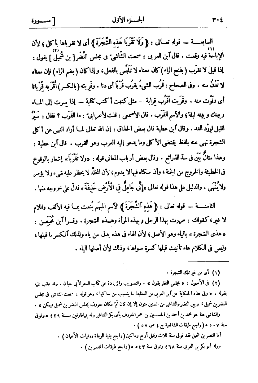(٢). في الأصول: (مجلس النظر يقول). والتصويب والزيادة عن كتاب البحر لابي حيان. وقد عقب عليه بقوله: (وفي هذه الحكاية عن ابن العربي من التخطيط ما يتعجب من حاكيها، وهو قوله: سَمِعْتُ الشَّاشِيَّ فِي مَجْلِسِ النَّضْرِ بْنِ شُمَيْلٍ، وبين النضر والشاشي من السنين مئون إلا إن كان ثم مكان معروف بمجلس النضر بن شميل فيمكن). والشاشي هنا هو محمد بن أحمد بن الحسين بن عمر المعروف بأبي بكر الشاشي ولد بميافارقين سنة ٤٢٩ هـ وتوفى سنة ٥٠٧ هـ (راجع طبقات الشافعية ج ٤ ص ٥٧). أما النصر بن شميل فقد توفى سنة ثلاث وقيل أربع ومائتين (راجع بغية الوعاة ووفيات الأعيان). وولد أبو بكر بن العربي سنة ٤٦٨ وتوفى سنة ٥٤٣ هـ (راجع طبقات المفسرين).