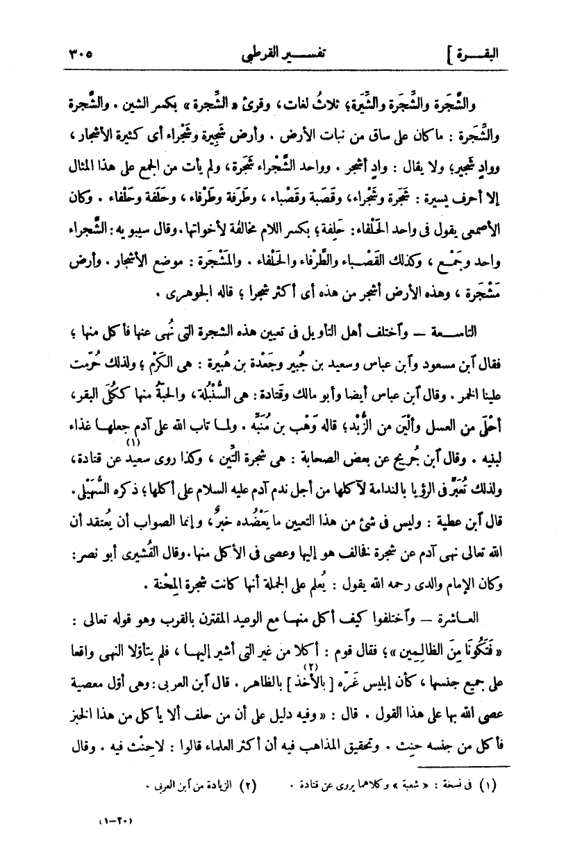 والشجرة والشجرة والشيرة، ثلاث لغات وقرى" الشجرة" بكسر الشين. والشجرة وَالشِّجَرَةُ: مَا كَانَ عَلَى سَاقٍ مِنْ نَبَاتِ الْأَرْضِ. وَأَرْضٌ شَجِيرَةٌ وَشَجْرَاءُ أَيْ كَثِيرَةُ الْأَشْجَارِ، وَوَادٍ شَجِيرٌ، وَلَا يُقَالُ: وَادٍ أَشْجَرُ. وَوَاحِدُ الشَّجْرَاءِ شَجَرَةٌ، وَلَمْ يَأْتِ مِنَ الْجَمْعِ عَلَى هَذَا الْمِثَالِ إِلَّا أَحْرُفٌ يَسِيرَةٌ: شَجَرَةٌ وَشَجْرَاءُ، وَقَصَبَةٌ وَقَصْبَاءُ، وَطَرْفَةٌ وَطَرْفَاءُ، وَحَلْفَةٌ وَحَلْفَاءُ. وَكَانَ الْأَصْمَعِيُّ يَقُولُ فِي وَاحِدِ الْحَلْفَاءِ: حَلِفَةٌ، بِكَسْرِ اللَّامِ مُخَالَفَةً لِأَخَوَاتِهَا. وَقَالَ سِيبَوَيْهِ: الشَّجْرَاءُ وَاحِدٌ وَجَمْعٌ، وَكَذَلِكَ الْقَصْبَاءُ وَالطَّرْفَاءُ وَالْحَلْفَاءُ. وَالْمَشْجَرَةُ: مَوْضِعُ الْأَشْجَارِ. وَأَرْضٌ مَشْجَرَةٌ، وَهَذِهِ الْأَرْضُ أَشْجَرُ مِنْ هذه أي أكثر شجرا، قال الْجَوْهَرِيُّ. التَّاسِعَةُ- وَاخْتَلَفَ أَهْلُ التَّأْوِيلِ فِي تَعْيِينِ هَذِهِ الشَّجَرَةِ الَّتِي نُهِيَ عَنْهَا فَأَكَلَ مِنْهَا، فَقَالَ ابْنُ مَسْعُودٍ وَابْنُ عَبَّاسٍ وَسَعِيدُ بْنُ جُبَيْرٍ وَجَعْدَةُ بْنُ هُبَيْرَةَ: هِيَ الْكَرْمُ، وَلِذَلِكَ حُرِّمَتْ عَلَيْنَا الْخَمْرُ. وَقَالَ ابْنُ عَبَّاسٍ أَيْضًا وَأَبُو مَالِكٍ وَقَتَادَةُ: هِيَ السُّنْبُلَةُ، وَالْحَبَّةُ مِنْهَا كَكُلَى الْبَقَرِ، أَحْلَى مِنَ الْعَسَلِ وَأَلْيَنُ مِنَ الزُّبْدِ، قَالَهُ وَهْبُ بْنُ مُنَبِّهٍ. وَلَمَّا تَابَ اللَّهُ عَلَى آدَمَ جَعَلَهَا غِذَاءً لِبَنِيهِ. وَقَالَ ابْنُ جُرَيْجٍ عَنْ بَعْضِ الصَّحَابَةِ: هِيَ شَجَرَةُ التِّينِ، وَكَذَا رَوَى سَعِيدٌ «١» عَنْ قَتَادَةَ، وَلِذَلِكَ تُعَبَّرُ فِي الرُّؤْيَا بِالنَّدَامَةِ لِآكِلِهَا مِنْ أَجْلِ نَدَمِ آدَمَ عَلَيْهِ السَّلَامُ عَلَى أَكْلِهَا، ذَكَرَهُ السهيلي. قال ابن عطية: وليس في شي مِنْ هَذَا التَّعْيِينِ مَا يُعَضِّدُهُ خَبَرٌ، وَإِنَّمَا الصَّوَابُ أَنْ يُعْتَقَدَ أَنَّ اللَّهَ تَعَالَى نَهَى آدَمَ عَنْ شَجَرَةٍ فَخَالَفَ هُوَ إِلَيْهَا وَعَصَى فِي الْأَكْلِ مِنْهَا. وَقَالَ الْقُشَيْرِيُّ أَبُو نَصْرٍ: وَكَانَ الْإِمَامُ وَالِدِي رَحِمَهُ اللَّهُ يَقُولُ: يُعْلَمُ عَلَى الْجُمْلَةِ أَنَّهَا كَانَتْ شَجَرَةَ الْمِحْنَةِ. الْعَاشِرَةُ- وَاخْتَلَفُوا كَيْفَ أَكَلَ مِنْهَا مَعَ الْوَعِيدِ الْمُقْتَرِنِ بِالْقُرْبِ وَهُوَ قَوْلُهُ تَعَالَى:" فَتَكُونا مِنَ الظَّالِمِينَ"، فَقَالَ قَوْمٌ: أَكَلَا مِنْ غَيْرِ الَّتِي أُشِيرَ إِلَيْهَا فَلَمْ يَتَأَوَّلَا النَّهْيَ وَاقِعًا عَلَى جَمِيعِ جِنْسِهَا، كَأَنَّ إِبْلِيسَ غَرَّهُ [بِالْأَخْذِ «٢»] بِالظَّاهِرِ قَالَ ابْنُ الْعَرَبِيِّ: وَهِيَ أَوَّلُ مَعْصِيَةٍ عُصِيَ اللَّهُ بِهَا عَلَى هَذَا الْقَوْلِ. قَالَ:" وَفِيهِ دَلِيلٌ عَلَى أَنَّ مَنْ حَلَفَ أَلَّا يَأْكُلَ مِنْ هَذَا الْخُبْزِ فَأَكَلَ مِنْ جِنْسِهِ حَنِثَ. وَتَحْقِيقُ الْمَذَاهِبِ فِيهِ أَنَّ أَكْثَرَ الْعُلَمَاءِ قَالُوا: لَا حنث فيه. وقال