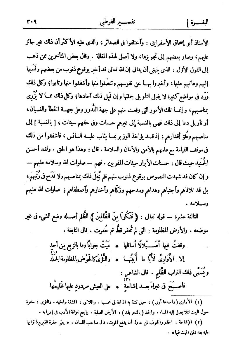 الأستاذ أبو إسحاق الاسفرايني: وَاخْتَلَفُوا فِي الصَّغَائِرِ، وَالَّذِي عَلَيْهِ الْأَكْثَرُ أَنَّ ذَلِكَ غَيْرُ جَائِزٍ عَلَيْهِمْ، وَصَارَ بَعْضُهُمْ إِلَى تَجْوِيزِهَا، وَلَا أَصْلَ لِهَذِهِ الْمَقَالَةِ. وَقَالَ بَعْضُ الْمُتَأَخِّرِينَ مِمَّنْ ذَهَبَ إِلَى الْقَوْلِ الْأَوَّلِ: الَّذِي يَنْبَغِي أَنْ يُقَالَ إِنَّ اللَّهَ تَعَالَى قَدْ أَخْبَرَ بِوُقُوعِ ذُنُوبٍ مِنْ بَعْضِهِمْ وَنَسَبَهَا إِلَيْهِمْ وَعَاتَبَهُمْ عَلَيْهَا، وَأَخْبَرُوا بِهَا عَنْ نُفُوسِهِمْ وَتَنَصَّلُوا مِنْهَا وَأَشْفَقُوا مِنْهَا وَتَابُوا، وَكُلُّ ذَلِكَ وَرَدَ فِي مَوَاضِعَ كَثِيرَةٍ لَا يَقْبَلُ التَّأْوِيلَ جُمْلَتُهَا وَإِنْ قَبِلَ ذَلِكَ آحَادُهَا، وَكُلُّ ذَلِكَ مِمَّا لَا يُزْرِي بِمَنَاصِبِهِمْ، وَإِنَّمَا تِلْكَ الْأُمُورُ الَّتِي وَقَعَتْ مِنْهُمْ عَلَى جِهَةِ النُّدُورِ وَعَلَى جِهَةِ الْخَطَأِ وَالنِّسْيَانِ، أَوْ تَأْوِيلٍ دَعَا إِلَى ذَلِكَ فَهِيَ بِالنِّسْبَةِ إِلَى غَيْرِهِمْ حَسَنَاتٌ وَفِي حَقِّهِمْ سَيِّئَاتٌ، [بِالنِّسْبَةِ] إِلَى مَنَاصِبِهِمْ وَعُلُوِّ أَقْدَارِهِمْ، إِذْ قَدْ يُؤَاخَذُ الْوَزِيرُ بِمَا يُثَابُ عَلَيْهِ السَّائِسُ، فَأَشْفَقُوا مِنْ ذَلِكَ فِي مَوْقِفِ الْقِيَامَةِ مَعَ عِلْمِهِمْ بِالْأَمْنِ وَالْأَمَانِ وَالسَّلَامَةِ. قَالَ: وَهَذَا هُوَ الْحَقُّ. وَلَقَدْ أَحْسَنَ الْجُنَيْدُ حَيْثُ قَالَ: حَسَنَاتُ الْأَبْرَارِ سَيِّئَاتُ الْمُقَرَّبِينَ. فَهُمْ- صَلَوَاتُ اللَّهِ وَسَلَامُهُ عَلَيْهِمْ- وَإِنْ كَانَ قَدْ شَهِدَتِ النُّصُوصُ بِوُقُوعِ ذُنُوبٍ مِنْهُمْ فَلَمْ يُخِلَّ ذَلِكَ بِمَنَاصِبِهِمْ وَلَا قَدْحَ فِي رُتَبِهِمْ، بَلْ قَدْ تَلَافَاهُمْ وَاجْتَبَاهُمْ وَهَدَاهُمْ وَمَدَحَهُمْ وَزَكَّاهُمْ وَاخْتَارَهُمْ وَاصْطَفَاهُمْ، صَلَوَاتُ اللَّهِ عَلَيْهِمْ وَسَلَامُهُ. الثَّالِثَةَ عَشْرَةَ- قَوْلُهُ تَعَالَى: (فَتَكُونا مِنَ الظَّالِمِينَ) الظُّلْمُ أَصْلُهُ وَضْعُ الشَّيْءِ فِي غَيْرِ مَوْضِعِهِ. وَالْأَرْضُ الْمَظْلُومَةُ: الَّتِي لَمْ تُحْفَرْ قَطُّ ثُمَّ حُفِرَتْ. قَالَ النَّابِغَةُ: