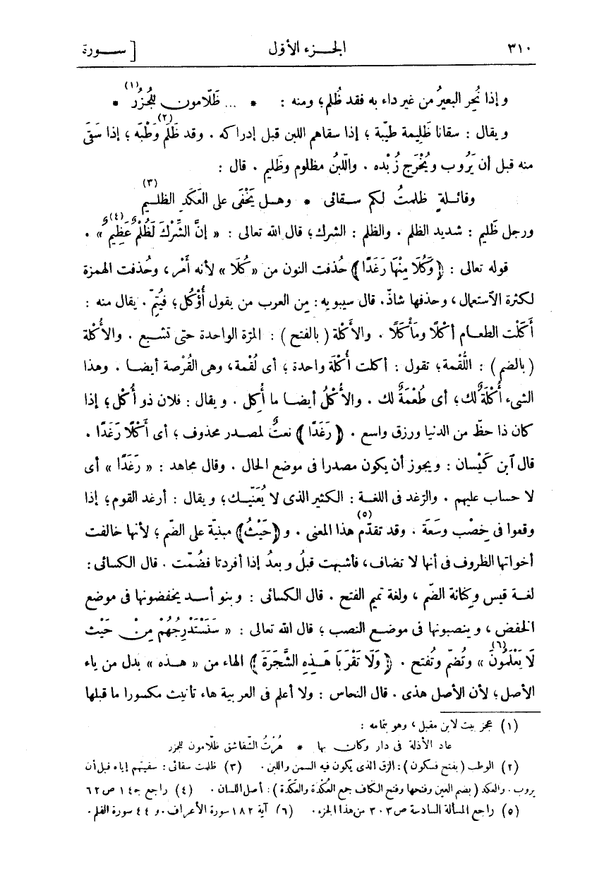 وَرَجُلٌ ظَلِيمٌ: شَدِيدُ الظُّلْمِ. وَالظُّلْمُ: الشِّرْكُ، قَالَ اللَّهُ تَعَالَى:" إِنَّ الشِّرْكَ لَظُلْمٌ عَظِيمٌ" «٤» [لقمان: ١٣]. قَوْلُهُ تَعَالَى: (وَكُلا مِنْها رَغَداً) حُذِفَتِ النُّونُ مِنْ (كُلا) لِأَنَّهُ أَمْرٌ وَحُذِفَتِ الْهَمْزَةُ لِكَثْرَةِ الِاسْتِعْمَالِ وَحَذْفُهَا شَاذٌّ. قَالَ سِيبَوَيْهِ: مِنَ الْعَرَبِ من يقول أوكل، فَيُتِمُّ. يُقَالُ مِنْهُ: أَكَلْتُ الطَّعَامَ أَكْلًا وَمَأْكَلًا. وَالْأَكْلَةُ (بِالْفَتْحِ): الْمَرَّةُ الْوَاحِدَةُ حَتَّى تَشْبَعَ. وَالْأُكْلَةُ (بِالضَّمِّ): اللُّقْمَةُ تَقُولُ: أَكَلْتُ أُكْلَةً وَاحِدَةً، أَيْ لُقْمَةً وَهِيَ الْقُرْصَةُ أَيْضًا. وَهَذَا الشَّيْءُ أُكْلَةٌ لَكَ أَيْ طُعْمَةٌ لَكَ. وَالْأَكْلُ أَيْضًا مَا أُكِلَ. وَيُقَالُ: فُلَانٌ ذُو أُكُلٍ إِذَا كَانَ ذَا حَظٍّ مِنَ الدُّنْيَا وَرِزْقٍ وَاسِعٍ. (رَغَداً) نَعْتٌ لِمَصْدَرٍ مَحْذُوفٍ أَيْ أَكْلًا رَغَدًا. قَالَ ابْنُ كَيْسَانَ: وَيَجُوزُ أَنْ يَكُونَ مَصْدَرًا فِي مَوْضِعِ الْحَالِ. وَقَالَ مُجَاهِدٌ: (رَغَداً) أَيْ لَا حِسَابَ عَلَيْهِمْ. وَالرَّغَدُ فِي اللُّغَةِ: الْكَثِيرُ الَّذِي لَا يَعْنِيكَ وَيُقَالُ: أَرْغَدَ الْقَوْمُ إِذَا وَقَعُوا فِي خِصْبٍ وَسَعَةٍ. وَقَدْ تَقَدَّمَ «٥» هَذَا الْمَعْنَى. و (حَيْثُ) مَبْنِيَّةٌ عَلَى الضَّمِّ لِأَنَّهَا خَالَفَتْ أَخَوَاتِهَا الظُّرُوفَ فِي أَنَّهَا لَا تُضَافُ فَأَشْبَهَتْ قَبْلُ وَبَعْدُ إِذَا أُفْرِدَتَا فَضُمَّتْ. قَالَ الْكِسَائِيُّ: لُغَةُ قَيْسَ وَكِنَانَةَ الضَّمُّ وَلُغَةُ تَمِيمٍ الْفَتْحُ. قَالَ الْكِسَائِيُّ: وَبَنُو أَسَدٍ يَخْفِضُونَهَا فِي مَوْضِعِ الْخَفْضِ وَيَنْصِبُونَهَا فِي مَوْضِعِ النَّصْبِ قَالَ اللَّهُ تَعَالَى: سَنَسْتَدْرِجُهُمْ مِنْ حَيْثُ لَا يَعْلَمُونَ «٦» وَتُضَمُّ وَتُفْتَحُ. (وَلا تَقْرَبا هذِهِ الشَّجَرَةَ) الْهَاءُ مِنْ (هَذِهِ) بَدَلٌ مِنْ يَاءِ الْأَصْلِ لِأَنَّ الْأَصْلَ هَذِي. قَالَ النَّحَّاسُ: وَلَا أَعْلَمُ فِي الْعَرَبِيَّةِ هَاءَ تأنيث مكسورا ما قبلها