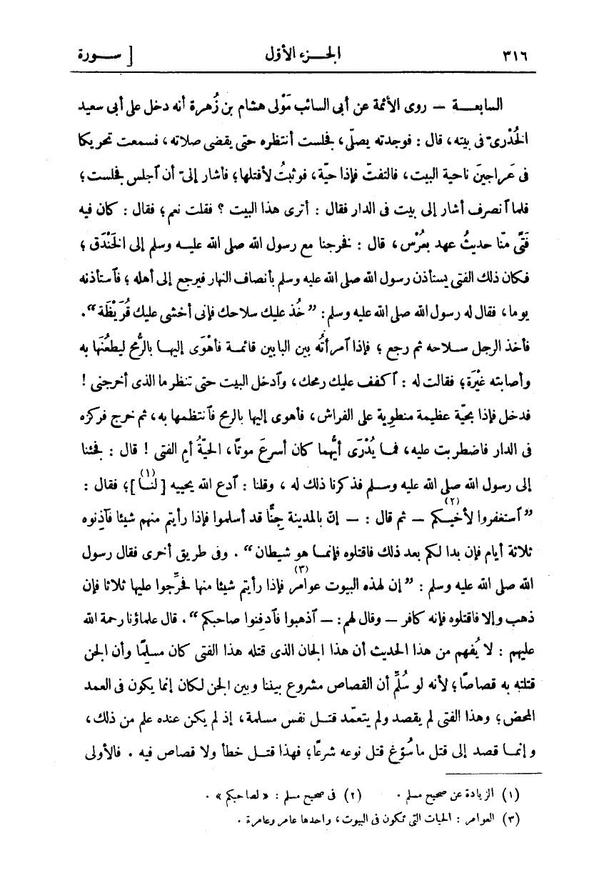 السَّابِعَةُ: رَوَى الْأَئِمَّةُ عَنْ أَبِي السَّائِبِ مَوْلَى هِشَامِ بْنِ زُهْرَةَ أَنَّهُ دَخَلَ عَلَى أَبِي سَعِيدٍ الْخُدْرِيِّ فِي بَيْتِهِ، قَالَ: فَوَجَدْتُهُ يُصَلِّي، فَجَلَسْتُ أَنْتَظِرُهُ حَتَّى يَقْضِيَ صَلَاتَهُ، فَسَمِعْتُ تَحْرِيكًا فِي عَرَاجِينِ نَاحِيَةِ الْبَيْتِ، فَالْتَفَتُّ فَإِذَا حَيَّةٌ، فَوَثَبْتُ لِأَقْتُلَهَا، فَأَشَارَ إِلَيَّ أَنِ اجْلِسْ فَجَلَسْتُ، فَلَمَّا انْصَرَفَ أَشَارَ إِلَى بَيْتٍ فِي الدَّارِ فَقَالَ: أَتَرَى هَذَا الْبَيْتَ؟ فَقُلْتُ نَعَمْ، فَقَالَ: كَانَ فِيهِ فَتًى مِنَّا حَدِيثَ عَهْدٍ بِعُرْسٍ، قَالَ: فَخَرَجْنَا مَعَ رَسُولِ اللَّهِ صَلَّى اللَّهُ عَلَيْهِ وَسَلَّمَ إِلَى الْخَنْدَقِ، فَكَانَ ذَلِكَ الْفَتَى يَسْتَأْذِنُ رَسُولَ اللَّهِ صَلَّى اللَّهُ عَلَيْهِ وَسَلَّمَ بِأَنْصَافِ النَّهَارِ فَيَرْجِعُ إِلَى أَهْلِهِ، فَاسْتَأْذَنَهُ يَوْمًا، فَقَالَ لَهُ رَسُولُ اللَّهِ صَلَّى اللَّهُ عَلَيْهِ وَسَلَّمَ (خُذْ عَلَيْكَ سِلَاحَكَ فَإِنِّي أَخْشَى عَلَيْكَ قُرَيْظَةَ). فَأَخَذَ الرَّجُلُ سِلَاحَهُ ثُمَّ رَجَعَ، فَإِذَا امْرَأَتُهُ بَيْنَ الْبَابَيْنِ قَائِمَةً فَأَهْوَى إِلَيْهَا بِالرُّمْحِ لِيَطْعَنَهَا بِهِ وَأَصَابَتْهُ غَيْرَةٌ، فَقَالَتْ لَهُ: اكْفُفْ عَلَيْكَ رُمْحَكَ، وَادْخُلِ الْبَيْتَ حَتَّى تَنْظُرَ مَا الَّذِي أَخْرَجَنِي! فَدَخَلَ فَإِذَا بِحَيَّةٍ عَظِيمَةٍ مُنْطَوِيَةٍ عَلَى الْفِرَاشِ، فَأَهْوَى إِلَيْهَا بِالرُّمْحِ فَانْتَظَمَهَا بِهِ، ثُمَّ خَرَجَ فَرَكَّزَهُ فِي الدَّارِ فَاضْطَرَبَتْ عَلَيْهِ، فَمَا يُدْرَى أَيُّهُمَا كَانَ أَسْرَعُ مَوْتًا، الْحَيَّةُ أَمِ الْفَتَى! قَالَ: فَجِئْنَا إِلَى رَسُولِ اللَّهِ صَلَّى اللَّهُ عَلَيْهِ وَسَلَّمَ فَذَكَرْنَا ذَلِكَ لَهُ، وَقُلْنَا: ادْعُ اللَّهَ يُحْيِيهِ [لَنَا «١»]، فَقَالَ: اسْتَغْفِرُوا لِأَخِيكُمْ «٢» ثُمَّ قَالَ:- إِنَّ بِالْمَدِينَةِ جِنًّا قَدْ أَسْلَمُوا فَإِذَا رَأَيْتُمْ مِنْهُمْ شَيْئًا فَآذِنُوهُ ثَلَاثَةَ أَيَامٍ فَإِنْ بَدَا لَكُمْ بَعْدَ ذَلِكَ فَاقْتُلُوهُ فَإِنَّمَا هُوَ شَيْطَانٌ (. وَفِي طَرِيقٍ أُخْرَى فَقَالَ رَسُولُ اللَّهِ صَلَّى اللَّهُ عَلَيْهِ وَسَلَّمَ:) إن لِهَذِهِ الْبُيُوتِ عَوَامِرَ «٣» فَإِذَا رَأَيْتُمْ شَيْئًا مِنْهَا فَحَرِّجُوا عَلَيْهَا ثَلَاثًا فَإِنْ ذَهَبَ وَإِلَّا فَاقْتُلُوهُ فَإِنَّهُ كَافِرٌ- وَقَالَ لَهُمْ:- اذْهَبُوا فَادْفِنُوا صَاحِبَكُمْ (. قَالَ عُلَمَاؤُنَا رَحْمَةُ اللَّهِ عَلَيْهِمْ: لَا يُفْهَمُ مِنْ هَذَا الْحَدِيثِ أَنَّ هَذَا الْجَانَّ الَّذِي قَتَلَهُ هَذَا الْفَتَى كَانَ مُسْلِمًا وَأَنَّ الْجِنَّ قَتَلَتْهُ بِهِ قِصَاصًا، لِأَنَّهُ لَوْ سُلِّمَ أَنَّ الْقِصَاصَ مَشْرُوعٌ بَيْنَنَا وَبَيْنَ الْجِنِّ لَكَانَ إِنَّمَا يَكُونُ فِي الْعَمْدِ الْمَحْضِ، وَهَذَا الْفَتَى لَمْ يَقْصِدْ وَلَمْ يَتَعَمَّدْ قَتْلَ نَفْسٍ مُسْلِمَةٍ، إِذْ لَمْ يَكُنْ عِنْدَهُ عِلْمٌ مِنْ ذَلِكَ، وَإِنَّمَا قَصَدَ إِلَى قَتْلِ مَا سُوِّغَ قَتْلُ نَوْعِهِ شَرْعًا، فَهَذَا قَتْلُ خَطَأٍ وَلَا قِصَاصَ فِيهِ. فالأولى