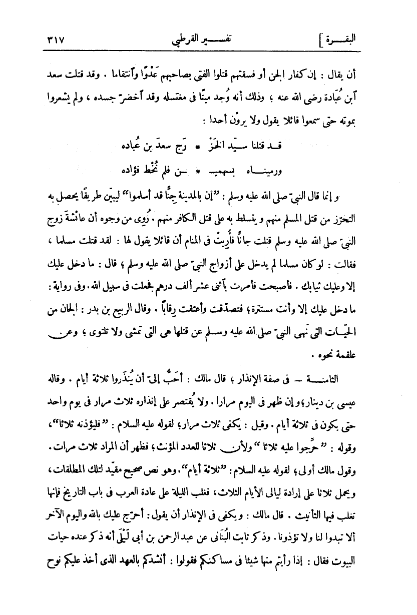 وَإِنَّمَا قَالَ النَّبِيُّ صَلَّى اللَّهُ عَلَيْهِ وَسَلَّمَ: (إِنَّ بِالْمَدِينَةِ جِنًّا قَدْ أَسْلَمُوا) لِيُبَيِّنَ طَرِيقًا يَحْصُلُ بِهِ التَّحَرُّزُ مِنْ قَتْلِ الْمُسْلِمِ مِنْهُمْ وَيَتَسَلَّطُ بِهِ عَلَى قَتْلِ الْكَافِرِ مِنْهُمْ. رُوِيَ مِنْ وُجُوهٍ أَنَّ عَائِشَةَ زَوْجَ النَّبِيِّ صَلَّى اللَّهُ عَلَيْهِ وَسَلَّمَ قَتَلَتْ جَانًّا فَأُرِيَتْ فِي الْمَنَامِ أَنَّ قَائِلًا يَقُولُ لَهَا: لَقَدْ قَتَلْتِ مُسْلِمًا، فَقَالَتْ: لَوْ كَانَ مُسْلِمًا لَمْ يَدْخُلْ عَلَى أَزْوَاجِ النَّبِيِّ صَلَّى اللَّهُ عَلَيْهِ وَسَلَّمَ، قَالَ: مَا دَخَلَ عَلَيْكِ إِلَّا وَعَلَيْكِ ثِيَابُكِ. فَأَصْبَحَتْ فَأَمَرَتْ بِاثْنَيْ عَشَرَ أَلْفَ دِرْهَمٍ فَجُعِلَتْ فِي سَبِيلِ اللَّهِ. وَفِي رِوَايَةٍ: مَا دَخَلَ عَلَيْكِ إِلَّا وَأَنْتِ مُسْتَتِرَةٌ، فَتَصَدَّقَتْ وَأَعْتَقَتْ رِقَابًا. وَقَالَ الرَّبِيعُ بْنُ بَدْرٍ: الْجَانُّ مِنَ الْحَيَّاتِ الَّتِي نَهَى النَّبِيُّ صَلَّى اللَّهُ عَلَيْهِ وَسَلَّمَ عَنْ قَتْلِهَا هِيَ الَّتِي تَمْشِي وَلَا تَلْتَوِي، وَعَنْ عَلْقَمَةَ نَحْوُهُ. الثَّامِنَةُ- فِي صِفَةِ الْإِنْذَارِ، قَالَ مَالِكٌ: أُحِبُّ إِلَيَّ أَنْ يُنْذَرُوا ثَلَاثَةَ أَيَّامٍ. وَقَالَهُ عِيسَى بْنُ دِينَارٍ، وَإِنْ ظَهَرَ فِي الْيَوْمِ مِرَارًا. وَلَا يُقْتَصَرُ عَلَى إِنْذَارِهِ ثَلَاثَ مِرَارٍ فِي يَوْمٍ وَاحِدٍ حَتَّى يَكُونَ فِي ثَلَاثَةِ أَيَّامٍ. وَقِيلَ: يَكْفِي ثَلَاثَ مِرَارٍ، لِقَوْلِهِ عَلَيْهِ السَّلَامُ: (فَلْيُؤْذِنْهُ ثَلَاثًا)، وَقَوْلِهِ: (حَرِّجُوا عَلَيْهِ ثَلَاثًا) وَلِأَنَّ ثَلَاثًا لِلْعَدَدِ الْمُؤَنَّثِ، فَظَهَرَ أَنَّ الْمُرَادَ ثَلَاثَ مَرَّاتٍ. وَقَوْلُ مَالِكٍ أَوْلَى، لِقَوْلِهِ عَلَيْهِ السَّلَامُ: (ثَلَاثَةَ أَيَّامٍ). وَهُوَ نَصٌّ صَحِيحٌ مُقَيِّدٌ لِتِلْكَ الْمُطْلَقَاتِ، وَيُحْمَلُ ثَلَاثًا عَلَى إِرَادَةِ لَيَالِي الْأَيَّامِ الثَّلَاثِ، فَغَلَّبَ اللَّيْلَةَ عَلَى عَادَةِ الْعَرَبِ فِي بَابِ التَّارِيخِ فَإِنَّهَا تُغَلِّبُ فِيهَا التَّأْنِيثَ. قَالَ مَالِكٌ: وَيَكْفِي فِي الْإِنْذَارِ أَنْ يَقُولَ: أُحَرِّجُ عَلَيْكِ بِاللَّهِ وَالْيَوْمِ الْآخِرِ أَلَّا تَبْدُوا لَنَا وَلَا تُؤْذُونَا. وَذَكَرَ ثَابِتٌ الْبُنَانِيُّ عَنْ عَبْدِ الرَّحْمَنِ بْنِ أَبِي لَيْلَى أَنَّهُ ذُكِرَ عِنْدَهُ حَيَّاتُ الْبُيُوتِ فَقَالَ: إِذَا رَأَيْتُمْ مِنْهَا شَيْئًا فِي مَسَاكِنِكُمْ فَقُولُوا: أَنْشُدُكُمْ بِالْعَهْدِ الَّذِي أَخَذَ عَلَيْكُمْ نوح