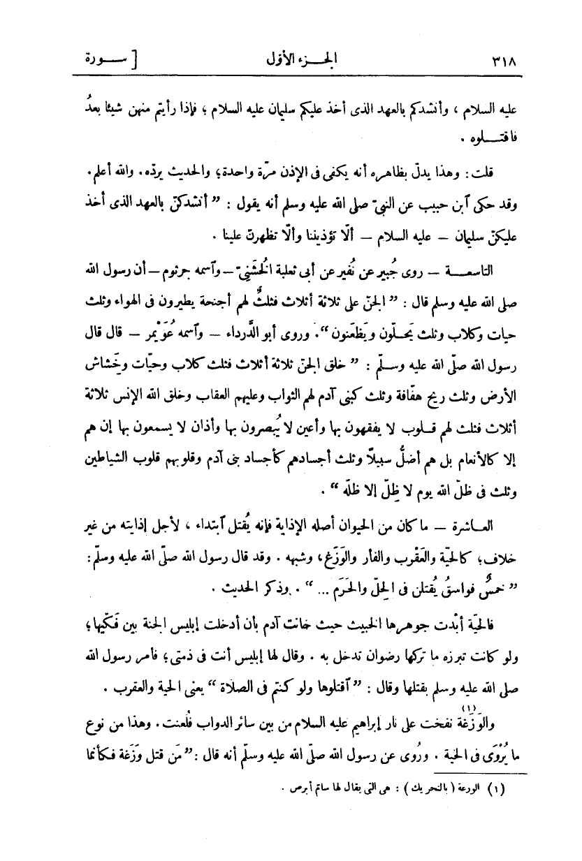 عَلَيْهِ السَّلَامُ، وَأَنْشُدُكُمْ بِالْعَهْدِ الَّذِي أَخَذَ عَلَيْكُمْ سُلَيْمَانُ عَلَيْهِ السَّلَامُ، فَإِذَا رَأَيْتُمْ مِنْهُنَّ شَيْئًا بَعْدُ فَاقْتُلُوهُ. قُلْتُ: وَهَذَا يَدُلُّ بِظَاهِرِهِ أَنَّهُ يَكْفِي فِي الْإِذْنِ مَرَّةً وَاحِدَةً، وَالْحَدِيثُ يَرُدُّهُ. وَاللَّهُ أَعْلَمُ. وَقَدْ حَكَى ابْنُ حَبِيبٍ عَنِ النَّبِيِّ صَلَّى اللَّهُ عَلَيْهِ وَسَلَّمَ أَنَّهُ يَقُولُ: (أَنْشُدُكُنَّ بِالْعَهْدِ الَّذِي أَخَذَ عَلَيْكُنَّ سُلَيْمَانُ- عَلَيْهِ السَّلَامُ- أَلَّا تُؤْذِينَنَا وَأَلَّا تَظْهَرْنَ عَلَيْنَا). التَّاسِعَةُ- روى جبير عن نُفَيْرٍ عَنْ أَبِي ثَعْلَبَةَ الْخُشَنِيِّ- وَاسْمُهُ جُرْثُومٌ- أن رسول الله صَلَّى اللَّهُ عَلَيْهِ وَسَلَّمَ قَالَ: (الْجِنُّ عَلَى ثَلَاثَةِ أَثْلَاثٍ فَثُلُثٌ لَهُمْ أَجْنِحَةٌ يَطِيرُونَ فِي الْهَوَاءِ وَثُلُثٌ حَيَّاتٌ وَكِلَابٌ وَثُلُثٌ يَحُلُّونَ وَيَظْعَنُونَ). وَرَوَى أَبُو الدَّرْدَاءِ- وَاسْمُهُ عُوَيْمِرٌ- قَالَ قَالَ رَسُولُ اللَّهِ صَلَّى اللَّهُ عَلَيْهِ وَسَلَّمَ: (خُلِقَ الْجِنُّ ثَلَاثَةَ أَثْلَاثٍ فَثُلُثٌ كِلَابٌ وَحَيَّاتٌ وَخَشَاشُ الْأَرْضِ وَثُلُثٌ رِيحٌ هَفَّافَةٌ وَثُلُثٌ كَبَنِي آدَمَ لَهُمُ الثَّوَابُ وَعَلَيْهِمُ الْعِقَابُ وَخَلَقَ اللَّهُ الْإِنْسَ ثَلَاثَةَ أَثْلَاثٍ فَثُلُثٌ لَهُمْ قُلُوبٌ لَا يَفْقَهُونَ بِهَا وَأَعْيُنٌ لَا يُبْصِرُونَ بِهَا وَآذَانٌ لَا يَسْمَعُونَ بِهَا إِنْ هُمْ إِلَّا كَالْأَنْعَامِ بَلْ هُمْ أَضَلُّ سَبِيلًا وَثُلُثٌ أَجْسَادُهُمْ كَأَجْسَادِ بَنِي آدَمَ وَقُلُوبُهُمْ قُلُوبُ الشَّيَاطِينِ وَثُلُثٌ فِي ظِلِّ اللَّهِ يَوْمَ لَا ظِلَّ إِلَّا ظِلُّهُ (. الْعَاشِرَةُ- مَا كَانَ مِنَ الْحَيَوَانِ أَصْلُهُ الْإِذَايَةُ فَإِنَّهُ يُقْتَلُ ابْتِدَاءً، لِأَجْلِ إِذَايَتِهِ مِنْ غَيْرِ خِلَافٍ، كَالْحَيَّةِ وَالْعَقْرَبِ وَالْفَأْرِ وَالْوَزَغِ، وَشَبَهِهِ. وَقَدْ قَالَ رَسُولُ اللَّهِ صَلَّى اللَّهُ عَلَيْهِ وَسَلَّمَ: (خَمْسٌ فَوَاسِقُ يُقْتَلْنَ فِي الْحِلِّ وَالْحَرَمِ ... ). وَذَكَرَ الْحَدِيثَ. فَالْحَيَّةُ أَبْدَتْ جَوْهَرَهَا الْخَبِيثَ حَيْثُ خَانَتْ آدَمَ بِأَنْ أَدْخَلَتْ إِبْلِيسَ الْجَنَّةَ بَيْنَ فَكَّيْهَا، وَلَوْ كَانَتْ تُبْرِزُهُ مَا تَرَكَهَا رَضْوَانُ تَدْخُلُ بِهِ. وَقَالَ لَهَا إِبْلِيسُ أَنْتِ فِي ذِمَّتِي، فَأَمَرَ رَسُولُ اللَّهِ صَلَّى اللَّهُ عَلَيْهِ وَسَلَّمَ بِقَتْلِهَا وَقَالَ: (اقْتُلُوهَا وَلَوْ كُنْتُمْ فِي الصَّلَاةِ) يَعْنِي الْحَيَّةَ وَالْعَقْرَبَ. وَالْوَزَغَةُ «١» نَفَخَتْ عَلَى نَارِ إِبْرَاهِيمَ عَلَيْهِ السَّلَامُ مِنْ بَيْنِ سَائِرِ الدَّوَابِّ فَلُعِنَتْ. وَهَذَا مِنْ نَوْعِ مَا يُرْوَى فِي الْحَيَّةِ. وَرُوِيَ عَنْ رَسُولِ اللَّهِ صَلَّى اللَّهُ عَلَيْهِ وَسَلَّمَ أنه قال: من قتل وزغة فكأنما