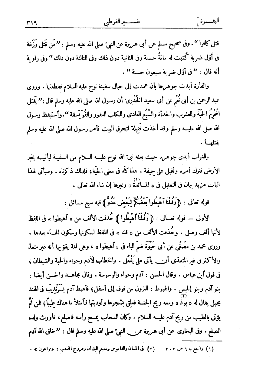 قَتَلَ كَافِرًا. وَفِي صَحِيحِ مُسْلِمٍ عَنْ أَبِي هُرَيْرَةَ عَنِ النَّبِيِّ صَلَّى اللَّهُ عَلَيْهِ وَسَلَّمَ: مَنْ قَتَلَ وَزَغَةً فِي أَوَّلِ ضَرْبَةٍ كُتِبَتْ لَهُ مِائَةُ حَسَنَةٍ وَفِي الثَّانِيَةِ دُونَ ذَلِكَ وفي الثالثة دون ذلك. وفي رواية أَنَّهُ قَالَ: (فِي أَوَّلِ ضَرْبَةٍ سَبْعُونَ حَسَنَةٍ). وَالْفَأْرَةُ أَبْدَتْ جَوْهَرَهَا بِأَنْ عَمَدَتْ إِلَى حِبَالِ سَفِينَةِ نُوحٍ عَلَيْهِ السَّلَامُ فَقَطَعَتْهَا. وَرَوَى عَبْدُ الرحمن بن أبي نعم عَنْ أَبِي سَعِيدٍ الْخُدْرِيِّ أَنَّ رَسُولَ اللَّهِ صَلَّى اللَّهُ عَلَيْهِ وَسَلَّمَ قَالَ: (يَقْتُلُ الْمُحْرِمُ الْحَيَّةَ وَالْعَقْرَبَ وَالْحِدَأَةَ وَالسَّبُعَ الْعَادِيَّ وَالْكَلْبَ الْعَقُورَ وَالْفُوَيْسِقَةَ). وَاسْتَيْقَظَ رَسُولُ اللَّهِ صَلَّى اللَّهُ عَلَيْهِ وَسَلَّمَ وَقَدْ أَخَذَتْ فَتِيلَةً لِتَحْرُقَ الْبَيْتَ فَأَمَرَ رَسُولُ اللَّهِ صَلَّى اللَّهُ عَلَيْهِ وَسَلَّمَ بِقَتْلِهَا. وَالْغُرَابُ أَبْدَى جَوْهَرَهُ حَيْثُ بَعَثَهُ نَبِيُّ اللَّهِ نُوحٌ عَلَيْهِ السَّلَامُ مِنَ السَّفِينَةِ لِيَأْتِيَهُ بِخَبَرِ الْأَرْضِ فَتَرَكَ أَمْرَهُ وَأَقْبَلَ عَلَى جِيفَةٍ. هَذَا كُلُّهُ فِي مَعْنَى الْحَيَّةِ، فَلِذَلِكَ ذَكَرْنَاهُ. وَسَيَأْتِي لِهَذَا الْبَابِ مَزِيدُ بَيَانٍ فِي التَّعْلِيلِ فِي" الْمَائِدَةِ" «١» وَغَيْرِهَا إِنْ شَاءَ اللَّهُ تَعَالَى. قَوْلُهُ تَعَالَى: (وَقُلْنَا اهْبِطُوا بَعْضُكُمْ لِبَعْضٍ عَدُوٌّ) فِيهِ سَبْعُ مَسَائِلَ: الْأُولَى- قَوْلُهُ تَعَالَى" وَقُلْنَا اهْبِطُوا" حُذِفَتِ الْأَلِفُ مِنَ" اهْبِطُوا" فِي اللَّفْظِ لِأَنَّهَا أَلِفُ وَصْلٍ. وَحُذِفَتِ الْأَلِفُ مِنْ" قُلْنَا" فِي اللَّفْظِ لِسُكُونِهَا وَسُكُونِ الْهَاءِ بَعْدَهَا. وَرَوَى مُحَمَّدُ بْنُ مُصَفَّى عَنْ أَبِي حَيْوَةَ ضَمَّ الْبَاءِ فِي" اهْبِطُوا"، وَهِيَ لُغَةٌ يُقَوِّيهَا أَنَّهُ غَيْرُ مُتَعَدٍّ وَالْأَكْثَرُ فِي غَيْرِ الْمُتَعَدِّي أَنْ يَأْتِيَ عَلَى يَفْعُلَ. وَالْخِطَابُ لِآدَمَ وَحَوَّاءَ وَالْحَيَّةِ وَالشَّيْطَانِ، فِي قَوْلِ ابْنِ عَبَّاسٍ. وَقَالَ الْحَسَنُ: آدَمُ وَحَوَّاءُ وَالْوَسْوَسَةُ. وَقَالَ مُجَاهِدٌ وَالْحَسَنُ أَيْضًا: بَنُو آدَمَ وَبَنُو إِبْلِيسَ. وَالْهُبُوطُ: النُّزُولُ مِنْ فَوْقٍ إِلَى أَسْفَلَ، فَأُهْبِطَ آدَمُ بِسَرَنْدِيبَ فِي الْهِنْدِ بجبل يقال له" بوذا" «٢» وَمَعَهُ رِيحُ الْجَنَّةِ فَعَلِقَ بِشَجَرِهَا وَأَوْدِيَتِهَا فَامْتَلَأَ مَا هُنَاكَ طِيبًا، فَمِنْ ثَمَّ يُؤْتَى بِالطِّيبِ مِنْ رِيحِ آدَمَ عَلَيْهِ السَّلَامُ. وَكَانَ السَّحَابُ يَمْسَحُ رَأْسَهُ فَأَصْلَعَ، فَأَوْرَثَ وَلَدَهُ الصَّلَعَ. وَفِي الْبُخَارِيِّ عَنْ أَبِي هُرَيْرَةَ عَنِ النَّبِيِّ صَلَّى اللَّهُ عَلَيْهِ وَسَلَّمَ قَالَ: (خَلَقَ اللَّهُ آدَمَ