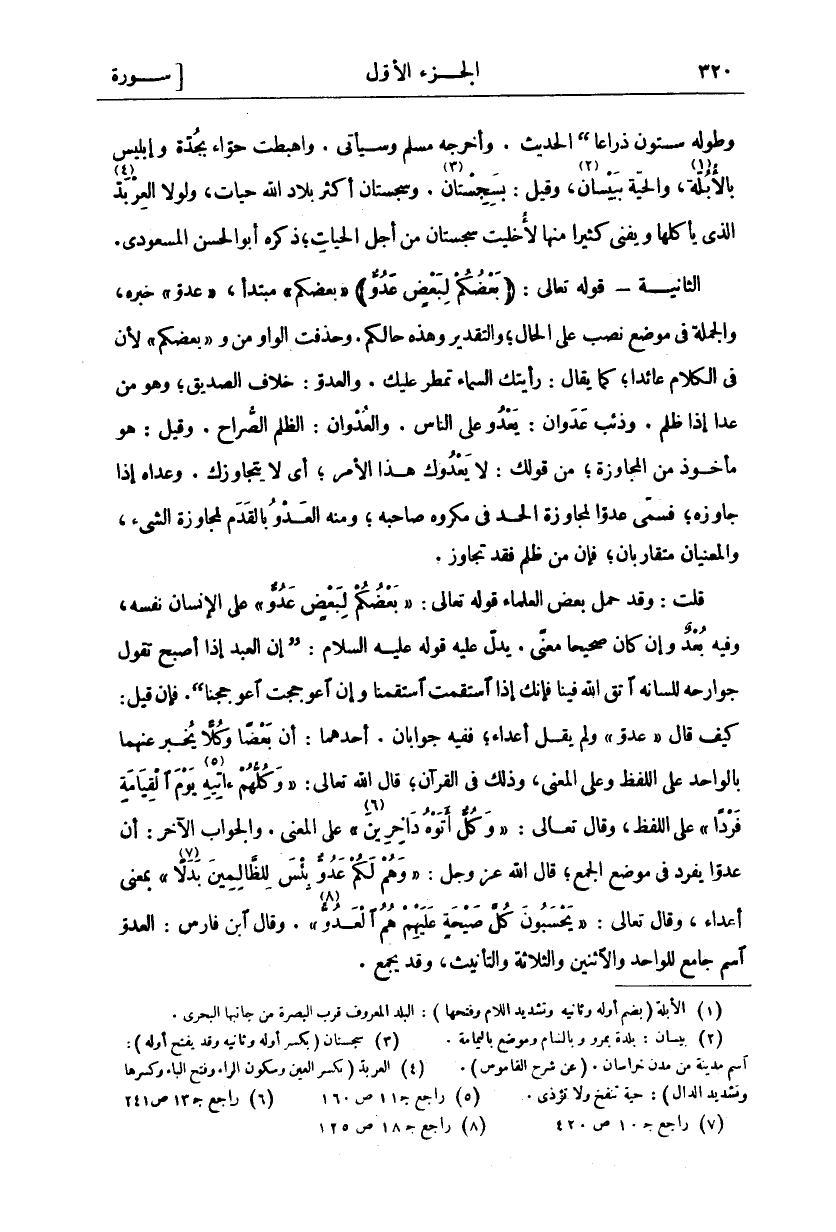 وَطُولُهُ سِتُّونَ ذِرَاعًا) الْحَدِيثَ وَأَخْرَجَهُ مُسْلِمٌ وَسَيَأْتِي. وَأُهْبِطَتْ حَوَّاءُ بِجَدَّةَ وَإِبْلِيسُ بِالْأُبُلَّةَ «١»، وَالْحَيَّةُ بِبَيْسَانَ «٢»، وَقِيلَ: بِسِجِسْتَانَ «٣». وَسِجِسْتَانَ أَكْثَرُ بِلَادِ اللَّهِ حَيَّاتٍ، وَلَوْلَا الْعِرْبَدُّ «٤» الَّذِي يَأْكُلُهَا وَيُفْنِي كَثِيرًا مِنْهَا لَأُخْلِيَتْ سِجِسْتَانُ مِنْ أَجْلِ الْحَيَّاتِ، ذَكَرَهُ أَبُو الْحَسَنِ الْمَسْعُودِيُّ. الثَّانِيَةُ- قَوْلُهُ تَعَالَى" بَعْضُكُمْ لِبَعْضٍ عَدُوٌّ" ... " بَعْضُكُمْ" مُبْتَدَأٌ،" عَدُوٌّ" خَبَرُهُ وَالْجُمْلَةُ فِي مَوْضِعِ نَصْبٍ عَلَى الْحَالِ، وَالتَّقْدِيرُ وَهَذِهِ حَالُكُمْ. وحذفت الواو من و" بَعْضُكُمْ" لِأَنَّ فِي الْكَلَامِ عَائِدًا، كَمَا يُقَالُ: رَأَيْتُكَ السَّمَاءُ تُمْطِرُ عَلَيْكَ. وَالْعَدُوُّ: خِلَافُ الصَّدِيقِ، وَهُوَ من عدا إذا ظلم. وذيب عَدْوَانُ: يَعْدُو عَلَى النَّاسِ. وَالْعُدْوَانُ: الظُّلْمُ الصُّرَاحُ. وَقِيلَ: هُوَ مَأْخُوذٌ مِنَ الْمُجَاوَزَةِ، مِنْ قَوْلِكَ: لَا يَعْدُوكَ هَذَا الْأَمْرُ، أَيْ لَا يَتَجَاوَزُكَ. وَعَدَاهُ إِذَا جَاوَزَهُ، فَسُمِّيَ عَدُوًّا لِمُجَاوَزَةِ الْحَدِّ فِي مَكْرُوهِ صَاحِبِهِ، وَمِنْهُ الْعَدْوُ بِالْقَدَمِ لِمُجَاوَزَةِ الشَّيْءِ، وَالْمَعْنَيَانِ مُتَقَارِبَانِ، فَإِنَّ مَنْ ظَلَمَ فَقَدْ تَجَاوَزَ. قُلْتُ: وَقَدْ حَمَلَ بَعْضُ الْعُلَمَاءِ قَوْلَهُ تعالى:" بَعْضُكُمْ لِبَعْضٍ عَدُوٌّ" [البقرة: ٣٦] عَلَى الْإِنْسَانِ نَفْسِهِ، وَفِيهِ بُعْدٌ وَإِنْ كَانَ صَحِيحًا مَعْنًى. يَدُلُّ عَلَيْهِ قَوْلُهُ عَلَيْهِ السَّلَامُ: (إِنَّ الْعَبْدَ إِذَا أَصْبَحَ تَقُولُ جَوَارِحُهُ لِلِسَانِهِ اتَّقِ اللَّهَ فِينَا فَإِنَّكَ إِذَا اسْتَقَمْتَ اسْتَقَمْنَا وَإِنِ اعْوَجَجْتَ اعْوَجَجْنَا (. فَإِنْ قِيلَ: كَيْفَ قَالَ" عَدُوٌّ" وَلَمْ يَقُلْ أَعْدَاءٌ، فَفِيهِ جَوَابَانِ أَحَدُهُمَا: أَنَّ بَعْضًا وَكُلًّا يُخْبَرُ عَنْهُمَا بِالْوَاحِدِ عَلَى اللَّفْظِ وَعَلَى الْمَعْنَى، وَذَلِكَ فِي الْقُرْآنِ، قَالَ اللَّهُ تَعَالَى:" وَكُلُّهُمْ آتِيهِ «٥» يَوْمَ الْقِيامَةِ فَرْداً" [مريم: ٩٥] عَلَى اللَّفْظِ، وَقَالَ تَعَالَى:" وَكُلٌّ أَتَوْهُ داخِرِينَ" «٦» [النمل: ٨٧] عَلَى الْمَعْنَى. وَالْجَوَابُ الْآخَرُ: أَنَّ عَدُوًّا يُفْرَدُ فِي مَوْضِعِ الْجَمْعِ، قَالَ اللَّهُ عَزَّ وَجَلَّ:" وَهُمْ لَكُمْ عَدُوٌّ بِئْسَ لِلظَّالِمِينَ بَدَلًا" «٧» [الكهف: ٥٠] بِمَعْنَى أَعْدَاءٍ، وَقَالَ تَعَالَى:" يَحْسَبُونَ كُلَّ صَيْحَةٍ عَلَيْهِمْ هُمُ الْعَدُوُّ" «٨» [المنافقون: ٤]. وَقَالَ ابْنُ فَارِسٍ: الْعَدُوُّ اسْمٌ جَامِعٌ لِلْوَاحِدِ والاثنين والثلاثة والتأنيث، وقد يجمع.