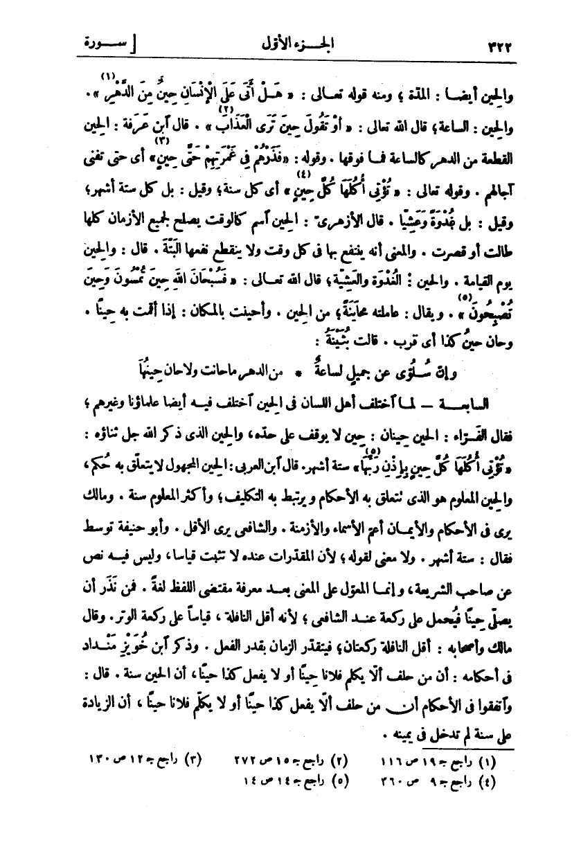 وَالْحُيْنُ أَيْضًا: الْمُدَّةُ وَمِنْهُ قَوْلُهُ تَعَالَى:" هَلْ أَتى عَلَى الْإِنْسانِ حِينٌ مِنَ الدَّهْرِ" «١» [الإنسان: ١] وَالْحِينُ: السَّاعَةُ قَالَ اللَّهُ تَعَالَى:" أَوْ تَقُولَ حِينَ تَرَى الْعَذابَ" «٢» [الزم ٥٨] قَالَ ابْنُ عَرَفَةَ: الْحِينُ الْقِطْعَةُ مِنَ الدَّهْرِ كَالسَّاعَةِ فَمَا فَوْقَهَا. وَقَوْلُهُ" فَذَرْهُمْ فِي غَمْرَتِهِمْ حَتَّى حِينٍ «٣» " [المؤمنون: ٥٤] أي حتى تفنى آجالهم وقول تعالى" تُؤْتِي أُكُلَها كُلَّ حِينٍ" «٤» [إبراهيم: ٢٥] أَيْ كُلَّ سَنَةٍ وَقِيلَ: بَلْ كُلَّ سِتَّةِ أَشْهُرٍ وَقِيلَ: بَلْ غُدْوَةً وَعَشِيًّا قَالَ الْأَزْهَرِيُّ: الْحِينُ اسْمٌ كَالْوَقْتِ يَصْلُحُ لِجَمِيعِ الْأَزْمَانِ كُلِّهَا طَالَتْ أَوْ قَصُرَتْ. وَالْمَعْنَى أَنَّهُ يُنْتَفَعُ بِهَا فِي كُلِّ وَقْتٍ وَلَا يَنْقَطِعُ نَفْعُهَا الْبَتَّةَ. قَالَ: وَالْحِينُ يَوْمُ الْقِيَامَةِ. وَالْحِينُ: الْغُدْوَةُ وَالْعَشِيَّةُ قَالَ اللَّهُ تَعَالَى" فَسُبْحانَ اللَّهِ حِينَ تُمْسُونَ وَحِينَ تُصْبِحُونَ" «٥» [الروم: ١٧] وَيُقَالُ: عَامَلْتُهُ مُحَايَنَةً مِنَ الْحِينِ وَأَحْيَنْتُ بِالْمَكَانِ إِذَا أَقَمْتُ بِهِ حِينًا. وَحَانَ حِينَ كَذَا أَيْ قَرُبَ. قَالَتْ بُثَيْنَةُ: