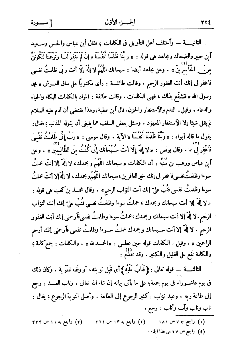 الثَّانِيَةُ- وَاخْتَلَفَ أَهْلُ التَّأْوِيلِ فِي الْكَلِمَاتِ فَقَالَ ابن عباس والحسن وسعيد ابن جُبَيْرٍ وَالضَّحَّاكُ وَمُجَاهِدٌ هِيَ قَوْلُهُ" رَبَّنا ظَلَمْنا أَنْفُسَنا وَإِنْ لَمْ تَغْفِرْ لَنا وَتَرْحَمْنا لَنَكُونَنَّ مِنَ الْخاسِرِينَ «١» " [الأعراف: ٢٣]. وَعَنْ مُجَاهِدٍ أَيْضًا: سُبْحَانَكَ اللَّهُمَّ لَا إِلَهَ إِلَّا أَنْتَ رَبِّي ظَلَمْتُ نَفْسِي فَاغْفِرْ لِي إِنَّكَ أَنْتَ الْغَفُورُ الرَّحِيمُ. وَقَالَتْ طَائِفَةٌ: رَأَى مَكْتُوبًا عَلَى سَاقِ الْعَرْشِ" مُحَمَّدٌ رَسُولُ اللَّهِ" فَتَشَفَّعَ بِذَلِكَ فَهِيَ الْكَلِمَاتُ وَقَالَتْ طَائِفَةٌ: الْمُرَادُ بِالْكَلِمَاتِ الْبُكَاءُ وَالْحَيَاءُ وَالدُّعَاءُ. وَقِيلَ النَّدَمُ وَالِاسْتِغْفَارُ وَالْحُزْنُ قَالَ ابْنُ عَطِيَّةَ: وَهَذَا يَقْتَضِي أَنَّ آدم عليه السلام لم يقل شيا إلا الاستغفار المعهود. وسيل بَعْضُ السَّلَفِ عَمَّا يَنْبَغِي أَنْ يَقُولَهُ الْمُذْنِبُ فَقَالَ: يَقُولُ مَا قَالَهُ أَبَوَاهُ:" رَبَّنا ظَلَمْنا أَنْفُسَنا" الْآيَةَ وَقَالَ مُوسَى" رَبِّ إِنِّي ظَلَمْتُ نَفْسِي فَاغْفِرْ لِي" «٢» [القصص: ١٦] وَقَالَ يُونُسُ" لَا إِلهَ إِلَّا أَنْتَ سُبْحانَكَ إِنِّي كُنْتُ مِنَ الظَّالِمِينَ" «٣» [الأنبياء: ٨٧]. وَعَنِ ابْنِ عَبَّاسٍ وَوَهْبِ بْنِ مُنَبِّهٍ: أَنَّ الْكَلِمَاتِ" سُبْحَانَكَ اللَّهُمَّ وَبِحَمْدِكَ لَا إِلَهَ إِلَّا أَنْتَ عملت سوءا وظلمت نفسي فاغفر لِي إِنَّكَ خَيْرُ الْغَافِرِينَ سُبْحَانَكَ اللَّهُمَّ وَبِحَمْدِكَ لَا إِلَهَ إِلَّا أَنْتَ عَمِلْتُ سُوءًا وَظَلَمْتُ نَفْسِي فَتُبْ عَلَيَّ إِنَّكَ أَنْتَ التَّوَّابُ الرَّحِيمُ" وَقَالَ مُحَمَّدُ بْنُ كَعْبٍ هِيَ قَوْلُهُ" لَا إِلَهَ إِلَّا أَنْتَ سُبْحَانَكَ وَبِحَمْدِكَ عَمِلْتُ سُوءًا وَظَلَمْتُ نَفْسِي فَتُبْ عَلَيَّ إِنَّكَ أَنْتَ التَّوَّابُ الرَّحِيمُ. لَا إِلَهَ إِلَّا أَنْتَ سُبْحَانَكَ وَبِحَمْدِكَ عَمِلْتُ سُوءًا وَظَلَمْتُ نَفْسِي فَارْحَمْنِي إِنَّكَ أَنْتَ الْغَفُورُ الرَّحِيمُ. لَا إِلَهَ إِلَّا أَنْتَ سُبْحَانَكَ وَبِحَمْدِكَ عَمِلْتُ سُوءًا وَظَلَمْتُ نَفْسِي فَارْحَمْنِي إِنَّكَ أَرْحَمُ الرَّاحِمِينَ" وَقِيلَ: الْكَلِمَاتُ قَوْلُهُ حِينَ عَطَسَ:" الْحَمْدُ لِلَّهِ". وَالْكَلِمَاتُ جَمْعُ كَلِمَةٍ وَالْكَلِمَةُ تَقَعُ عَلَى الْقَلِيلِ وَالْكَثِيرِ. وَقَدْ تَقَدَّمَ «٤». الثَّالِثَةُ- قَوْلُهُ تَعَالَى: (فَتابَ عَلَيْهِ) أَيْ قَبِلَ تَوْبَتَهُ، أَوْ وَفَّقَهُ لِلتَّوْبَةِ. وَكَانَ ذَلِكَ فِي يَوْمِ عَاشُورَاءَ فِي يَوْمِ جُمُعَةٍ عَلَى مَا يَأْتِي بَيَانُهُ إِنْ شَاءَ اللَّهُ تَعَالَى. وَتَابَ الْعَبْدُ: رَجَعَ إِلَى طَاعَةِ رَبِّهِ وَعَبْدٌ تَوَّابٌ: كَثِيرُ الرُّجُوعِ إِلَى الطَّاعَةِ وَأَصْلُ التَّوْبَةِ الرُّجُوعُ يُقَالُ: تَابَ وثاب وآب وأناب: رجع.