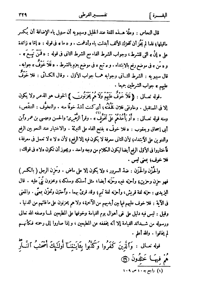قَالَ النَّحَّاسُ: وَعِلَّةُ هَذِهِ اللُّغَةِ عِنْدَ الْخَلِيلِ وَسِيبَوَيْهِ أَنَّ سَبِيلَ يَاءِ الْإِضَافَةِ أَنْ يُكْسَرَ مَا قَبْلَهَا فَلَمَّا لَمْ يَجُزْ أَنْ تَتَحَرَّكَ الْأَلِفُ أُبْدِلَتْ يَاءً وَأُدْغِمَتْ وَ" مَا" فِي قَوْلِهِ" إِمَّا" زَائِدَةٌ عَلَى" إِنْ" الَّتِي لِلشَّرْطِ وَجَوَابُ الشَّرْطِ الْفَاءُ مَعَ الشَّرْطِ الثَّانِي فِي قَوْلِهِ" فَمَنْ تَبِعَ". وَ" مَنْ" فِي مَوْضِعِ رَفْعٍ بِالِابْتِدَاءِ وَ" تَبِعَ" فِي مَوْضِعِ جَزْمٍ بِالشَّرْطِ." فَلا خَوْفٌ" جَوَابُهُ. قَالَ سِيبَوَيْهِ: الشَّرْطُ الثَّانِي وَجَوَابُهُ هُمَا جَوَابُ الْأَوَّلِ. وَقَالَ الْكِسَائِيُّ:" فَلا خَوْفٌ عَلَيْهِمْ" جَوَابُ الشَّرْطَيْنِ جَمِيعًا. قَوْلُهُ تَعَالَى: (فَلا خَوْفٌ عَلَيْهِمْ وَلا هُمْ يَحْزَنُونَ) الْخَوْفُ هُوَ الذُّعْرُ وَلَا يَكُونُ إِلَّا فِي الْمُسْتَقْبَلِ. وَخَاوَفَنِي فُلَانٌ فَخُفْتُهُ أَيْ كُنْتُ أَشَدَّ خَوْفًا مِنْهُ وَالتَّخَوُّفُ: التَّنَقُّصُ وَمِنْهُ قَوْلُهُ تَعَالَى:" أَوْ يَأْخُذَهُمْ عَلى تَخَوُّفٍ" «١» [النحل: ٤٧]. وَقَرَأَ الزُّهْرِيُّ وَالْحَسَنُ وَعِيسَى بْنُ عُمَرَ وَابْنُ أَبِي إِسْحَاقَ وَيَعْقُوبُ:" فَلَا خَوْفَ" بِفَتْحِ الْفَاءِ عَلَى التَّبْرِئَةِ. وَالِاخْتِيَارُ عِنْدَ النَّحْوِيِّينَ الرَّفْعُ وَالتَّنْوِينُ عَلَى الِابْتِدَاءِ لِأَنَّ الثَّانِيَ مَعْرِفَةٌ لَا يَكُونُ فِيهِ إِلَّا الرَّفْعُ لِأَنَّ" لَا" لَا تَعْمَلُ فِي مَعْرِفَةٍ فَاخْتَارُوا فِي الْأَوَّلِ الرَّفْعَ أَيْضًا لِيَكُونَ الْكَلَامُ مِنْ وَجْهٍ وَاحِدٍ. وَيَجُوزُ أَنْ تكون" لا" في قولك: فَلَا خَوْفٌ بِمَعْنَى لَيْسَ. وَالْحُزْنُ وَالْحَزَنُ: ضِدُّ السُّرُورِ وَلَا يَكُونُ إِلَّا عَلَى مَاضٍ. وَحَزِنَ الرَّجُلُ (بِالْكَسْرِ) فَهُوَ حَزِنٌ وَحَزِينٌ وَأَحْزَنَهُ غَيْرُهُ وَحَزَنَهُ أَيْضًا مِثْلُ أَسْلَكَهُ وَسَلَكَهُ وَمَحْزُونٌ بُنِيَ عَلَيْهِ. قَالَ الْيَزِيدِيُّ: حَزَنَهُ لُغَةُ قُرَيْشٍ وَأَحْزَنَهُ لُغَةْ تَمِيمٍ وَقَدْ قُرِئَ بِهِمَا. وَاحْتَزَنَ وَتَحَزَّنَ بِمَعْنًى. وَالْمَعْنَى فِي الْآيَةِ: فَلَا خَوْفٌ عَلَيْهِمْ فِيمَا بَيْنَ أَيْدِيهِمْ مِنَ الْآخِرَةِ وَلَا هُمْ يَحْزَنُونَ عَلَى مَا فَاتَهُمْ مِنَ الدُّنْيَا. وَقِيلَ: لَيْسَ فِيهِ دَلِيلٌ عَلَى نَفْيِ أَهْوَالِ يَوْمِ الْقِيَامَةِ وَخَوْفِهَا عَلَى الْمُطِيعِينَ لِمَا وَصَفَهُ اللَّهُ تَعَالَى وَرَسُولُهُ مِنْ شَدَائِدِ الْقِيَامَةِ إِلَّا أَنَّهُ يُخَفِّفُهُ عَنِ الْمُطِيعِينَ وَإِذَا صَارُوا إِلَى رَحْمَتِهِ فكأنهم لم يخافوا. والله أعلم.