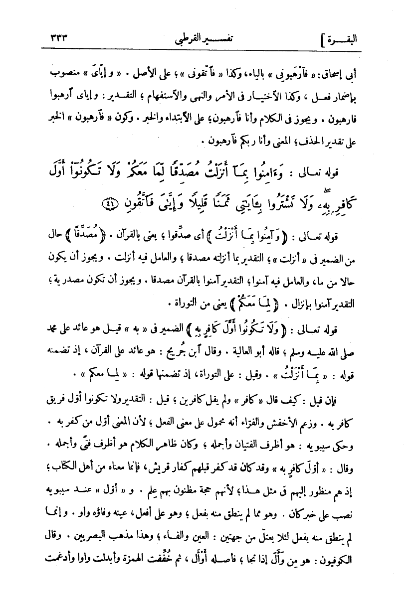 قَوْلُهُ تَعَالَى: (وَآمِنُوا بِما أَنْزَلْتُ) أَيْ صَدِّقُوا، يَعْنِي بِالْقُرْآنِ. (مُصَدِّقاً) حَالٌ مِنَ الضَّمِيرِ فِي" أَنْزَلْتُ"، التَّقْدِيرُ بِمَا أَنْزَلْتُهُ مُصَدِّقًا، وَالْعَامِلُ فِيهِ أَنْزَلْتُ. وَيَجُوزُ أَنْ يَكُونَ حَالًا مِنْ مَا وَالْعَامِلُ فِيهِ آمِنُوا التَّقْدِيرُ آمِنُوا بِالْقُرْآنِ مُصَدِّقًا. وَيَجُوزُ أَنْ تَكُونَ مَصْدَرِيَّةً التَّقْدِيرُ آمِنُوا بِإِنْزَالٍ. (لِما مَعَكُمْ) يَعْنِي مِنَ التَّوْرَاةِ. قَوْلُهُ تَعَالَى: (وَلا تَكُونُوا أَوَّلَ كافِرٍ بِهِ) الضَّمِيرُ فِي" بِهِ" قِيلَ هُوَ عَائِدٌ عَلَى مُحَمَّدٍ صَلَّى اللَّهُ عَلَيْهِ وَسَلَّمَ، قَالَهُ أَبُو الْعَالِيَةِ. وَقَالَ ابْنُ جُرَيْجٍ: هُوَ عَائِدٌ عَلَى الْقُرْآنِ إِذْ تَضَمَّنَهُ قَوْلُهُ:" بِما أَنْزَلْتُ". وَقِيلَ: عَلَى التَّوْرَاةِ، إِذْ تَضَمَّنَهَا قَوْلُهُ:" لِما مَعَكُمْ". فَإِنْ قِيلَ: كَيْفَ قَالَ" كافِرٍ" وَلَمْ يَقُلْ كَافِرِينَ قِيلَ: التَّقْدِيرُ وَلَا تَكُونُوا أَوَّلَ فَرِيقٍ كَافِرٍ بِهِ. وَزَعَمَ الْأَخْفَشُ وَالْفَرَّاءُ أَنَّهُ مَحْمُولٌ عَلَى مَعْنَى الْفِعْلِ لِأَنَّ الْمَعْنَى أَوَّلُ مَنْ كَفَرَ بِهِ. وَحَكَى سِيبَوَيْهِ هُوَ أَظْرَفُ الْفِتْيَانِ وَأَجْمَلُهُ وَكَانَ ظَاهِرُ الْكَلَامِ هُوَ أَظْرَفُ فَتًى وَأَجْمَلُهُ. وَقَالَ:" أَوَّلَ كافِرٍ بِهِ" وَقَدْ كَانَ قَدْ كَفَرَ قَبْلَهُمْ كُفَّارُ قُرَيْشٍ فَإِنَّمَا مَعْنَاهُ مِنْ أَهْلِ الْكِتَابِ إِذْ هُمْ مَنْظُورٌ إِلَيْهِمْ فِي مِثْلِ هَذَا لِأَنَّهُمْ حُجَّةٌ مَظْنُونٌ بِهِمْ عِلْمٌ. وَ" أَوَّلَ" عِنْدَ سِيبَوَيْهِ نُصِبَ عَلَى خَبَرِ كَانَ. وَهُوَ مِمَّا لَمْ يُنْطَقْ مِنْهُ بِفِعْلٍ وَهُوَ عَلَى أَفْعَلَ عَيْنُهُ وَفَاؤُهُ وَاوٌ. وَإِنَّمَا لَمْ يُنْطَقْ مِنْهُ بِفِعْلٍ لِئَلَّا يَعْتَلَّ مِنْ جِهَتَيْنِ: الْعَيْنِ وَالْفَاءِ وَهَذَا مَذْهَبُ الْبَصْرِيِّينَ. وَقَالَ الْكُوفِيُّونَ: هُوَ مِنْ وَأَلَ إِذَا نَجَا فَأَصْلُهُ أَوْأَلُ ثُمَّ خُفِّفَتِ الْهَمْزَةُ وَأُبْدِلَتْ وَاوًا وَأُدْغِمَتْ