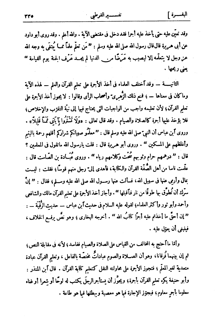 وَقَدْ تَعَيَّنَ عَلَيْهِ حَتَّى يَأْخُذَ عَلَيْهِ أَجْرًا فَقَدْ دَخَلَ فِي مُقْتَضَى الْآيَةِ. وَاللَّهُ أَعْلَمُ. وَقَدْ رَوَى أَبُو دَاوُدَ عَنْ أَبِي هُرَيْرَةَ قَالَ قَالَ رَسُولُ اللَّهِ صَلَّى اللَّهُ عَلَيْهِ وَسَلَّمَ (مَنْ تَعَلَّمَ عِلْمًا مِمَّا يُبْتَغَى بِهِ وَجْهُ اللَّهِ عَزَّ وَجَلَّ لَا يَتَعَلَّمُهُ إِلَّا لِيُصِيبَ بِهِ عَرَضًا مِنَ الدُّنْيَا لَمْ يَجِدْ عَرْفَ الْجَنَّةِ يَوْمَ الْقِيَامَةِ) يَعْنِي رِيحَهَا. الثَّانِيَةُ- وَقَدِ اخْتَلَفَ الْعُلَمَاءُ فِي أَخْذِ الْأُجْرَةِ عَلَى تَعْلِيمِ الْقُرْآنِ وَالْعِلْمِ- لِهَذِهِ الْآيَةِ وَمَا كَانَ فِي مَعْنَاهَا- فَمَنَعَ ذَلِكَ الزُّهْرِيُّ وَأَصْحَابُ الرَّأْيِ وَقَالُوا: لَا يَجُوزُ أَخْذُ الْأُجْرَةِ عَلَى تَعْلِيمِ الْقُرْآنِ لِأَنَّ تَعْلِيمَهُ وَاجِبٌ مِنَ الْوَاجِبَاتِ الَّتِي يُحْتَاجُ فِيهَا إِلَى نِيَّةِ التَّقَرُّبِ وَالْإِخْلَاصِ فَلَا يُؤْخَذُ عَلَيْهَا أُجْرَةٌ كَالصَّلَاةِ وَالصِّيَامِ. وَقَدْ قَالَ تَعَالَى:" وَلا تَشْتَرُوا بِآياتِي ثَمَناً قَلِيلًا". وَرَوَى ابْنُ عَبَّاسٍ أَنَّ النَّبِيَّ صَلَّى اللَّهُ عَلَيْهِ وَسَلَّمَ قَالَ: (مُعَلِّمُو صِبْيَانِكُمْ شِرَارُكُمْ أَقَلُّهُمْ رَحْمَةً باليتيم وأغلظهم على المسكين) روى أَبُو هُرَيْرَةَ قَالَ: قُلْتُ يَا رَسُولَ اللَّهِ مَا تَقُولُ فِي الْمُعَلِّمِينَ؟ قَالَ: (دِرْهَمُهُمْ حَرَامٌ وَثَوْبُهُمْ سُحْتٌ وَكَلَامُهُمْ رِيَاءٌ) وَرَوَى عُبَادَةُ بْنُ الصَّامِتِ قَالَ: عَلَّمْتُ نَاسًا مِنْ أَهْلِ الصُّفَّةِ الْقُرْآنَ وَالْكِتَابَةَ، فَأَهْدَى إِلَيَّ رَجُلٌ مِنْهُمْ قَوْسًا فَقُلْتُ: لَيْسَتْ بِمَالٍ وَأَرْمِي عَنْهَا فِي سَبِيلِ اللَّهِ فَسَأَلْتُ عَنْهَا رَسُولَ اللَّهِ صَلَّى اللَّهُ عَلَيْهِ وَسَلَّمَ فَقَالَ: (إِنْ سَرَّكَ أَنْ تُطَوَّقَ بِهَا طَوْقًا مِنْ نَارٍ فَاقْبَلْهَا). وَأَجَازَ أَخْذَ الْأُجْرَةِ عَلَى تَعْلِيمِ الْقُرْآنِ مَالِكٌ وَالشَّافِعِيُّ وَأَحْمَدُ وَأَبُو ثَوْرٍ وَأَكْثَرُ الْعُلَمَاءِ لِقَوْلِهِ عَلَيْهِ السَّلَامُ فِي حَدِيثِ ابْنِ عَبَّاسٍ- حَدِيثِ الرُّقْيَةِ-: (إِنَّ أَحَقَّ مَا أَخَذْتُمْ عَلَيْهِ أَجْرًا كِتَابُ اللَّهِ). أَخْرَجَهُ الْبُخَارِيُّ وَهُوَ نَصٌّ يَرْفَعُ الْخِلَافَ فَيَنْبَغِي أَنْ يُعَوَّلَ عَلَيْهِ. وَأَمَّا مَا احْتَجَّ بِهِ الْمُخَالِفُ مِنَ الْقِيَاسِ عَلَى الصَّلَاةِ وَالصِّيَامِ فَفَاسِدٌ لِأَنَّهُ فِي مُقَابَلَةِ النَّصِّ ثُمَّ إِنَّ بَيْنَهُمَا فُرْقَانًا وَهُوَ أَنَّ الصَّلَاةَ وَالصَّوْمَ عِبَادَاتٌ مُخْتَصَّةٌ بِالْفَاعِلِ وَتَعْلِيمُ الْقُرْآنِ عِبَادَةٌ مُتَعَدِّيَةٌ لِغَيْرِ الْمُعَلِّمِ فَتَجُوزُ الْأُجْرَةُ عَلَى مُحَاوَلَتِهِ النَّقْلَ كَتَعْلِيمِ كِتَابَةِ الْقُرْآنِ. قَالَ ابْنُ الْمُنْذِرِ: وَأَبُو حَنِيفَةَ يُكْرَهُ تَعْلِيمُ الْقُرْآنِ بِأُجْرَةٍ وَيَجُوزُ أَنْ يَسْتَأْجِرَ الرَّجُلَ يَكْتُبُ لَهُ لَوْحًا أَوْ شِعْرًا أَوْ غِنَاءً مَعْلُومًا بِأَجْرٍ مَعْلُومٍ فَيُجَوِّزُ الْإِجَارَةَ فِيمَا هُوَ مَعْصِيَةٌ وَيُبْطِلُهَا فِيمَا هُوَ طَاعَةٌ.
