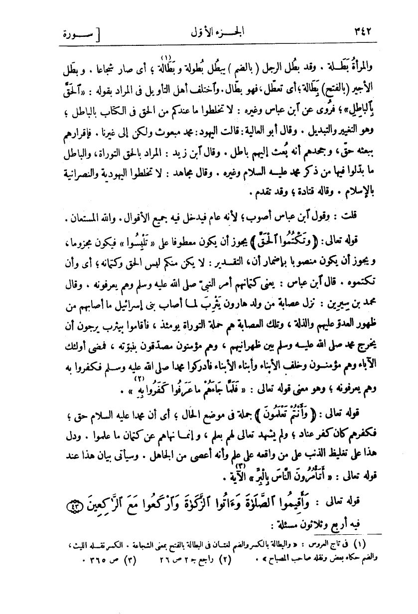 والمرأة بطله. وقد بطل الرجل (بِالضَّمِّ) يَبْطُلُ بُطُولَةً وَبَطَالَةً «١» أَيْ صَارَ شُجَاعًا وَبَطَلَ الْأَجِيرُ (بِالْفَتْحِ) بَطَالَةُ أَيْ تَعَطَّلَ فَهُوَ بَطَّالٌ وَاخْتَلَفَ أَهْلُ التَّأْوِيلِ فِي الْمُرَادِ بِقَوْلِهِ" الْحَقَّ بِالْباطِلِ" فَرُوِيَ عَنِ ابْنِ عَبَّاسٍ وَغَيْرِهِ لَا تَخْلِطُوا مَا عِنْدَكُمْ مِنَ الْحَقِّ فِي الْكِتَابِ بِالْبَاطِلِ وَهُوَ التَّغْيِيرُ وَالتَّبْدِيلُ. وَقَالَ أَبُو الْعَالِيَةِ قَالَتِ الْيَهُودُ مُحَمَّدٌ مَبْعُوثٌ وَلَكِنْ إِلَى غَيْرِنَا فَإِقْرَارُهُمْ بِبَعْثِهِ حَقٌّ وَجَحْدُهُمْ أَنَّهُ بُعِثَ إِلَيْهِمْ بَاطِلٌ وَقَالَ ابْنُ زَيْدٍ الْمُرَادُ بِالْحَقِّ التَّوْرَاةُ وَالْبَاطِلُ مَا بَدَّلُوا فِيهَا مِنْ ذِكْرِ مُحَمَّدٍ عَلَيْهِ السَّلَامُ وَغَيْرِهِ وَقَالَ مُجَاهِدٌ لَا تَخْلِطُوا الْيَهُودِيَّةَ وَالنَّصْرَانِيَّةَ بِالْإِسْلَامِ. وَقَالَهُ قَتَادَةُ وَقَدْ تَقَدَّمَ. قُلْتُ: وَقَوْلُ ابْنِ عَبَّاسٍ أَصْوَبُ لِأَنَّهُ عَامٌّ فَيَدْخُلُ فِيهِ جَمِيعُ الْأَقْوَالِ وَاللَّهُ الْمُسْتَعَانُ قَوْلُهُ تَعَالَى: (وَتَكْتُمُوا الْحَقَّ) يَجُوزُ أَنْ يَكُونَ مَعْطُوفًا عَلَى" تَلْبِسُوا" فَيَكُونَ مَجْزُومًا وَيَجُوزُ أَنْ يَكُونَ مَنْصُوبًا بِإِضْمَارِ أَنْ التَّقْدِيرُ لَا يَكُنْ مِنْكُمْ لَبْسُ الْحَقِّ وَكِتْمَانُهُ أَيْ وَأَنْ تَكْتُمُوهُ. قَالَ ابْنُ عَبَّاسٍ: يَعْنِي كِتْمَانَهُمْ أَمْرَ النَّبِيِّ صَلَّى اللَّهُ عَلَيْهِ وَسَلَّمَ وَهُمْ يَعْرِفُونَهُ. وَقَالَ مُحَمَّدُ بْنُ سِيرِينَ: نَزَلَ عِصَابَةٌ مِنْ وَلَدِ هَارُونَ يَثْرِبَ لَمَّا أَصَابَ بَنِي إِسْرَائِيلَ مَا أَصَابَهُمْ مِنْ ظُهُورِ الْعَدُوِّ عَلَيْهِمْ وَالذِّلَّةِ وَتِلْكَ الْعِصَابَةُ هُمْ حَمَلَةُ التَّوْرَاةِ يَوْمَئِذٍ فَأَقَامُوا بِيَثْرِبَ يَرْجُونَ أَنْ يَخْرُجَ مُحَمَّدٌ صَلَّى اللَّهُ عَلَيْهِ وَسَلَّمَ بَيْنَ ظَهْرَانَيْهِمْ وَهُمْ مُؤْمِنُونَ مُصَدِّقُونَ بِنُبُوَّتِهِ فَمَضَى أُولَئِكَ الْآبَاءُ وَهُمْ مُؤْمِنُونَ وَخَلَفَ الْأَبْنَاءُ وَأَبْنَاءُ الْأَبْنَاءِ فَأَدْرَكُوا مُحَمَّدًا صَلَّى اللَّهُ عَلَيْهِ وَسَلَّمَ فَكَفَرُوا بِهِ وَهُمْ يَعْرِفُونَهُ وَهُوَ مَعْنَى قَوْلِهِ تَعَالَى" فَلَمَّا جاءَهُمْ مَا عَرَفُوا كَفَرُوا بِهِ" «٢» [البقرة: ٨٩]. قَوْلُهُ تَعَالَى: (وَأَنْتُمْ تَعْلَمُونَ) جُمْلَةٌ فِي مَوْضِعِ الْحَالِ أَيْ أَنَّ مُحَمَّدًا عَلَيْهِ السَّلَامُ حَقٌّ فَكُفْرُهُمْ كَانَ كُفْرَ عِنَادٍ وَلَمْ يَشْهَدْ تَعَالَى لَهُمْ بِعِلْمٍ وَإِنَّمَا نَهَاهُمْ عَنْ كِتْمَانِ مَا عَلِمُوا. وَدَلَّ هَذَا عَلَى تَغْلِيظِ الذَّنْبِ عَلَى مَنْ وَاقَعَهُ عَلَى عِلْمٍ وَأَنَّهُ أَعْصَى مِنَ الْجَاهِلِ. وَسَيَأْتِي بَيَانُ هَذَا عِنْدَ قَوْلِهِ تَعَالَى" أَتَأْمُرُونَ النَّاسَ بِالْبِرِّ" «٣» [البقرة: ٤٤] الآية.