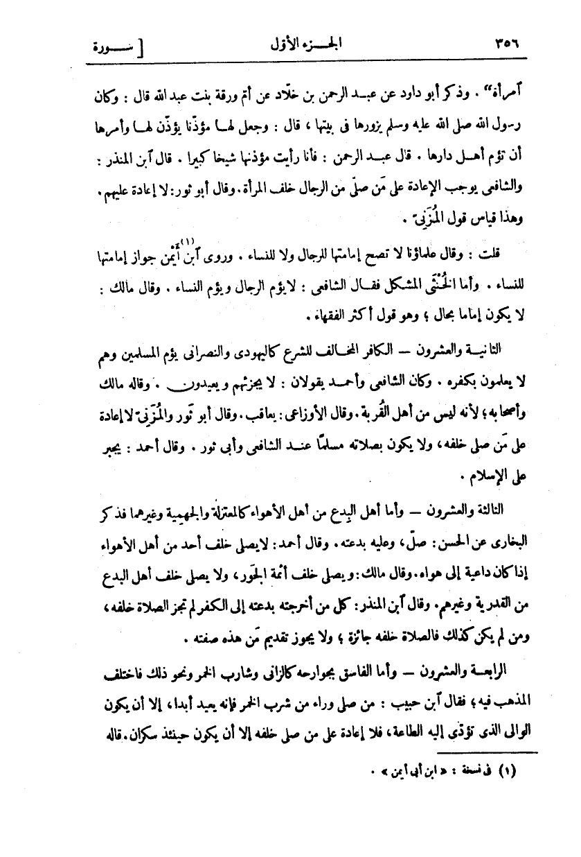 امْرَأَةً (. وَذَكَرَ أَبُو دَاوُدَ عَنْ عَبْدِ الرَّحْمَنِ بْنِ خَلَّادٍ عَنْ أُمِّ وَرَقَةَ بِنْتِ عَبْدِ اللَّهِ قَالَ: وَكَانَ رَسُولُ اللَّهِ صَلَّى اللَّهُ عَلَيْهِ وَسَلَّمَ يَزُورُهَا فِي بَيْتِهَا قَالَ وَجَعَلَ لَهَا مُؤَذِّنًا يُؤَذِّنُ لَهَا وَأَمَرَهَا أَنْ تَؤُمَّ أَهْلَ دَارِهَا قَالَ عَبْدُ الرَّحْمَنِ: فَأَنَا رَأَيْتُ مُؤَذِّنَهَا شَيْخًا كَبِيرًا. قَالَ ابْنُ الْمُنْذِرِ: وَالشَّافِعِيُّ يُوجِبُ الْإِعَادَةَ عَلَى مَنْ صَلَّى مِنَ الرِّجَالِ خَلْفَ الْمَرْأَةِ. وَقَالَ أَبُو ثَوْرٍ لَا إِعَادَةَ عَلَيْهِمْ. وَهَذَا قِيَاسُ قَوْلِ الْمُزَنِيِّ. قُلْتُ: وَقَالَ عُلَمَاؤُنَا لَا تَصِحُّ إِمَامَتُهَا لِلرِّجَالِ وَلَا لِلنِّسَاءِ. وَرَوَى ابْنُ «١» أَيْمَنَ جَوَازَ إِمَامَتِهَا لِلنِّسَاءِ. وَأَمَّا الْخُنْثَى الْمُشْكِلُ فَقَالَ الشَّافِعِيُّ: لَا يَؤُمُّ الرِّجَالَ وَيَؤُمُّ النِّسَاءَ. وَقَالَ مَالِكٌ: لَا يَكُونُ إِمَامًا بِحَالٍ، وَهُوَ قَوْلُ أَكْثَرِ الْفُقَهَاءِ. الثَّانِيَةُ وَالْعِشْرُونَ- الْكَافِرُ الْمُخَالِفُ لِلشَّرْعِ كَالْيَهُودِيِّ وَالنَّصْرَانِيِّ يَؤُمُّ الْمُسْلِمِينَ وَهُمْ لَا يَعْلَمُونَ بِكُفْرِهِ. وَكَانَ الشَّافِعِيُّ وَأَحْمَدُ يقولان لا يجزئهم ويعيدون وقاله مالك وأصحاب لِأَنَّهُ لَيْسَ مِنْ أَهْلِ الْقُرْبَةِ. وَقَالَ الْأَوْزَاعِيُّ: يُعَاقَبُ. وَقَالَ أَبُو ثَوْرٍ وَالْمُزَنِيُّ لَا إِعَادَةَ عَلَى مَنْ صَلَّى خَلْفَهُ وَلَا يَكُونُ بِصَلَاتِهِ مُسْلِمًا عِنْدَ الشَّافِعِيِّ وَأَبِي ثَوْرٍ. وَقَالَ أَحْمَدُ: يُجْبَرُ عَلَى الْإِسْلَامِ الثَّالِثَةُ وَالْعِشْرُونَ- وَأَمَّا أَهْلُ الْبِدَعِ مِنْ أَهْلِ الْأَهْوَاءِ كَالْمُعْتَزِلَةِ وَالْجَهْمِيَّةِ وَغَيْرِهِمَا فَذَكَرَ الْبُخَارِيُّ عَنِ الْحَسَنِ صَلِّ وَعَلَيْهِ بِدْعَتُهُ وَقَالَ أَحْمَدُ: لَا يُصَلَّى خَلْفَ أَحَدٍ مِنْ أَهْلِ الْأَهْوَاءِ إِذَا كَانَ دَاعِيَةً إِلَى هَوَاهُ وَقَالَ مَالِكٌ وَيُصَلَّى خَلْفَ أَئِمَّةِ الْجَوْرِ وَلَا يُصَلَّى خَلْفَ أَهْلِ الْبِدَعِ مِنَ الْقَدَرِيَّةِ وَغَيْرِهِمْ. وَقَالَ ابْنُ الْمُنْذِرِ كُلُّ مَنْ أَخْرَجَتْهُ بِدْعَتُهُ إِلَى الْكُفْرِ لَمْ تَجُزِ الصَّلَاةُ خَلْفَهُ وَمَنْ لَمْ يَكُنْ كَذَلِكَ فَالصَّلَاةُ خَلْفَهُ جَائِزَةٌ وَلَا يَجُوزُ تَقْدِيمُ مَنْ هَذِهِ صِفَتُهُ. الرَّابِعَةُ وَالْعِشْرُونَ- وَأَمَّا الْفَاسِقُ بِجَوَارِحِهِ كَالزَّانِي وَشَارِبِ الْخَمْرِ وَنَحْوِ ذَلِكَ فَاخْتَلَفَ الْمَذْهَبُ فِيهِ فَقَالَ ابْنُ حَبِيبٍ مَنْ صَلَّى وَرَاءَ مَنْ شَرِبَ الْخَمْرَ فَإِنَّهُ يُعِيدُ أَبَدًا إِلَّا أَنْ يَكُونَ الْوَالِي الَّذِي تُؤَدَّى إِلَيْهِ الطَّاعَةُ فَلَا إِعَادَةَ عَلَى مَنْ صَلَّى خَلْفَهُ إِلَّا أَنْ يَكُونَ حِينَئِذٍ سَكْرَانَ. قاله