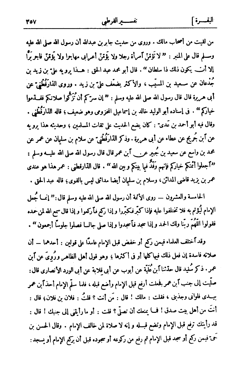مَنْ لَقِيتُ مِنْ أَصْحَابِ مَالِكٍ وَرُوِيَ مِنْ حَدِيثِ جَابِرِ بْنِ عَبْدِ اللَّهِ أَنَّ رَسُولَ اللَّهِ صَلَّى اللَّهُ عَلَيْهِ وَسَلَّمَ قَالَ عَلَى الْمِنْبَرِ (لَا تَؤُمَّنَّ امْرَأَةٌ رَجُلًا وَلَا يَؤُمَّنَّ أَعْرَابِيٌّ مُهَاجِرًا وَلَا يَؤُمَّنَّ فَاجِرٌ بَرًّا إِلَّا أَنْ يَكُونَ ذَلِكَ ذَا سُلْطَانٍ) قَالَ أَبُو مُحَمَّدٍ عَبْدُ الْحَقِّ هَذَا يَرْوِيهِ عَلِيُّ بْنُ زَيْدِ بْنِ جُدْعَانَ عَنْ سَعِيدِ بْنِ الْمُسَيَّبِ وَالْأَكْثَرُ يُضَعِّفُ عَلِيَّ بْنَ زَيْدٍ وَرَوَى الدَّارَقُطْنِيُّ عَنْ أَبِي هُرَيْرَةَ قَالَ قَالَ رَسُولُ اللَّهِ صَلَّى اللَّهُ عَلَيْهِ وَسَلَّمَ (إِنْ سَرَّكُمْ أَنْ تُزَكُّوا صَلَاتَكُمْ فَقَدِّمُوا خِيَارَكُمْ) فِي إِسْنَادِهِ أَبُو الْوَلِيدِ خَالِدُ بْنُ إِسْمَاعِيلَ الْمَخْزُومِيُّ وَهُوَ ضَعِيفٌ قال الدَّارَقُطْنِيُّ. وَقَالَ فِيهِ أَبُو أَحْمَدَ بْنُ عَدِيٍّ كَانَ يَضَعُ الْحَدِيثَ عَلَى ثِقَاتِ الْمُسْلِمِينَ وَحَدِيثُهُ هَذَا يَرْوِيهِ عَنِ ابْنِ جُرَيْجٍ عَنْ عَطَاءٍ عَنْ أَبِي هُرَيْرَةَ وَذَكَرَ الدَّارَقُطْنِيُّ عَنْ سَلَّامِ بْنِ سُلَيْمَانَ عَنْ عُمَرَ عَنْ مُحَمَّدِ بْنِ وَاسِعٍ عَنْ سَعِيدِ بْنِ جُبَيْرٍ عَنِ ابْنِ عُمَرَ قَالَ قَالَ رَسُولُ اللَّهِ صَلَّى اللَّهُ عَلَيْهِ وَسَلَّمَ: (اجْعَلُوا أَئِمَّتَكُمْ خِيَارَكُمْ فَإِنَّهُمْ وَفْدٌ فِيمَا بَيْنَكُمْ وَبَيْنَ اللَّهِ) قَالَ الدَّارَقُطْنِيُّ عُمَرُ هَذَا هُوَ عِنْدِي عُمَرُ بْنُ يَزِيدَ قَاضِي الْمَدَائِنِ وَسَلَّامُ بْنُ سُلَيْمَانَ أَيْضًا مَدَائِنِيٌّ لَيْسَ بِالْقَوِيِّ قَالَهُ عَبْدُ الْحَقِّ. الْخَامِسَةُ وَالْعِشْرُونَ- رَوَى الْأَئِمَّةُ أَنَّ رَسُولَ اللَّهِ صَلَّى اللَّهُ عَلَيْهِ وَسَلَّمَ قَالَ (إِنَّمَا جُعِلَ الْإِمَامُ لِيُؤْتَمَّ بِهِ فَلَا تَخْتَلِفُوا عَلَيْهِ فَإِذَا كَبَّرَ فَكَبِّرُوا وَإِذَا رَكَعَ فَارْكَعُوا وَإِذَا قَالَ سَمِعَ اللَّهُ لِمَنْ حَمِدَهُ فَقُولُوا اللَّهُمَّ رَبَّنَا وَلَكَ الْحَمْدُ وَإِذَا سَجَدَ فَاسْجُدُوا وَإِذَا صَلَّى جَالِسًا فَصَلُّوا جُلُوسًا أجمعون) وقد اختلف العلماء فيمن وكع أَوْ خَفَضَ قَبْلَ الْإِمَامِ عَامِدًا عَلَى قَوْلَيْنِ: أَحَدُهُمَا: أَنَّ صَلَاتَهُ فَاسِدَةٌ إِنْ فَعَلَ ذَلِكَ فِيهَا كُلِّهَا أَوْ فِي أَكْثَرِهَا وَهُوَ قَوْلُ أَهْلِ الظَّاهِرِ وَرُوِيَ عَنِ ابْنِ عُمَرَ. ذَكَرَ سُنَيْدٌ قَالَ: حَدَّثَنَا ابْنُ عُلَيَّةَ عَنْ أَيُّوبَ عَنْ أَبِي قِلَابَةَ عَنْ أَبِي الْوَرْدِ الْأَنْصَارِيِّ قَالَ صَلَّيْتُ إِلَى جَنْبِ ابْنِ عُمَرَ فَجَعَلْتُ أَرْفَعُ قَبْلَ الْإِمَامِ وَأَضَعُ قَبْلَهُ فَلَمَّا سَلَّمَ الامام أخذ ابن عمر بيدي فلو اني وجذبني فقلت مالك! قَالَ مَنْ أَنْتَ؟ قُلْتُ: فُلَانُ بْنُ فُلَانٍ قَالَ: أَنْتَ مِنْ أَهْلِ بَيْتِ صِدْقٍ! فَمَا يَمْنَعُكَ أَنْ تُصَلِّيَ؟ قُلْتُ: أَوَمَا رَأَيْتَنِي إِلَى جَنْبِكَ! قَالَ: قَدْ رَأَيْتُكَ تَرْفَعُ قَبْلَ الْإِمَامِ وَتَضَعُ قَبْلَهُ وَإِنَّهُ لَا صَلَاةَ لِمَنْ خَالَفَ الْإِمَامَ. وَقَالَ الْحَسَنُ بْنُ حَيٍّ فِيمَنْ رَكَعَ أَوْ سَجَدَ قَبْلَ الْإِمَامِ ثُمَّ رَفَعَ مِنْ رُكُوعِهِ أَوْ سُجُودِهِ قَبْلَ أَنْ يَرْكَعَ الْإِمَامُ أو يسجد: