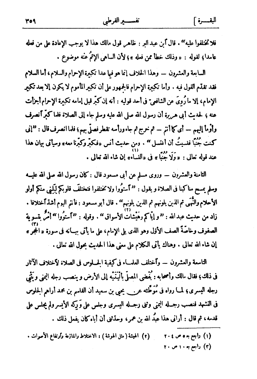 فَلَا تَخْتَلِفُوا عَلَيْهِ) قَالَ ابْنُ عَبْدِ الْبَرِّ: ظَاهِرُ قَوْلِ مَالِكٍ هَذَا لَا يُوجِبُ الْإِعَادَةَ على من فعله عامدا لقوله:" وذلك خطاء ممن فعله"، لان الساهي عَنْهُ مَوْضُوعٌ. السَّابِعَةُ وَالْعِشْرُونَ- وَهَذَا الْخِلَافُ إِنَّمَا هُوَ فِيمَا عَدَا تَكْبِيرَةَ الْإِحْرَامِ وَالسَّلَامَ أَمَّا السَّلَامُ فَقَدْ تَقَدَّمَ الْقَوْلُ فِيهِ. وَأَمَّا تَكْبِيرَةُ الْإِحْرَامِ فَالْجُمْهُورُ عَلَى أَنَّ تَكْبِيرَ الْمَأْمُومِ لَا يَكُونُ إِلَّا بَعْدَ تَكْبِيرِ الْإِمَامِ إِلَّا مَا رُوِيَ عَنِ الشَّافِعِيِّ فِي أَحَدِ قَوْلَيْهِ: أَنَّهُ إِنْ كَبَّرَ قَبْلَ إِمَامِهِ تَكْبِيرَةَ الْإِحْرَامِ أَجْزَأَتْ عَنْهُ لِحَدِيثِ أَبِي هُرَيْرَةَ أَنَّ رَسُولَ اللَّهِ صَلَّى اللَّهُ عَلَيْهِ وَسَلَّمَ جَاءَ إِلَى الصَّلَاةِ فَلَمَّا كَبَّرَ انْصَرَفَ وَأَوْمَأَ إِلَيْهِمْ- أَيْ كَمَا أَنْتُمْ- ثُمَّ خَرَجَ ثُمَّ جَاءَ وَرَأْسُهُ يَقْطُرُ فَصَلَّى بِهِمْ فَلَمَّا انْصَرَفَ قَالَ: (إِنِّي كُنْتُ جُنُبًا فَنَسِيتُ أَنْ أَغْتَسِلَ). وَمِنْ حَدِيثِ أَنَسٍ (فَكَبَّرَ وَكَبَّرْنَا مَعَهُ) وَسَيَأْتِي بَيَانُ هَذَا عِنْدَ قوله تعالى:" وَلا جُنُباً" في" النساء «١» " [النِّسَاءِ: ٤٣] إِنْ شَاءَ اللَّهُ تَعَالَى. الثَّامِنَةُ وَالْعِشْرُونَ- وَرَوَى مُسْلِمٌ عَنْ أَبِي مَسْعُودٍ قَالَ: كَانَ رَسُولُ اللَّهِ صَلَّى اللَّهُ عَلَيْهِ وَسَلَّمَ يَمْسَحُ مَنَاكِبَنَا فِي الصَّلَاةِ وَيَقُولُ (اسْتَوُوا وَلَا تَخْتَلِفُوا فَتَخْتَلِفَ قُلُوبُكُمْ لِيَلِنِي مِنْكُمْ أُولُو الْأَحْلَامِ وَالنُّهَى ثُمَّ الَّذِينَ يَلُونَهُمْ ثُمَّ الَّذِينَ يَلُونَهُمْ (. قَالَ أَبُو مَسْعُودٍ: فَأَنْتُمُ الْيَوْمَ أَشَدُّ اخْتِلَافًا. زَادَ مِنْ حَدِيثِ عَبْدِ اللَّهِ (وَإِيَّاكُمْ وَهَيْشَاتِ «٢» الْأَسْوَاقِ). وَقَوْلُهُ (اسْتَوُوا) أَمْرٌ بِتَسْوِيَةِ الصُّفُوفِ وَخَاصَّةً الصَّفَّ الْأَوَّلَ وَهُوَ الَّذِي يَلِي الْإِمَامَ عَلَى مَا يَأْتِي بَيَانُهُ فِي سُورَةِ" الْحِجْرِ «٣» " إِنْ شَاءَ اللَّهُ تَعَالَى. وَهُنَاكَ يَأْتِي الْكَلَامُ عَلَى مَعْنَى هَذَا الْحَدِيثِ بِحَوْلِ اللَّهِ تَعَالَى. التَّاسِعَةُ وَالْعِشْرُونَ- وَاخْتَلَفَ الْعُلَمَاءُ فِي كَيْفِيَّةِ الْجُلُوسِ فِي الصَّلَاةِ لِاخْتِلَافِ الْآثَارِ فِي ذَلِكَ فَقَالَ مَالِكٌ وَأَصْحَابُهُ: يُفْضِي الْمُصَلِّي بِأَلْيَتَيْهِ إِلَى الْأَرْضِ وَيَنْصِبُ رِجْلَهُ الْيُمْنَى وَيَثْنِي رِجْلَهُ الْيُسْرَى، لِمَا رَوَاهُ فِي مُوَطَّئِهِ عَنْ يَحْيَى بْنِ سَعِيدٍ أَنَّ الْقَاسِمَ بْنَ مُحَمَّدٍ أَرَاهُمُ الْجُلُوسَ فِي التَّشَهُّدِ فَنَصَبَ رِجْلَهُ الْيُمْنَى وَثَنَى رِجْلَهُ الْيُسْرَى وَجَلَسَ عَلَى وَرِكِهِ الْأَيْسَرِ وَلَمْ يَجْلِسْ عَلَى قَدَمِهِ، ثُمَّ قَالَ: أَرَانِي هَذَا عَبْدُ اللَّهِ بْنُ عُمَرَ وحدثني أن أباه كان يفعل ذلك.