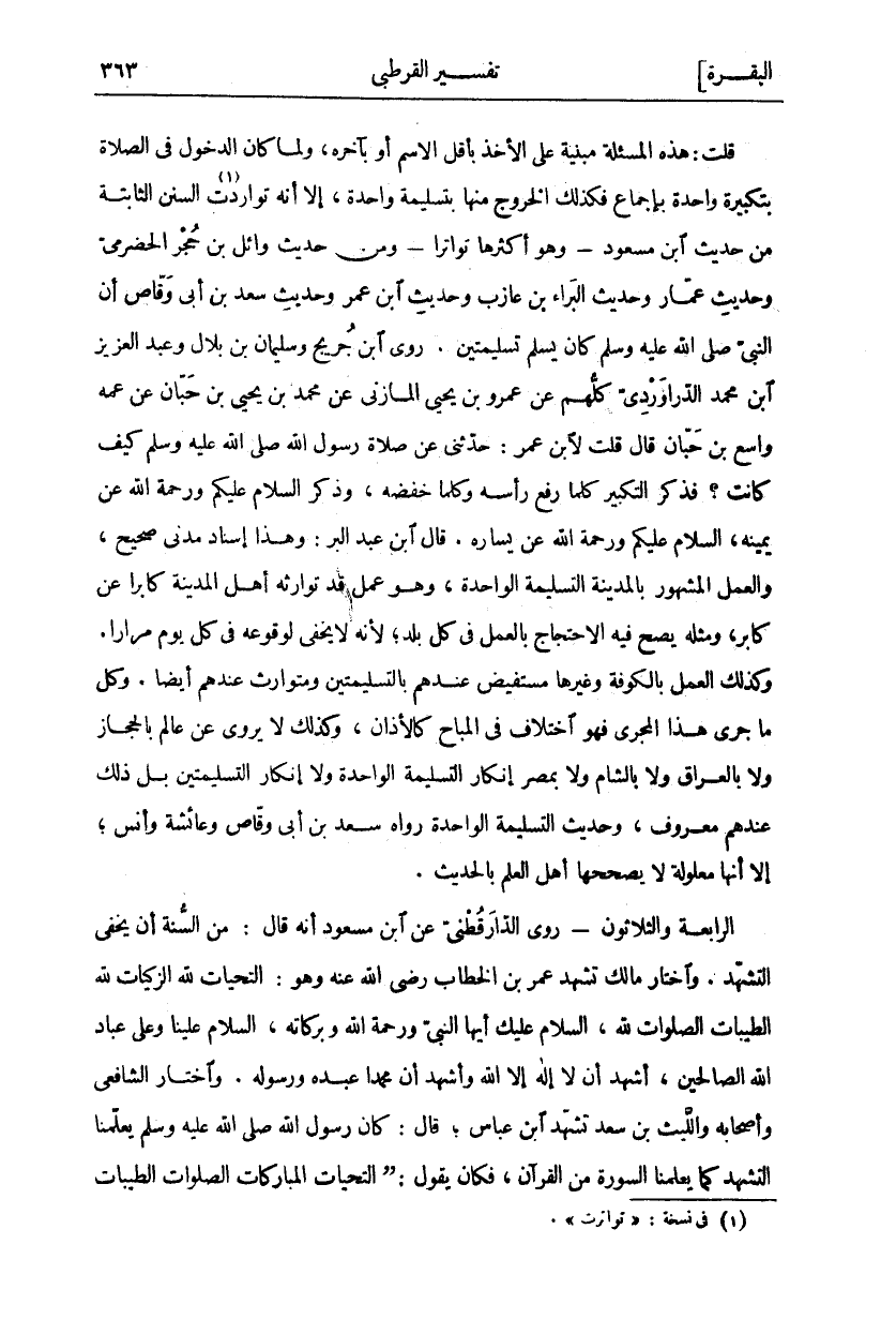قُلْتُ هَذِهِ الْمَسْأَلَةُ مَبْنِيَّةٌ عَلَى الْأَخْذِ بِأَقَلِّ الِاسْمِ أَوْ بِآخِرِهِ وَلَمَّا كَانَ الدُّخُولُ فِي الصَّلَاةِ بِتَكْبِيرَةٍ وَاحِدَةٍ بِإِجْمَاعٍ فَكَذَلِكَ الْخُرُوجُ مِنْهَا بِتَسْلِيمَةٍ وَاحِدَةٍ إِلَّا أَنَّهُ تَوَارَدَتِ «١» السُّنَنُ الثَّابِتَةُ مِنْ حَدِيثِ ابْنِ مَسْعُودٍ- وَهُوَ أَكْثَرُهَا تَوَاتُرًا- وَمِنْ حَدِيثِ وَائِلِ بْنِ حُجْرٍ الْحَضْرَمِيِّ وَحَدِيثِ عَمَّارٍ وَحَدِيثٍ الْبَرَاءِ بْنِ عَازِبٍ وَحَدِيثِ ابْنِ عُمَرَ وَحَدِيثِ سَعْدِ بْنِ أَبِي وَقَّاصٍ أَنَّ النَّبِيَّ صَلَّى اللَّهُ عَلَيْهِ وَسَلَّمَ كَانَ يُسَلِّمُ تَسْلِيمَتَيْنِ. رَوَى ابْنُ جُرَيْجٍ وَسُلَيْمَانُ بْنُ بِلَالٍ وعبد العزيز ابن مُحَمَّدٍ الدَّرَاوَرْدِيُّ كُلُّهُمْ عَنْ عَمْرِو بْنِ يَحْيَى الْمَازِنِيِّ عَنْ مُحَمَّدِ بْنِ يَحْيَى بْنِ حَبَّانَ عَنْ عَمِّهِ وَاسِعِ بْنِ حَبَّانَ قَالَ قُلْتُ لِابْنِ عُمَرَ: حَدِّثْنِي عَنْ صَلَاةِ رَسُولِ اللَّهِ صَلَّى اللَّهُ عَلَيْهِ وَسَلَّمَ كَيْفَ كَانَتْ؟ فَذَكَرَ التَّكْبِيرَ كُلَّمَا رَفَعَ رَأْسَهُ وَكُلَّمَا خَفَضَهُ وَذَكَرَ السَّلَامُ عَلَيْكُمْ وَرَحْمَةُ اللَّهِ عَنْ يَمِينِهِ، السَّلَامُ عَلَيْكُمْ وَرَحْمَةُ اللَّهِ عَنْ يَسَارِهِ. قَالَ ابْنُ عَبْدِ الْبَرِّ: وَهَذَا إِسْنَادٌ مَدَنِيٌّ صَحِيحٌ وَالْعَمَلُ الْمَشْهُورُ بِالْمَدِينَةِ التَّسْلِيمَةُ الْوَاحِدَةُ وَهُوَ عَمَلٌ قَدْ تَوَارَثَهُ أَهْلُ الْمَدِينَةِ كَابِرًا عَنْ كَابِرٍ وَمِثْلُهُ يَصِحُّ فِيهِ الِاحْتِجَاجُ بِالْعَمَلِ فِي كُلِّ بَلَدٍ لِأَنَّهُ لَا يَخْفَى لِوُقُوعِهِ فِي كُلِّ يَوْمٍ مِرَارًا. وَكَذَلِكَ الْعَمَلُ بِالْكُوفَةِ وَغَيْرِهَا مُسْتَفِيضٌ عِنْدَهُمْ بالتسليمتين ومتوارث عندهم أَيْضًا. وَكُلُّ مَا جَرَى هَذَا الْمَجْرَى فَهُوَ اخْتِلَافٌ فِي الْمُبَاحِ كَالْأَذَانِ وَكَذَلِكَ لَا يُرْوَى عَنْ عَالِمٍ بِالْحِجَازِ وَلَا بِالْعِرَاقِ وَلَا بِالشَّامِ وَلَا بِمِصْرَ إِنْكَارُ التَّسْلِيمَةِ الْوَاحِدَةِ وَلَا إِنْكَارُ التَّسْلِيمَتَيْنِ بَلْ ذَلِكَ عِنْدَهُمْ مَعْرُوفٌ وَحَدِيثُ التَّسْلِيمَةِ الْوَاحِدَةِ رَوَاهُ سَعْدُ بْنُ أَبِي وَقَّاصٍ وَعَائِشَةُ وَأَنَسٌ إِلَّا أَنَّهَا مَعْلُولَةٌ لَا يُصَحِّحُهَا أَهْلُ الْعِلْمِ بِالْحَدِيثِ. الرَّابِعَةُ وَالثَّلَاثُونَ- رَوَى الدَّارَقُطْنِيُّ عَنِ ابْنِ مَسْعُودٍ أَنَّهُ قَالَ: مِنَ السُّنَّةِ أَنْ يُخْفِيَ التَّشَهُّدَ. وَاخْتَارَ مَالِكٌ تَشَهُّدَ عُمَرَ بْنِ الْخَطَّابِ رَضِيَ اللَّهُ عَنْهُ وَهُوَ. التَّحِيَّاتُ لِلَّهِ الزَّكِيَّاتُ لِلَّهِ الطَّيِّبَاتُ الصَّلَوَاتُ لِلَّهِ السَّلَامُ عَلَيْكَ أَيُّهَا النَّبِيُّ وَرَحْمَةُ اللَّهِ وَبَرَكَاتُهُ السَّلَامُ عَلَيْنَا وَعَلَى عِبَادِ اللَّهِ الصَّالِحِينَ أَشْهَدُ أَنْ لَا إِلَهَ إِلَّا اللَّهُ وَأَشْهَدُ أَنَّ مُحَمَّدًا عَبْدُهُ وَرَسُولُهُ. وَاخْتَارَ الشَّافِعِيُّ وَأَصْحَابُهُ وَاللَّيْثُ بْنُ سَعْدٍ تَشَهُّدَ ابْنِ عَبَّاسٍ قَالَ: كَانَ رَسُولُ اللَّهِ صَلَّى اللَّهُ عَلَيْهِ وَسَلَّمَ يُعَلِّمُنَا التَّشَهُّدَ كَمَا يُعَلِّمُنَا السُّورَةَ مِنَ الْقُرْآنِ فَكَانَ يَقُولُ: (التَّحِيَّاتُ المباركات الصلوات الطيبات