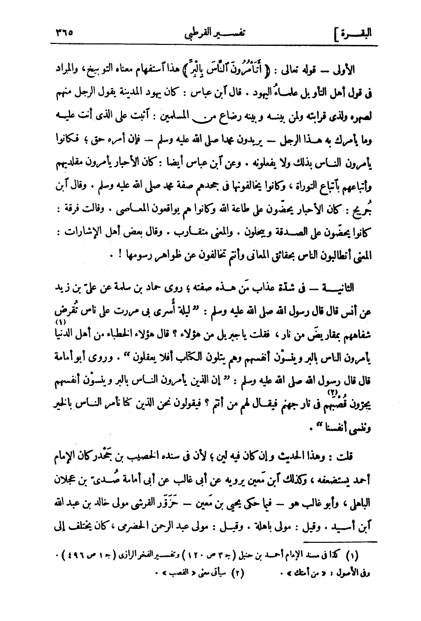 الْأُولَى قَوْلُهُ تَعَالَى: (أَتَأْمُرُونَ النَّاسَ بِالْبِرِّ) هَذَا استفهام معناه التَّوْبِيخِ وَالْمُرَادُ فِي قَوْلِ أَهْلِ التَّأْوِيلِ عُلَمَاءُ الْيَهُودِ. قَالَ ابْنُ عَبَّاسٍ: كَانَ يَهُودُ الْمَدِينَةِ يَقُولُ الرَّجُلُ مِنْهُمْ لِصِهْرِهِ وَلِذِي قَرَابَتِهِ وَلِمَنْ بَيْنَهُ وَبَيْنَهُ رَضَاعٌ مِنَ الْمُسْلِمِينَ اثْبُتْ عَلَى الَّذِي أَنْتَ عَلَيْهِ وَمَا يَأْمُرُكَ بِهِ هَذَا الرَّجُلُ يُرِيدُونَ مُحَمَّدًا صَلَّى اللَّهُ عَلَيْهِ وَسَلَّمَ فَإِنَّ أَمْرَهُ حَقٌّ فَكَانُوا يَأْمُرُونَ النَّاسَ بِذَلِكَ وَلَا يَفْعَلُونَهُ. وَعَنِ ابْنِ عَبَّاسٍ أَيْضًا: كَانَ الْأَحْبَارُ يَأْمُرُونَ مُقَلِّدِيهِمْ وَأَتْبَاعِهِمْ بِاتِّبَاعِ التَّوْرَاةِ وَكَانُوا يُخَالِفُونَهَا فِي جَحْدِهِمْ صِفَةَ مُحَمَّدٍ صَلَّى اللَّهُ عَلَيْهِ وَسَلَّمَ. وَقَالَ ابْنُ جُرَيْجٍ كَانَ الْأَحْبَارُ يحضون في طَاعَةِ اللَّهِ وَكَانُوا هُمْ يُوَاقِعُونَ الْمَعَاصِيَ وَقَالَتْ فِرْقَةٌ كَانُوا يَحُضُّونَ عَلَى الصَّدَقَةِ وَيَبْخَلُونَ وَالْمَعْنَى مُتَقَارِبٌ وَقَالَ بَعْضُ أَهْلِ الْإِشَارَاتِ الْمَعْنَى أَتُطَالِبُونَ النَّاسَ بِحَقَائِقِ الْمَعَانِي وَأَنْتُمْ تُخَالِفُونَ عَنْ ظَوَاهِرِ رُسُومِهَا! الثَّانِيَةُ- فِي شِدَّةِ عَذَابِ مَنْ هَذِهِ صِفَتُهُ رَوَى حَمَّادُ بْنُ سَلَمَةَ عَنْ عَلِيِّ بْنِ زَيْدٍ عَنْ أَنَسٍ قَالَ قَالَ رَسُولُ اللَّهِ صَلَّى اللَّهُ عَلَيْهِ وَسَلَّمَ (لَيْلَةَ أُسْرِيَ بِي مَرَرْتُ عَلَى نَاسٍ تُقْرَضُ شِفَاهُهُمْ بِمَقَارِيضَ مِنْ نَارٍ فَقُلْتُ يَا جِبْرِيلُ مَنْ هَؤُلَاءِ؟ قَالَ هَؤُلَاءِ الْخُطَبَاءُ مِنْ أَهْلِ الدُّنْيَا «١» يَأْمُرُونَ النَّاسَ بِالْبِرِّ وَيَنْسَوْنَ أَنْفُسَهُمْ وَهُمْ يَتْلُونَ الْكِتَابَ أَفَلَا يَعْقِلُونَ) وَرَوَى أَبُو أُمَامَةَ قَالَ قَالَ رَسُولُ اللَّهِ صَلَّى اللَّهُ عَلَيْهِ وَسَلَّمَ (إن الَّذِينَ يَأْمُرُونَ النَّاسَ بِالْبِرِّ وَيَنْسَوْنَ أَنْفُسَهُمْ يَجُرُّونَ قَصَبَهُمْ «٢» فِي نَارِ جَهَنَّمَ فَيُقَالُ لَهُمْ مَنْ أَنْتُمْ؟ فَيَقُولُونَ نَحْنُ الَّذِينَ كُنَّا نَأْمُرُ النَّاسَ بِالْخَيْرِ وَنَنْسَى أَنْفُسَنَا). قُلْتُ: وَهَذَا الْحَدِيثُ وَإِنْ كَانَ فِيهِ لِينٌ، لِأَنَّ فِي سَنَدِهِ الْخَصِيبَ بْنَ جَحْدَرٍ كَانَ الْإِمَامُ أَحْمَدُ يَسْتَضْعِفُهُ وَكَذَلِكَ ابْنُ مَعِينٍ يَرْوِيهِ عَنْ أَبِي غَالِبٍ عَنْ أَبِي أُمَامَةَ صُدَيِّ بْنِ عَجْلَانَ الْبَاهِلِيِّ وَأَبُو غَالِبٍ هُوَ فِيمَا حَكَى يَحْيَى بْنُ مَعِينٍ حَزَوَّرُ الْقُرَشِيُّ مَوْلَى خَالِدِ بْنِ عَبْدِ اللَّهِ ابن أَسِيدٍ وَقِيلَ: مَوْلَى بَاهِلَةَ وَقِيلَ: مَوْلَى عَبْدِ الرحمن الحضرمي كان يختلف إلى