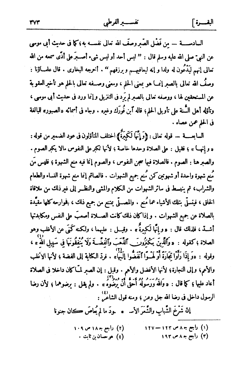السَّادِسَةُ- مِنْ فَضْلِ الصَّبْرِ وَصَفَ اللَّهُ تَعَالَى نَفْسَهُ بِهِ كَمَا فِي حَدِيثِ أَبِي مُوسَى عَنِ النَّبِيِّ صَلَّى اللَّهُ عَلَيْهِ وَسَلَّمَ قَالَ (ليس أحد أو ليس شي أَصْبَرَ عَلَى أَذًى سَمِعَهُ مِنَ اللَّهِ تَعَالَى إِنَّهُمْ لَيَدْعُونَ لَهُ وَلَدًا وَإِنَّهُ لَيُعَافِيهِمْ وَيَرْزُقُهُمْ) أَخْرَجَهُ الْبُخَارِيُّ. قَالَ عُلَمَاؤُنَا: وَصْفُ اللَّهِ تَعَالَى بِالصَّبْرِ إِنَّمَا هُوَ بِمَعْنَى الْحِلْمِ وَمَعْنَى وَصْفِهِ تَعَالَى بِالْحِلْمِ هُوَ تَأْخِيرُ الْعُقُوبَةِ عَنِ الْمُسْتَحِقِّينَ لَهَا وَوَصْفُهُ تَعَالَى بِالصَّبْرِ لَمْ يَرِدْ فِي التَّنْزِيلِ وَإِنَّمَا وَرَدَ فِي حَدِيثِ أَبِي مُوسَى وَتَأَوَّلَهُ أَهْلُ السُّنَّةِ عَلَى تَأْوِيلِ الْحِلْمِ قَالَهُ ابْنُ فُورَكَ وَغَيْرُهُ. وَجَاءَ فِي أَسْمَائِهِ" الصَّبُورُ" لِلْمُبَالَغَةِ فِي الْحِلْمِ عَمَّنْ عَصَاهُ. السَّابِعَةُ- قَوْلُهُ تَعَالَى: (وَإِنَّها لَكَبِيرَةٌ) اخْتَلَفَ الْمُتَأَوِّلُونَ فِي عَوْدِ الضَّمِيرِ مِنْ قَوْلِهِ:" وَإِنَّها"، فَقِيلَ: عَلَى الصَّلَاةِ وَحْدَهَا خَاصَّةً لِأَنَّهَا تَكْبُرُ عَلَى النُّفُوسِ مَا لَا يَكْبُرُ الصَّوْمُ وَالصَّبْرُ هُنَا: الصَّوْمُ فَالصَّلَاةُ فِيهَا سِجْنُ النُّفُوسِ وَالصَّوْمُ إِنَّمَا فِيهِ مَنْعُ الشَّهْوَةِ فَلَيْسَ مَنْ مَنَعَ شَهْوَةً وَاحِدَةً أَوْ شَهْوَتَيْنِ كَمَنْ مَنَعَ جَمِيعَ الشَّهَوَاتِ. فَالصَّائِمُ إِنَّمَا مَنَعَ شَهْوَةَ النِّسَاءِ وَالطَّعَامِ وَالشَّرَابِ ثُمَّ يَنْبَسِطُ فِي سَائِرِ الشَّهَوَاتِ مِنَ الْكَلَامِ وَالْمَشْيِ وَالنَّظَرِ إِلَى غَيْرِ ذَلِكَ مِنْ مُلَاقَاةِ الْخَلْقِ فَيَتَسَلَّى بِتِلْكَ الْأَشْيَاءِ عَمَّا مُنِعَ. وَالْمُصَلِّي يَمْتَنِعُ مِنْ جَمِيعِ ذَلِكَ فَجَوَارِحُهُ كُلُّهَا مُقَيَّدَةٌ بِالصَّلَاةِ عَنْ جَمِيعِ الشَّهَوَاتِ. وَإِذَا كَانَ ذَلِكَ كَانَتِ الصَّلَاةُ أَصْعَبَ عَلَى النَّفْسِ وَمُكَابَدَتُهَا أَشَدَّ فَلِذَلِكَ قَالَ" وَإِنَّها لَكَبِيرَةٌ" وَقِيلَ: عَلَيْهِمَا وَلَكِنَّهُ كَنَّى عَنِ الْأَغْلَبِ وَهُوَ الصَّلَاةُ كَقَوْلِهِ" وَالَّذِينَ يَكْنِزُونَ الذَّهَبَ وَالْفِضَّةَ وَلا يُنْفِقُونَها فِي سَبِيلِ اللَّهِ" «١» [التوبة: ٣٤] وَقَوْلُهُ:" وَإِذا رَأَوْا تِجارَةً أَوْ لَهْواً انْفَضُّوا إِلَيْها" «٢» [الجمعة: ١١] فَرَدَّ الْكِنَايَةَ إِلَى الْفِضَّةِ لِأَنَّهَا الْأَغْلَبُ وَالْأَعَمُّ وَإِلَى التِّجَارَةِ لِأَنَّهَا الْأَفْضَلُ وَالْأَهَمُّ وَقِيلَ: إِنَّ الصبر لما كان داخل فِي الصَّلَاةِ أَعَادَ عَلَيْهَا كَمَا قَالَ" وَاللَّهُ وَرَسُولُهُ أَحَقُّ أَنْ يُرْضُوهُ" «٣» [التوبة: ٦٢] وَلَمْ يَقُلْ: يُرْضُوهُمَا لِأَنَّ رِضَا الرَّسُولِ دَاخِلٌ في رضا الله عز وجل ومنه قول الشاعر «٤»: