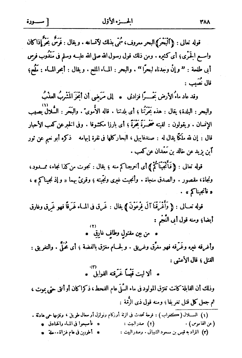 وَالْبَحْرُ: الْبَلْدَةُ يُقَالُ: هَذِهِ بَحْرَتُنَا أَيْ بَلْدَتُنَا. قَالَهُ الْأُمَوِيُّ. وَالْبَحْرُ: السُّلَالُ «١» يُصِيبُ الْإِنْسَانَ. وَيَقُولُونَ: لَقِيتُهُ صَحْرَةً بَحْرَةً أَيْ بَارِزًا مَكْشُوفًا. وَفِي الْخَبَرِ عَنْ كَعْبِ الْأَحْبَارِ قَالَ: إِنَّ لِلَّهِ مَلَكًا يُقَالُ لَهُ: صَنْدَفَايِيلُ الْبِحَارُ كُلُّهَا فِي نَقْرَةِ إبهامه. ذكره أبو نعيم عن ثور ابن يَزِيدَ عَنْ خَالِدِ بْنِ مَعْدَانَ عَنْ كَعْبٍ قَوْلُهُ تَعَالَى: (فَأَنْجَيْناكُمْ) أَيْ أَخْرَجْنَاكُمْ مِنْهُ يُقَالُ نَجَوْتُ مِنْ كَذَا نِجَاءً مَمْدُودٌ وَنَجَاةً مَقْصُورٌ والصدق منجاة وأنجيت غيري ونجيته وقرى بِهِمَا" وَإِذْ نَجَّيْناكُمْ" ... " فَأَنْجَيْناكُمْ". قَوْلُهُ تَعَالَى: (وَأَغْرَقْنا آلَ فِرْعَوْنَ) يُقَالُ: غَرِقَ فِي الْمَاءِ غَرَقًا فَهُوَ غَرِقٌ وَغَارِقٌ أَيْضًا وَمِنْهُ قَوْلُ أَبِي النَّجْمِ: