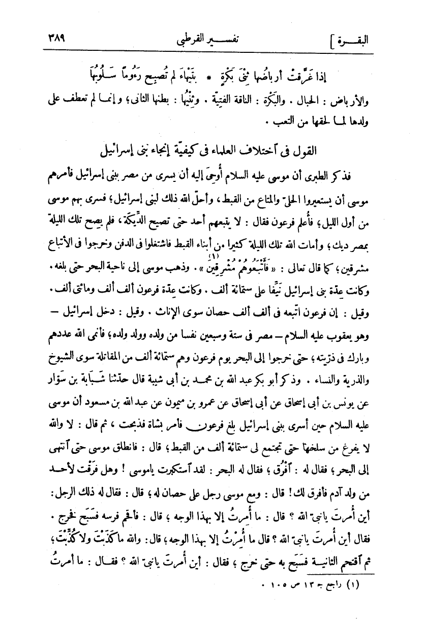 فَذَكَرَ الطَّبَرِيُّ أَنَّ مُوسَى عَلَيْهِ السَّلَامُ أُوحِيَ إِلَيْهِ أَنْ يُسْرِيَ مِنْ مِصْرَ بِبَنِي إِسْرَائِيلَ فَأَمَرَهُمْ مُوسَى أَنْ يَسْتَعِيرُوا الْحُلِيَّ وَالْمَتَاعَ مِنَ الْقِبْطِ وَأَحَلَّ اللَّهُ ذَلِكَ لِبَنِي إِسْرَائِيلَ فَسَرَى بِهِمْ مُوسَى مِنْ أَوَّلِ اللَّيْلِ فَأُعْلِمَ فِرْعَوْنُ فَقَالَ: لَا يَتْبَعُهُمْ أَحَدٌ حَتَّى تَصِيحَ الدِّيَكَةُ فَلَمْ يَصِحْ تِلْكَ اللَّيْلَةَ بِمِصْرَ دِيكٌ وَأَمَاتَ اللَّهُ تِلْكَ اللَّيْلَةَ كَثِيرًا مِنْ أَبْنَاءِ الْقِبْطِ فَاشْتَغَلُوا فِي الدَّفْنِ وَخَرَجُوا فِي الْأَتْبَاعِ مشرقين كما قال تعالى" فَأَتْبَعُوهُمْ مُشْرِقِينَ" «١» [الشعراء: ٦٠]. وَذَهَبَ مُوسَى إِلَى نَاحِيَةِ الْبَحْرِ حَتَّى بَلَغَهُ. وَكَانَتْ عِدَّةُ بَنِي إِسْرَائِيلَ نَيِّفًا عَلَى سِتِّمِائَةِ أَلْفٍ وَكَانَتْ عِدَّةُ فِرْعَوْنَ أَلْفَ أَلْفٍ وَمِائَتَيْ أَلْفٍ. وَقِيلَ: إِنَّ فِرْعَوْنَ اتَّبَعَهُ فِي أَلْفِ أَلْفِ حِصَانٍ سِوَى الْإِنَاثِ وَقِيلَ دَخَلَ إِسْرَائِيلُ- وَهُوَ يَعْقُوبُ عَلَيْهِ السَّلَامُ مِصْرَ فِي سِتَّةٍ وَسَبْعِينَ نَفْسًا مِنْ وَلَدِهِ وَوَلَدِ وَلَدِهِ فَأَنْمَى اللَّهُ عَدَدَهُمْ وَبَارَكَ فِي ذُرِّيَّتِهِ حَتَّى خَرَجُوا إِلَى الْبَحْرِ يَوْمَ فِرْعَوْنَ وَهُمْ سِتُّمِائَةِ أَلْفٍ مِنَ الْمُقَاتِلَةِ سِوَى الشُّيُوخِ وَالذُّرِّيَّةِ وَالنِّسَاءِ وَذَكَرَ أَبُو بَكْرٍ عَبْدُ اللَّهِ بْنُ مُحَمَّدِ بْنِ أَبِي شَيْبَةَ قَالَ حَدَّثَنَا شَبَابَةُ بْنُ سَوَّارٍ عَنْ يُونُسَ بْنِ أَبِي إِسْحَاقَ عَنْ أَبِي إِسْحَاقَ عَنْ عَمْرِو بْنِ مَيْمُونٍ عَنْ عَبْدِ اللَّهِ بْنِ مَسْعُودٍ أَنَّ مُوسَى عَلَيْهِ السَّلَامُ حين أسرى إِسْرَائِيلَ بَلَغَ فِرْعَوْنَ فَأَمَرَ بِشَاةٍ فَذُبِحَتْ ثُمَّ قَالَ: لَا وَاللَّهِ لَا يُفْرَغُ مِنْ سَلْخِهَا حَتَّى تَجْتَمِعَ لِي سِتُّمِائَةِ أَلْفٍ مِنَ الْقِبْطِ قَالَ: فَانْطَلَقَ مُوسَى حَتَّى انْتَهَى إِلَى الْبَحْرِ فَقَالَ لَهُ افْرُقْ فَقَالَ لَهُ الْبَحْرُ: لَقَدِ اسْتَكْبَرْتَ يَا مُوسَى! وَهَلْ فَرَقْتُ لِأَحَدٍ مِنْ وَلَدِ آدَمَ فَأَفْرُقَ لَكَ! قَالَ: وَمَعَ مُوسَى رَجُلٌ عَلَى حِصَانٍ لَهُ قَالَ فَقَالَ لَهُ ذَلِكَ الرَّجُلُ أَيْنَ أُمِرْتَ يَا نَبِيَّ اللَّهِ؟ قال ما أمر ت إِلَّا بِهَذَا الْوَجْهِ قَالَ: فَأَقْحَمَ فَرَسَهُ فَسَبَحَ فَخَرَجَ. فَقَالَ أَيْنَ أُمِرْتَ يَا نَبِيَّ اللَّهِ؟ قَالَ مَا أُمِرْتُ إِلَّا بِهَذَا الْوَجْهِ قَالَ: وَاللَّهِ مَا كَذَبْتَ وَلَا كُذِبْتَ ثُمَّ اقْتَحَمَ الثَّانِيَةَ فَسَبَحَ بِهِ حَتَّى خَرَجَ فَقَالَ أَيْنَ أُمِرْتَ يَا نَبِيَّ اللَّهِ؟ فَقَالَ مَا أُمِرْتُ