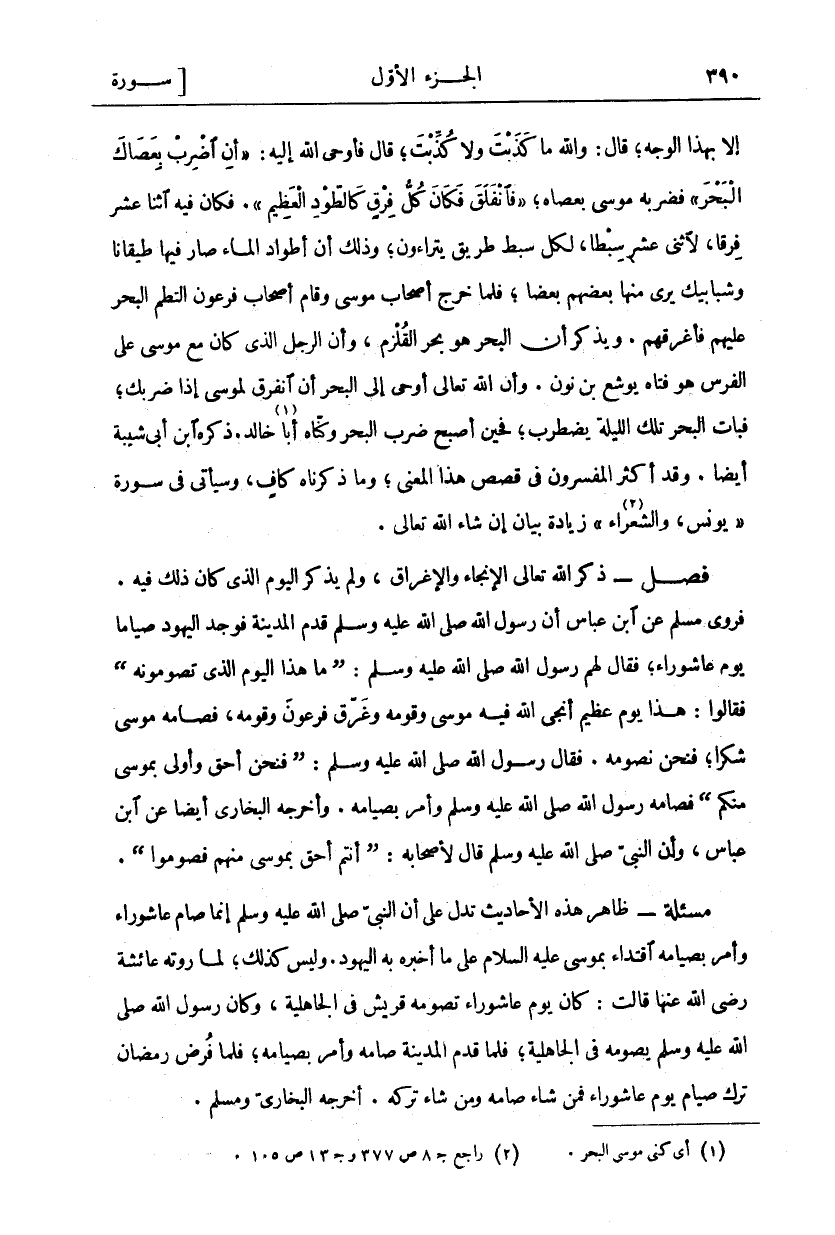 فَرَوَى مُسْلِمٌ عَنِ ابْنِ عَبَّاسٍ أَنَّ رَسُولَ اللَّهِ صَلَّى اللَّهُ عَلَيْهِ وَسَلَّمَ قَدِمَ الْمَدِينَةَ فَوَجَدَ الْيَهُودَ صِيَامًا يَوْمَ عَاشُورَاءَ فَقَالَ لَهُمْ رَسُولُ اللَّهِ صَلَّى اللَّهُ عَلَيْهِ وَسَلَّمَ (مَا هَذَا الْيَوْمُ الَّذِي تَصُومُونَهُ) فَقَالُوا هَذَا يَوْمٌ عَظِيمٌ أَنْجَى اللَّهُ فِيهِ مُوسَى وَقَوْمَهُ وَغَرَّقَ فِرْعَوْنَ وَقَوْمَهُ فَصَامَهُ مُوسَى شُكْرًا فَنَحْنُ نَصُومُهُ. فَقَالَ رَسُولُ اللَّهِ صَلَّى اللَّهُ عَلَيْهِ وَسَلَّمَ (فَنَحْنُ أَحَقُّ وَأَوْلَى بِمُوسَى مِنْكُمْ) فَصَامَهُ رَسُولُ اللَّهِ صَلَّى اللَّهُ عَلَيْهِ وَسَلَّمَ وَأَمَرَ بِصِيَامِهِ. وَأَخْرَجَهُ الْبُخَارِيُّ أَيْضًا عَنِ ابْنِ عَبَّاسٍ وَأَنَّ النَّبِيَّ صَلَّى اللَّهُ عَلَيْهِ وَسَلَّمَ قَالَ لِأَصْحَابِهِ (أَنْتُمْ أَحَقُّ بِمُوسَى منهم فصوموا).