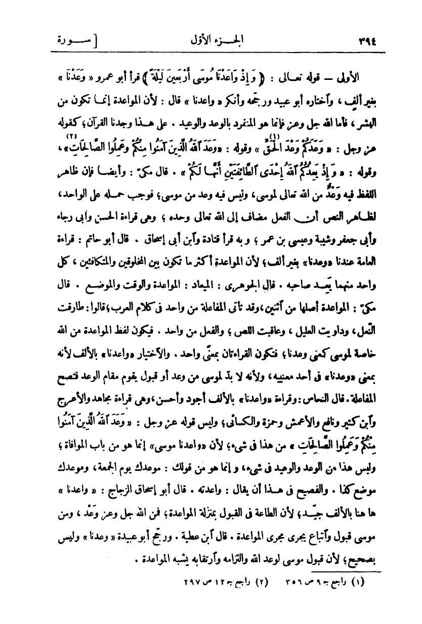 الْأُولَى- قَوْلُهُ تَعَالَى: (وَإِذْ واعَدْنا مُوسى أَرْبَعِينَ لَيْلَةً) قَرَأَ أَبُو عَمْرٍو" وَعَدْنَا" بِغَيْرِ أَلِفٍ، وَاخْتَارَهُ أَبُو عُبَيْدٍ وَرَجَّحَهُ وَأَنْكَرَ" واعَدْنا" قَالَ: لِأَنَّ الْمُوَاعَدَةَ إِنَّمَا تَكُونُ مِنَ الْبَشَرِ فَأَمَّا الله عز وجل فَإِنَّمَا هُوَ الْمُنْفَرِدُ بِالْوَعْدِ وَالْوَعِيدِ. عَلَى هَذَا وَجَدْنَا الْقُرْآنَ، كَقَوْلِهِ عَزَّ وَجَلَّ:" وَعَدَكُمْ وَعْدَ الْحَقِّ" «١» (إِبْرَاهِيمَ: ٢٢) وَقَوْلُهُ:" وَعَدَ اللَّهُ الَّذِينَ آمَنُوا مِنْكُمْ وَعَمِلُوا الصَّالِحاتِ" «٢» (الْفَتْحِ: ٢٩) وَقَوْلُهُ:" وَإِذْ يَعِدُكُمُ اللَّهُ إِحْدَى الطَّائِفَتَيْنِ أَنَّها لَكُمْ" [الأنفال: ٧]. قَالَ مَكِّيٌّ: وَأَيْضًا فَإِنَّ ظَاهِرَ اللَّفْظِ فِيهِ وَعْدٌ مِنَ اللَّهِ تَعَالَى لِمُوسَى، وَلَيْسَ فِيهِ وَعْدٌ مِنْ مُوسَى، فَوَجَبَ حَمْلُهُ عَلَى الْوَاحِدِ، لِظَاهِرِ النَّصِّ أَنَّ الْفِعْلَ مُضَافٌ إِلَى اللَّهِ تَعَالَى وَحْدَهُ، وَهِيَ قِرَاءَةُ الْحَسَنِ وَأَبِي رَجَاءٍ وَأَبِي جَعْفَرٍ وَشَيْبَةَ وَعِيسَى بْنِ عُمَرَ، وَبِهِ قَرَأَ قَتَادَةُ وَابْنُ أَبِي إِسْحَاقَ. قَالَ أَبُو حَاتِمٍ: قِرَاءَةُ الْعَامَّةِ عِنْدَنَا" وَعَدْنَا" بِغَيْرِ أَلِفٍ، لِأَنَّ الْمُوَاعَدَةَ أَكْثَرُ مَا تَكُونُ بَيْنَ الْمَخْلُوقِينَ وَالْمُتَكَافِئِينَ، كُلُّ وَاحِدٍ مِنْهُمَا يَعِدُ صَاحِبَهُ. قَالَ الْجَوْهَرِيُّ: الْمِيعَادُ: الْمُوَاعَدَةُ وَالْوَقْتُ وَالْمَوْضِعُ. قَالَ مَكِّيٌّ: الْمُوَاعَدَةُ أَصْلُهَا مِنَ اثْنَيْنِ، وَقَدْ تَأْتِي الْمُفَاعَلَةُ مِنْ وَاحِدٍ فِي كَلَامِ الْعَرَبِ، قَالُوا: طَارَقْتُ النَّعْلَ، وَدَاوَيْتُ الْعَلِيلَ، وَعَاقَبْتُ اللِّصَّ، وَالْفِعْلُ مِنْ وَاحِدٍ. فَيَكُونُ لَفْظُ الْمُوَاعَدَةِ مِنَ اللَّهِ خَاصَّةً لِمُوسَى كَمَعْنَى وَعَدْنَا، فَتَكُونُ الْقِرَاءَتَانِ بِمَعْنًى وَاحِدٍ. والاختبار" واعَدْنا" بِالْأَلِفِ لِأَنَّهُ بِمَعْنَى" وَعَدْنَا" فِي أَحَدِ معنييه، ولأنه لأبد لِمُوسَى مِنْ وَعْدٍ أَوْ قَبُولٍ يَقُومُ مَقَامَ الْوَعْدِ فَتَصِحُّ الْمُفَاعَلَةُ. قَالَ النَّحَّاسُ: وَقِرَاءَةُ" واعَدْنا" بِالْأَلِفِ أَجْوَدُ وَأَحْسَنُ، وَهِيَ قِرَاءَةُ مُجَاهِدٍ وَالْأَعْرَجِ وَابْنِ كَثِيرٍ وَنَافِعٍ وَالْأَعْمَشِ وَحَمْزَةَ وَالْكِسَائِيِّ، وَلَيْسَ قَوْلُهُ عَزَّ وَجَلَّ:" وَعَدَ اللَّهُ الَّذِينَ آمَنُوا مِنْكُمْ وَعَمِلُوا الصَّالِحاتِ" من هذا في شي، لِأَنَّ" واعَدْنا مُوسى " إِنَّمَا هُوَ مِنْ بَابِ الْمُوَافَاةِ، وَلَيْسَ هَذَا مِنَ الْوَعْدِ وَالْوَعِيدِ فِي شي، وَإِنَّمَا هُوَ مِنْ قَوْلِكَ: مَوْعِدُكَ يَوْمَ الْجُمُعَةِ، وَمَوْعِدُكَ مَوْضِعَ كَذَا. وَالْفَصِيحُ فِي هَذَا أَنْ يُقَالَ: وَاعَدْتُهُ. قَالَ أَبُو إِسْحَاقَ الزَّجَّاجُ:" واعَدْنا" هَا هُنَا بِالْأَلِفِ جَيِّدٌ، لِأَنَّ الطَّاعَةَ فِي القبول بمنزلة المواعدة، فمن الله عز وجل وَعْدٌ، وَمِنْ مُوسَى قَبُولٌ وَاتِّبَاعٌ يَجْرِي مَجْرَى الْمُوَاعَدَةِ. قَالَ ابْنُ عَطِيَّةَ. وَرَجَّحَ أَبُو عُبَيْدَةَ" وَعَدْنَا" وَلَيْسَ بِصَحِيحٍ، لِأَنَّ قَبُولَ مُوسَى لِوَعْدِ الله والتزامه وارتقابه يشبه المواعدة.