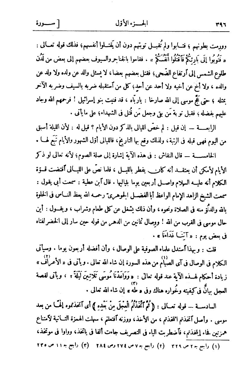 وَوَرِمَتْ بُطُونُهُمْ فَتَابُوا وَلَمْ تُقْبَلْ تَوْبَتُهُمْ دُونَ أَنْ يَقْتُلُوا أَنْفُسَهُمْ فَذَلِكَ قَوْلُهُ تَعَالَى:" فَتُوبُوا إِلى بارِئِكُمْ فَاقْتُلُوا أَنْفُسَكُمْ" [البقرة: ٥٤] فَقَامُوا بِالْخَنَاجِرِ وَالسُّيُوفِ بَعْضُهُمْ إِلَى بَعْضٍ مِنْ لَدُنْ طُلُوعِ الشَّمْسِ إِلَى ارْتِفَاعِ الضُّحَى فَقَتَلَ بَعْضُهُمْ بَعْضًا لَا يَسْأَلُ وَالِدٌ عَنْ وَلَدِهِ وَلَا وَلَدٌ عَنْ وَالِدِهِ وَلَا أَخٌ عَنْ أَخِيهِ وَلَا أَحَدٌ عَنْ أَحَدٍ كُلُّ مَنَ اسْتَقْبَلَهُ ضَرَبَهُ بِالسَّيْفِ وَضَرَبَهُ الْآخَرُ بِمِثْلِهِ حَتَّى عَجَّ مُوسَى إِلَى اللَّهِ صَارِخًا: يَا رَبَّاهُ قَدْ فَنِيَتْ بَنُو إِسْرَائِيلَ! فَرَحِمَهُمُ اللَّهُ وَجَادَ عَلَيْهِمْ بِفَضْلِهِ فَقَبِلَ تَوْبَةَ مَنْ بَقِيَ وَجَعَلَ مَنْ قُتِلَ فِي الشُّهَدَاءِ عَلَى مَا يَأْتِي. الرَّابِعَةُ- إِنْ قِيلَ لِمَ خَصَّ اللَّيَالِي بِالذِّكْرِ دُونَ الْأَيَّامِ؟ قِيلَ لَهُ: لِأَنَّ اللَّيْلَةَ أَسْبَقُ مِنَ الْيَوْمِ فَهِيَ قَبْلَهُ فِي الرُّتْبَةِ وَلِذَلِكَ وَقَعَ بِهَا التَّارِيخُ فَاللَّيَالِي أَوَّلُ الشُّهُورِ وَالْأَيَّامُ تَبَعٌ لَهَا. الْخَامِسَةُ- قَالَ النَّقَّاشُ: فِي هَذِهِ الْآيَةِ إِشَارَةٌ إِلَى صِلَةِ الصَّوْمِ لِأَنَّهُ تَعَالَى لَوْ ذَكَرَ الْأَيَّامَ لَأَمْكَنَ أَنْ يُعْتَقَدَ أَنَّهُ كَانَ يُفْطِرُ بِاللَّيْلِ فَلَمَّا نَصَّ عَلَى اللَّيَالِي اقْتَضَتْ قُوَّةُ الْكَلَامِ أَنَّهُ عَلَيْهِ السَّلَامُ وَاصَلَ أَرْبَعِينَ يَوْمًا بِلَيَالِيِهَا. قَالَ ابْنُ عَطِيَّةَ: سَمِعْتُ أَبِي يَقُولُ: سَمِعْتُ الشَّيْخَ الزَّاهِدَ الْإِمَامَ الْوَاعِظَ أَبَا الْفَضْلِ الْجَوْهَرِيَّ رَحِمَهُ اللَّهُ يَعِظُ النَّاسَ فِي الْخَلْوَةِ بِاللَّهِ وَالدُّنُوِّ مِنْهُ فِي الصَّلَاةِ وَنَحْوِهِ وَأَنَّ ذَلِكَ يَشْغَلُ عَنْ كُلِّ طَعَامٍ وَشَرَابٍ وَيَقُولُ أَيْنَ حَالُ مُوسَى فِي الْقُرْبِ مِنَ اللَّهِ! وَوِصَالِ ثَمَانِينَ مِنَ الدَّهْرِ مِنْ قول حِينَ سَارَ إِلَى الْخَضِرِ لِفَتَاهُ فِي بَعْضِ يوم" آتِنا غَداءَنا" [الكهف: ٦٢]. قُلْتُ: وَبِهَذَا اسْتَدَلَّ عُلَمَاءُ الصُّوفِيَّةِ عَلَى الْوِصَالِ وَأَنَّ أَفْضَلَهُ أَرْبَعُونَ يَوْمًا. وَسَيَأْتِي الْكَلَامُ فِي الْوِصَالِ فِي آيِ الصِّيَامِ «١» مِنْ هَذِهِ السُّورَةِ إِنْ شَاءَ اللَّهُ تَعَالَى. وَيَأْتِي فِي" الْأَعْرَافِ" «٢» زِيَادَةُ أَحْكَامٍ لِهَذِهِ الْآيَةِ عِنْدَ قَوْلِهِ تَعَالَى" وَواعَدْنا مُوسى ثَلاثِينَ لَيْلَةً" [الأعراف: ١٤٢] ويأتي لقصة العجل ببان في كيفيته وخوارة وَفِي" طه" «٣» إِنْ شَاءَ اللَّهُ تَعَالَى. السَّادِسَةُ- قَوْلُهُ تَعَالَى: (ثُمَّ اتَّخَذْتُمُ الْعِجْلَ مِنْ بَعْدِهِ) أَيِ اتَّخَذْتُمُوهُ إِلَهًا مِنْ بَعْدِ مُوسَى. وَأَصْلُ اتَّخَذْتُمُ ائْتَخَذْتُمْ مِنَ الْأَخْذِ وَوَزْنُهُ افْتَعَلْتُمْ سُهِّلَتِ الْهَمْزَةُ الثَّانِيَةُ لِامْتِنَاعِ هَمْزَتَيْنِ فَجَاءَ ايتَخَذْتُمْ فَاضْطَرَبَتِ الْيَاءُ فِي التَّصْرِيفِ جَاءَتْ أَلِفًا فِي يَاتَخِذُ وواوا في موتخذ