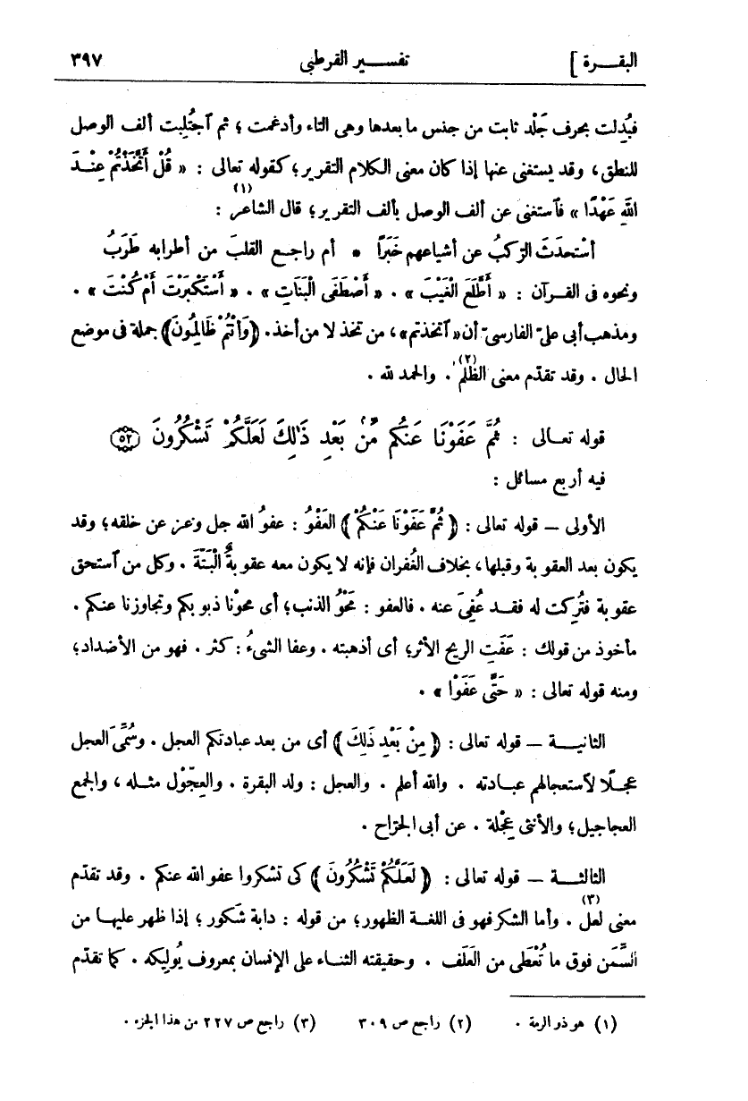 فِيهِ أَرْبَعُ مَسَائِلَ: الْأُولَى- قَوْلُهُ تَعَالَى: (ثُمَّ عَفَوْنا عَنْكُمْ) العفو: عفو الله عز وجل عَنْ خَلْقِهِ وَقَدْ يَكُونُ بَعْدَ الْعُقُوبَةِ وَقَبْلَهَا بِخِلَافِ الْغُفْرَانِ فَإِنَّهُ لَا يَكُونُ مَعَهُ عُقُوبَةٌ الْبَتَّةَ. وَكُلُّ مَنِ اسْتَحَقَّ عُقُوبَةً فَتُرِكَتْ لَهُ فَقَدْ عُفِيَ عَنْهُ فَالْعَفْوُ: مَحْوُ الذَّنْبِ أَيْ مَحَوْنَا ذُنُوبَكُمْ وَتَجَاوَزْنَا عَنْكُمْ مَأْخُوذٌ مِنْ قَوْلِكَ: عَفَتِ الرِّيحُ الْأَثَرَ أَيْ أَذْهَبَتْهُ وَعَفَا الشَّيْءُ كَثُرَ فَهُوَ مِنَ الْأَضْدَادِ وَمِنْهُ قَوْلُهُ تَعَالَى" حَتَّى عَفَوْا". [الأعراف ٩٥]. الثَّانِيَةُ- قَوْلُهُ تَعَالَى: (مِنْ بَعْدِ ذلِكَ) أَيْ مِنْ بَعْدِ عِبَادَتِكُمُ الْعِجْلَ. وَسُمِّيَ الْعِجْلُ عِجْلًا لِاسْتِعْجَالِهِمْ عِبَادَتَهُ. وَاللَّهُ أَعْلَمُ. وَالْعِجْلُ وَلَدُ الْبَقَرَةِ. وَالْعِجَّوْلُ مِثْلُهُ وَالْجَمْعُ الْعَجَاجِيلُ وَالْأُنْثَى عِجْلَةٌ. عَنْ أَبِي الْجَرَّاحِ. الثَّالِثَةُ- قَوْلُهُ تَعَالَى: (لَعَلَّكُمْ تَشْكُرُونَ) كَيْ تَشْكُرُوا عَفْوَ اللَّهِ عَنْكُمْ. وَقَدْ تَقَدَّمَ مَعْنَى لَعَلَّ «٣». وَأَمَّا الشُّكْرُ فَهُوَ فِي اللُّغَةِ الظهور من قول دَابَّةٌ شَكُورٌ إِذَا ظَهَرَ عَلَيْهَا مِنَ السِّمَنِ فَوْقَ مَا تُعْطَى مِنَ الْعَلَفِ وَحَقِيقَتُهُ الثَّنَاءُ على الإنسان بمعروف يوليكه. كما تقدم
