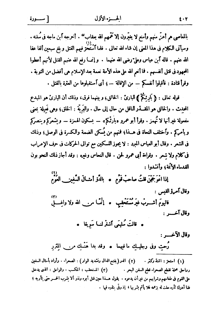 بِالْمَعَاصِي هُمْ أَعَزُّ مِنْهُمْ وَأَمْنَعُ لَا يُغَيِّرُونَ إِلَّا عَمَّهُمُ اللَّهُ بِعِقَابٍ (. أَخْرَجَهُ ابْنُ مَاجَهْ فِي سُنَنِهِ. وَسَيَأْتِي الْكَلَامُ فِي هَذَا الْمَعْنَى إِنْ شَاءَ اللَّهُ تَعَالَى. فَلَمَّا اسْتَحَرَّ «١» فِيهِمُ الْقَتْلُ وَبَلَغَ سَبْعِينَ أَلْفًا عَفَا اللَّهُ عَنْهُمْ قَالَهُ ابْنُ عَبَّاسٍ وَعَلِيٍّ رَضِيَ اللَّهُ عَنْهُمَا. وَإِنَّمَا رَفَعَ اللَّهُ عَنْهُمُ الْقَتْلَ لِأَنَّهُمْ أَعْطَوُا الْمَجْهُودَ فِي قَتْلِ أَنْفُسِهِمْ فَمَا أَنْعَمَ اللَّهُ عَلَى هَذِهِ الْأُمَّةِ نِعْمَةً بَعْدَ الْإِسْلَامِ هِيَ أَفْضَلُ مِنَ التَّوْبَةِ. وَقَرَأَ قَتَادَةُ: فَأَقِيلُوا أَنْفُسَكُمْ مِنَ الْإِقَالَةِ أَيِ اسْتَقْبِلُوهَا مِنَ الْعَثْرَةِ بِالْقَتْلِ. قَوْلُهُ تَعَالَى:" بارِئِكُمْ" الْبَارِئُ: الْخَالِقُ وَبَيْنَهُمَا فَرْقٌ وَذَلِكَ أَنَّ الْبَارِئَ هُوَ الْمُبْدِعُ الْمُحْدِثُ. وَالْخَالِقُ هُوَ الْمُقَدِّرُ النَّاقِلُ مِنْ حَالٍ إِلَى حَالٍ. وَالْبَرِيَّةُ الْخَلْقُ وَهِيَ فَعِيلَةٌ بِمَعْنَى مَفْعُولَةٍ غَيْرَ أَنَّهَا لَا تُهْمَزُ وَقَرَأَ أَبُو عَمْرٍو" بَارِئْكُمْ" بِسُكُونِ الْهَمْزَةِ وَيُشْعِرْكُمْ وَيَنْصُرْكُمْ وَيَأْمُرْكُمْ. وَاخْتَلَفَ النُّحَاةُ فِي هَذَا فَمِنْهُمْ مَنْ يُسَكِّنُ الضَّمَّةَ وَالْكَسْرَةَ فِي الْوَصْلِ وَذَلِكَ فِي الشِّعْرِ. وَقَالَ أَبُو الْعَبَّاسِ الْمُبَرِّدُ: لَا يَجُوزُ التَّسْكِينُ مَعَ تَوَالِي الْحَرَكَاتِ فِي حَرْفِ الْإِعْرَابِ فِي كَلَامٍ وَلَا شِعْرٍ وَقِرَاءَةُ أَبِي عَمْرٍو لَحْنٌ قَالَ النَّحَّاسُ وَغَيْرُهُ وَقَدْ أَجَازَ ذَلِكَ النَّحْوِيُّونَ الْقُدَمَاءُ الْأَئِمَّةُ وَأَنْشَدُوا: