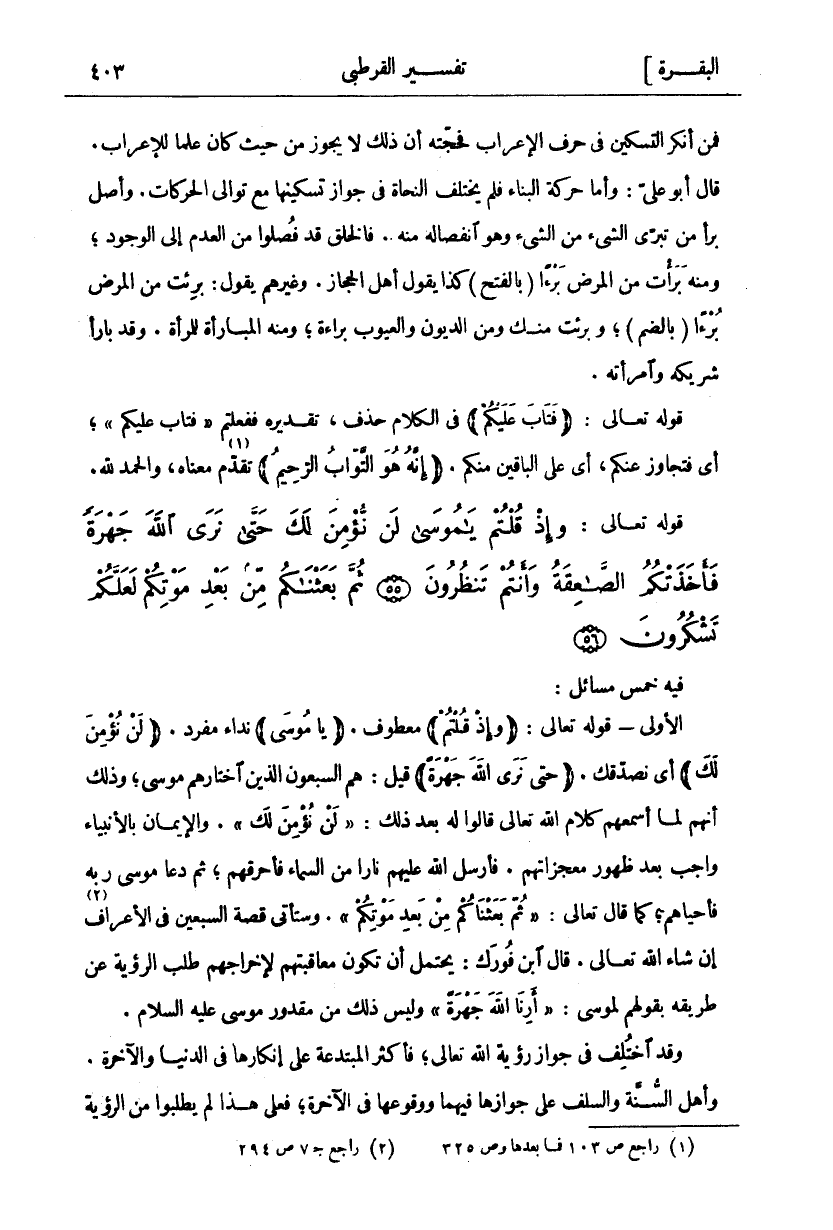 فَمَنْ أَنْكَرَ التَّسْكِينَ فِي حَرْفِ الْإِعْرَابِ فَحُجَّتُهُ أَنَّ ذَلِكَ لَا يَجُوزُ مِنْ حَيْثُ كَانَ عَلَمًا لِلْإِعْرَابِ. قَالَ أَبُو عَلِيٍّ: وَأَمَّا حَرَكَةُ الْبِنَاءِ فَلَمْ يَخْتَلِفِ النُّحَاةُ فِي جَوَازِ تَسْكِينِهَا مَعَ تَوَالِي الْحَرَكَاتِ. وَأَصْلُ بَرَأَ مِنْ تَبَرَّى الشَّيْءُ مِنَ الشَّيْءِ وَهُوَ انْفِصَالُهُ مِنْهُ. فَالْخَلْقُ قَدْ فُصِلُوا مِنَ الْعَدَمِ إِلَى الْوُجُودِ وَمِنْهُ بَرَأْتُ مِنَ الْمَرَضِ بَرْءًا (بِالْفَتْحِ) كَذَا يَقُولُ أَهْلُ الْحِجَازِ. وَغَيْرُهُمْ يَقُولُ بَرِئْتُ مِنَ الْمَرَضِ بُرْءًا (بِالضَّمِّ) وَبَرِئْتُ مِنْكَ وَمِنَ الدُّيُونِ وَالْعُيُوبِ بَرَاءَةً وَمِنْهُ الْمُبَارَأَةُ لِلْمَرْأَةِ. وَقَدْ بَارَأَ شَرِيكَهُ وَامْرَأَتَهُ قَوْلُهُ تَعَالَى: (فَتابَ عَلَيْكُمْ) فِي الْكَلَامِ حَذْفٌ تَقْدِيرُهُ فَفَعَلْتُمْ فَتَابَ عَلَيْكُمْ أَيْ فَتَجَاوَزَ عَنْكُمْ أَيْ عَلَى الْبَاقِينَ مِنْكُمْ. (إِنَّهُ هُوَ التَّوَّابُ الرَّحِيمُ) تقدم «١» معناه والحمد لله.