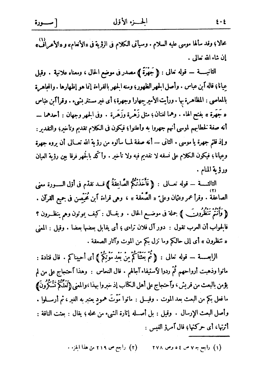 مُحَالًا وَقَدْ سَأَلَهَا مُوسَى عَلَيْهِ السَّلَامُ وَسَيَأْتِي الْكَلَامُ فِي الرُّؤْيَةِ فِي" الْأَنْعَامِ" وَ" الْأَعْرَافِ" «١» إِنْ شَاءَ اللَّهُ تَعَالَى الثَّانِيَةُ- قَوْلُهُ تَعَالَى: (جَهْرَةً) مَصْدَرٌ فِي مَوْضِعِ الْحَالِ وَمَعْنَاهُ عَلَانِيَةٌ وَقِيلَ عِيَانًا قَالَهُ ابْنُ عَبَّاسٍ. وَأَصْلُ الْجَهْرِ الظُّهُورُ وَمِنْهُ الْجَهْرُ بِالْقِرَاءَةِ إِنَّمَا هُوَ إِظْهَارُهَا. وَالْمُجَاهَرَةُ بِالْمَعَاصِي: الْمُظَاهَرَةُ بِهَا. وَرَأَيْتُ الْأَمِيرَ جِهَارًا وَجَهْرَةً أَيْ غَيْرَ مُسْتَتِرٍ بِشَيْءٍ وَقَرَأَ ابْنُ عَبَّاسٍ" جَهَرَةً" بِفَتْحِ الْهَاءِ. وَهُمَا لُغَتَانِ مِثْلَ زَهْرَةٍ وَزَهَرَةٍ. وَفِي الْجَهْرِ وَجْهَانِ: أَحَدُهُمَا- أَنَّهُ صِفَةٌ لِخِطَابِهِمْ لِمُوسَى أَنَّهُمْ جَهَرُوا بِهِ وَأَعْلَنُوا فَيَكُونُ فِي الْكَلَامِ تَقْدِيمٌ وَتَأْخِيرٌ وَالتَّقْدِيرُ: وَإِذْ قُلْتُمْ جَهْرَةً يَا مُوسَى. الثَّانِي- أَنَّهُ صِفَةٌ لِمَا سَأَلُوهُ مِنْ رُؤْيَةِ اللَّهِ تَعَالَى أَنْ يروه جهرة وعيانا فيكون الكلام عله نَسَقِهِ لَا تَقْدِيمَ فِيهِ وَلَا تَأْخِيرَ. وَأُكِّدَ بِالْجَهْرِ فَرْقًا بَيْنَ رُؤْيَةِ الْعِيَانِ وَرُؤْيَةِ الْمَنَامِ. الثَّالِثَةُ- قَوْلُهُ تَعَالَى: (فَأَخَذَتْكُمُ الصَّاعِقَةُ) قَدْ تَقَدَّمَ فِي أَوَّلِ السُّورَةِ مَعْنَى الصَّاعِقَةِ «٢» وَقَرَأَ عُمَرُ وَعُثْمَانُ وَعَلِيٌّ" الصَّعْقَةُ" وَهِيَ قِرَاءَةُ ابْنِ مُحَيْصِنٍ فِي جَمِيعِ الْقُرْآنِ. (وَأَنْتُمْ تَنْظُرُونَ) جُمْلَةٌ فِي مَوْضِعِ الْحَالِ. وَيُقَالُ: كَيْفَ يَمُوتُونَ وَهُمْ يَنْظُرُونَ؟ فَالْجَوَابُ أَنَّ الْعَرَبَ تَقُولُ: دُورُ آلِ فُلَانٍ تَرَاءَى أَيْ يُقَابِلُ بَعْضُهَا بَعْضًا وَقِيلَ الْمَعْنَى" تَنْظُرُونَ" أَيْ إِلَى حَالِكُمْ وَمَا نَزَلَ بِكُمْ مِنَ الْمَوْتِ وَآثَارِ الصَّعْقَةِ. الرَّابِعَةُ- قَوْلُهُ تَعَالَى: (ثُمَّ بَعَثْناكُمْ مِنْ بَعْدِ مَوْتِكُمْ) أَيْ أَحْيَيْنَاكُمْ قال قتادة ماتوا وذهبت أرواحهم ثم ودوا لِاسْتِيفَاءِ آجَالِهِمْ قَالَ النَّحَّاسُ وَهَذَا احْتِجَاجٌ عَلَى مَنْ لَمْ يُؤْمِنْ بِالْبَعْثِ مِنْ قُرَيْشٍ وَاحْتِجَاجٌ عَلَى أَهْلِ الْكِتَابِ إِذْ خُبِّرُوا بِهَذَا وَالْمَعْنَى" لَعَلَّكُمْ تَشْكُرُونَ" مَا فُعِلَ بِكُمْ مِنَ الْبَعْثِ بَعْدَ الْمَوْتِ وَقِيلَ مَاتُوا مَوْتَ هُمُودٍ يَعْتَبِرُ بِهِ الْغَيْرُ ثُمَّ أُرْسِلُوا وَأَصْلُ الْبَعْثِ الْإِرْسَالُ. وَقِيلَ: بَلْ أَصْلُهُ إِثَارَةُ الشَّيْءِ مِنْ مَحَلِّهِ يُقَالُ: بَعَثْتُ النَّاقَةَ: أَثَرْتُهَا أَيْ حَرَّكَتُهَا قَالَ امرؤ القيس: