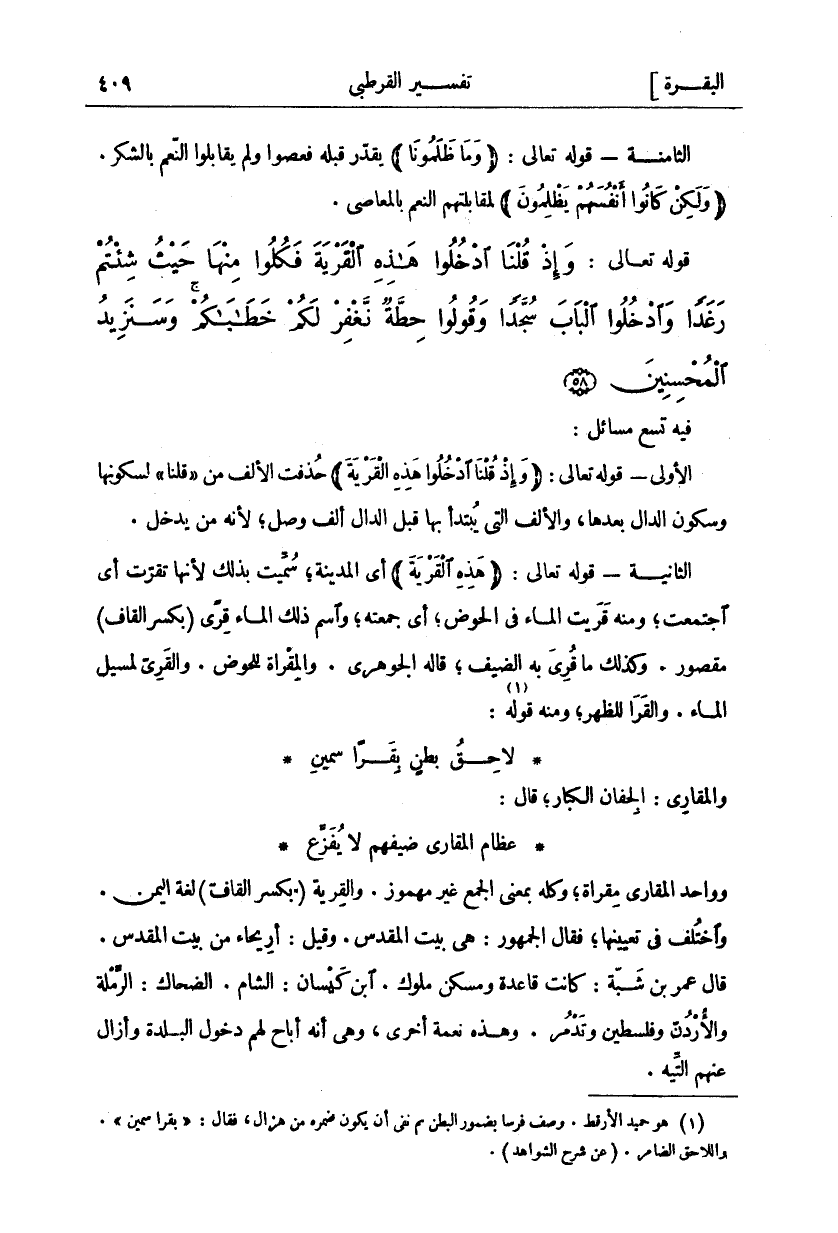 وَوَاحِدُ الْمَقَارِي مِقْرَاةٌ وَكُلُّهُ بِمَعْنَى الْجَمْعِ غَيْرُ مَهْمُوزٍ. وَالْقِرْيَةُ (بِكَسْرِ الْقَافِ) لُغَةُ الْيَمَنِ. وَاخْتُلِفَ فِي تَعْيِينِهَا فَقَالَ الْجُمْهُورُ: هِيَ بَيْتُ الْمَقْدِسِ. وَقِيلَ: أَرِيحَاءُ مِنْ بَيْتِ الْمَقْدِسِ. قَالَ عُمَرُ بْنُ شَبَّةَ: كَانَتْ قَاعِدَةَ وَمَسْكَنَ مُلُوكٍ. ابْنُ كَيْسَانَ الشَّامُ. الضَّحَّاكُ: الرَّمْلَةُ وَالْأُرْدُنُّ وَفِلَسْطِينُ وَتَدْمُرُ. وَهَذِهِ نِعْمَةٌ أُخْرَى وَهِيَ أَنَّهُ أَبَاحَ لهم دخول البلدة وأزال عنهم التيه.