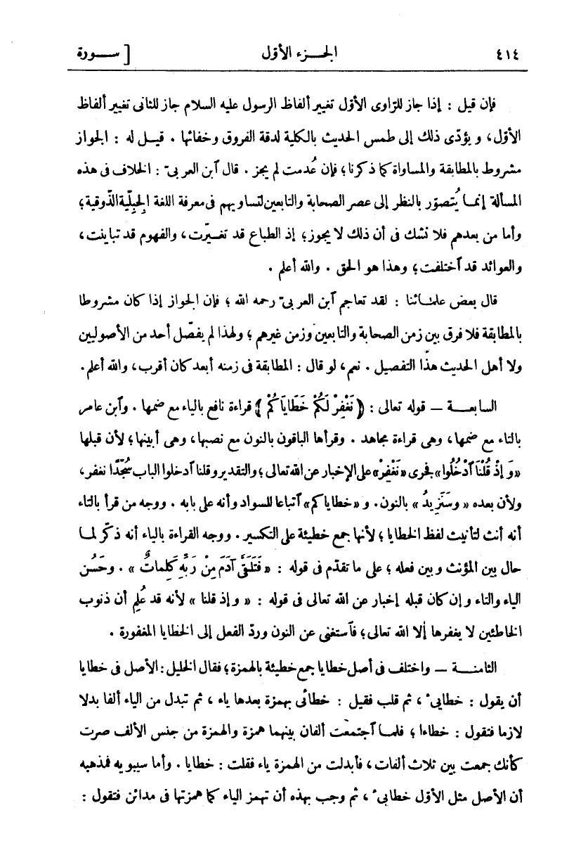 فَإِنْ قِيلَ: إِذَا جَازَ لِلرَّاوِي الْأَوَّلِ تَغْيِيرُ ألفاظ الرسول عليه السلام جاز للثاني تغير أَلْفَاظِ الْأَوَّلِ وَيُؤَدِّي ذَلِكَ إِلَى طَمْسِ الْحَدِيثِ بِالْكُلِّيَّةِ لِدِقَّةِ الْفُرُوقِ وَخَفَائِهَا. قِيلَ لَهُ: الْجَوَازُ مَشْرُوطٌ بِالْمُطَابَقَةِ وَالْمُسَاوَاةِ كَمَا ذَكَرْنَا فَإِنْ عُدِمَتْ لَمْ يَجُزْ. قَالَ ابْنُ الْعَرَبِيِّ: الْخِلَافُ فِي هَذِهِ الْمَسْأَلَةِ إِنَّمَا يُتَصَوَّرُ بِالنَّظَرِ إِلَى عَصْرِ الصَّحَابَةِ وَالتَّابِعِينَ لِتَسَاوِيهِمْ فِي مَعْرِفَةِ اللُّغَةِ الْجِبِلِّيَّةِ الذَّوْقِيَّةِ وَأَمَّا مَنْ بَعْدَهُمْ فَلَا نَشُكُّ فِي أَنَّ ذَلِكَ لَا يَجُوزُ إِذِ الطِّبَاعُ قَدْ تَغَيَّرَتْ وَالْفُهُومُ قَدْ تَبَايَنَتْ وَالْعَوَائِدُ قَدِ اخْتَلَفَتْ وَهَذَا هُوَ الْحَقُّ. وَاللَّهُ أَعْلَمُ. قَالَ بَعْضُ عُلَمَائِنَا: لَقَدْ تَعَاجَمَ ابْنُ الْعَرَبِيِّ رَحِمَهُ اللَّهُ فَإِنَّ الْجَوَازَ إِذَا كَانَ مَشْرُوطًا بِالْمُطَابَقَةِ فَلَا فَرْقَ بَيْنَ زَمَنِ الصَّحَابَةِ وَالتَّابِعِينَ وَزَمَنِ غَيْرِهِمْ وَلِهَذَا لَمْ يُفَصِّلْ أَحَدٌ مِنَ الْأُصُولِيِّينَ وَلَا أَهْلِ الْحَدِيثِ هَذَا التَّفْصِيلَ. نَعَمْ لَوْ قَالَ: الْمُطَابَقَةُ فِي زَمَنِهِ أَبْعَدُ كَانَ أَقْرَبَ وَاللَّهُ أَعْلَمُ. السَّابِعَةُ- قَوْلُهُ تَعَالَى: (نَغْفِرْ لَكُمْ خَطاياكُمْ) قِرَاءَةُ نَافِعٍ بِالْيَاءِ مَعَ ضَمِّهَا. وَابْنِ عَامِرٍ بِالتَّاءِ مَعَ ضَمِّهَا وَهِيَ قِرَاءَةُ مُجَاهِدٍ. وَقَرَأَهَا الْبَاقُونَ بِالنُّونِ مَعَ نَصْبِهَا وَهِيَ أَبْيَنُهَا لِأَنَّ قَبْلَهَا" وَإِذْ قُلْنَا ادْخُلُوا" فَجَرَى" نَغْفِرْ" عَلَى الْإِخْبَارِ عَنِ اللَّهِ تَعَالَى وَالتَّقْدِيرُ وَقُلْنَا ادْخُلُوا الْبَابَ سُجَّدًا نَغْفِرْ وَلِأَنَّ بَعْدَهُ" وَسَنَزِيدُ" بِالنُّونِ. و" خَطاياكُمْ" اتِّبَاعًا لِلسَّوَادِ وَأَنَّهُ عَلَى بَابِهِ. وَوَجْهُ مَنْ قرأ بالتاء أنه أنث لِتَأْنِيثِ لَفْظِ الْخَطَايَا لِأَنَّهَا جَمْعُ خَطِيئَةٍ عَلَى التَّكْسِيرِ. وَوَجْهُ الْقِرَاءَةِ بِالْيَاءِ أَنَّهُ ذَكَّرَ لَمَّا حَالَ بَيْنَ الْمُؤَنَّثِ وَبَيْنَ فِعْلِهِ عَلَى مَا تَقَدَّمَ فِي قَوْلِهِ" فَتَلَقَّى آدَمُ مِنْ رَبِّهِ كَلِماتٍ" [البقرة: ٣٧]. وَحَسُنَ الْيَاءُ وَالتَّاءُ وَإِنْ كَانَ قَبْلَهُ إِخْبَارٌ عَنِ اللَّهِ تَعَالَى فِي قَوْلِهِ" وَإِذْ قُلْنَا" لِأَنَّهُ قَدْ عُلِمَ أَنَّ ذُنُوبَ الْخَاطِئِينَ لَا يَغْفِرُهَا إِلَّا اللَّهُ تَعَالَى فَاسْتُغْنِيَ عَنِ النُّونِ وَرُدَّ الْفِعْلُ إِلَى الْخَطَايَا الْمَغْفُورَةِ. الثَّامِنَةُ- وَاخْتُلِفَ فِي أَصْلِ خَطَايَا جَمْعُ خَطِيئَةٍ بِالْهَمْزَةِ فَقَالَ الْخَلِيلُ: الْأَصْلُ فِي خَطَايَا أَنْ يَقُولَ: خَطَايِئٌ ثُمَّ قُلِبَ فَقِيلَ: خَطَائِيٌ بِهَمْزَةٍ بَعْدَهَا يَاءٌ ثُمَّ تُبْدِلُ مِنَ الْيَاءِ أَلِفًا بَدَلًا لَازِمًا فتقول: خطاء فَلَمَّا اجْتَمَعَتْ أَلِفَانِ بَيْنَهُمَا هَمْزَةٌ وَالْهَمْزَةُ مِنْ جِنْسِ الْأَلِفِ صِرْتَ كَأَنَّكَ جَمَعْتَ بَيْنَ ثَلَاثِ أَلِفَاتٍ فَأَبْدَلْتَ مِنَ الْهَمْزَةِ يَاءً فَقُلْتَ: خَطَايَا. وَأَمَّا سِيبَوَيْهِ فَمَذْهَبُهُ أَنَّ الْأَصْلَ مِثْلُ الْأَوَّلِ خَطَايِئٌ ثُمَّ وَجَبَ بِهَذِهِ أَنْ تَهْمِزَ الْيَاءَ كَمَا هَمَزْتَهَا فِي مَدَائِنَ فَتَقُولُ:
