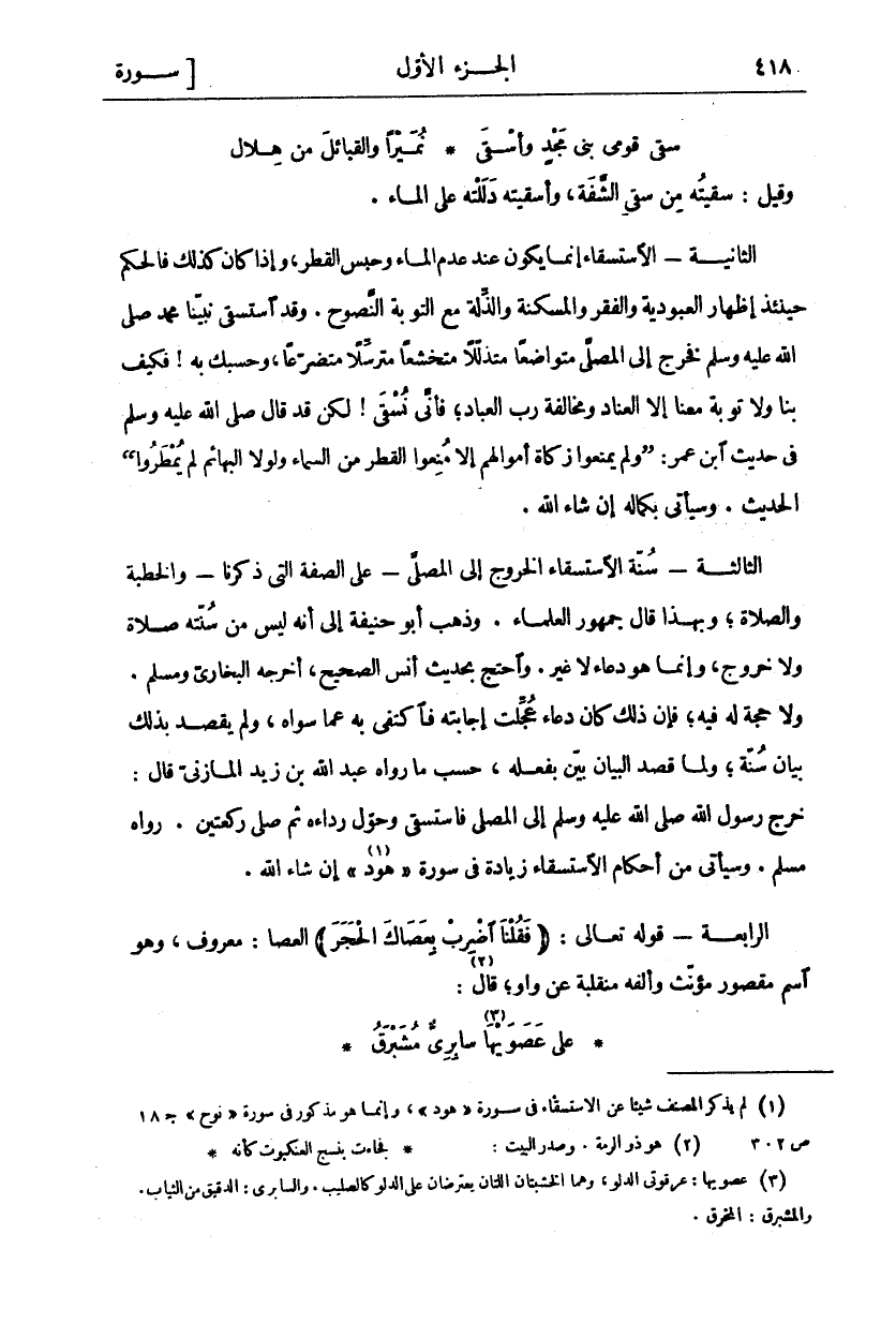 وَقِيلَ: سَقَيْتُهُ مِنْ سَقْيِ الشَّفَةِ وَأَسْقَيْتُهُ دَلَلْتُهُ عَلَى الْمَاءِ. الثَّانِيَةُ- الِاسْتِسْقَاءُ إِنَّمَا يَكُونُ عِنْدَ عُدْمِ الْمَاءِ وَحَبْسِ الْقَطْرِ وَإِذَا كَانَ كَذَلِكَ فَالْحُكْمُ حِينَئِذٍ إِظْهَارُ الْعُبُودِيَّةِ وَالْفَقْرِ وَالْمَسْكَنَةِ وَالذِّلَّةِ مَعَ التَّوْبَةِ النَّصُوحِ. وَقَدِ اسْتَسْقَى نَبِيُّنَا مُحَمَّدٌ صَلَّى اللَّهُ عَلَيْهِ وَسَلَّمَ فَخَرَجَ إِلَى الْمُصَلَّى مُتَوَاضِعًا مُتَذَلِّلًا مُتَخَشِّعًا مُتَرَسِّلًا مُتَضَرِّعًا وَحَسْبُكَ بِهِ! فَكَيْفَ بِنَا وَلَا تَوْبَةَ مَعَنَا إِلَّا الْعِنَادَ وَمُخَالَفَةَ رَبِّ الْعِبَادِ فَأَنَّى نُسْقَى! لَكِنْ قَدْ قَالَ صَلَّى اللَّهُ عَلَيْهِ وَسَلَّمَ فِي حَدِيثِ ابْنِ عُمَرَ (وَلَمْ يَمْنَعُوا زَكَاةَ أَمْوَالِهِمْ إِلَّا مُنِعُوا الْقَطْرَ مِنَ السَّمَاءِ وَلَوْلَا الْبَهَائِمُ لَمْ يُمْطَرُوا) الْحَدِيثَ. وَسَيَأْتِي بِكَمَالِهِ إِنْ شَاءَ اللَّهُ. الثَّالِثَةُ- سُنَّةُ الِاسْتِسْقَاءِ الْخُرُوجُ إِلَى الْمُصَلَّى- عَلَى الصِّفَةِ الَّتِي ذَكَرْنَا- وَالْخُطْبَةُ وَالصَّلَاةُ وَبِهَذَا قَالَ جُمْهُورُ الْعُلَمَاءِ. وَذَهَبَ أَبُو حَنِيفَةَ إِلَى أَنَّهُ لَيْسَ مِنْ سُنَّتِهِ صَلَاةٌ وَلَا خُرُوجٌ وَإِنَّمَا هُوَ دُعَاءٌ لَا غَيْرُ. وَاحْتَجَّ بِحَدِيثِ أَنَسٍ الصَّحِيحِ أَخْرَجَهُ الْبُخَارِيُّ وَمُسْلِمٌ. وَلَا حُجَّةَ لَهُ فِيهِ فَإِنَّ ذَلِكَ كَانَ دُعَاءٌ عُجِّلَتْ إِجَابَتُهُ فَاكْتُفِيَ بِهِ عَمَّا سِوَاهُ وَلَمْ يَقْصِدْ بِذَلِكَ بَيَانَ سُنَّةٍ وَلَمَّا قَصَدَ الْبَيَانَ بَيَّنَ بِفِعْلِهِ حَسَبَ مَا رَوَاهُ عَبْدُ اللَّهِ بن زيد الْمَازِنِيُّ قَالَ: خَرَجَ رَسُولُ اللَّهِ صَلَّى اللَّهُ عَلَيْهِ وَسَلَّمَ إِلَى الْمُصَلَّى فَاسْتَسْقَى وَحَوَّلَ رِدَاءَهُ ثُمَّ صَلَّى رَكْعَتَيْنِ. رَوَاهُ مُسْلِمٌ. وَسَيَأْتِي مِنْ أَحْكَامِ الِاسْتِسْقَاءِ زِيَادَةٌ فِي سُورَةِ" هُودٍ" «١» إِنْ شَاءَ اللَّهُ. الرَّابِعَةُ- قَوْلُهُ تَعَالَى: (فَقُلْنَا اضْرِبْ بِعَصاكَ الْحَجَرَ) الْعَصَا: مَعْرُوفٌ وَهُوَ اسْمٌ مَقْصُورٌ مُؤَنَّثٌ وَأَلِفُهُ مُنْقَلِبَةٌ عَنْ وَاوٍ، قَالَ: «٢»
