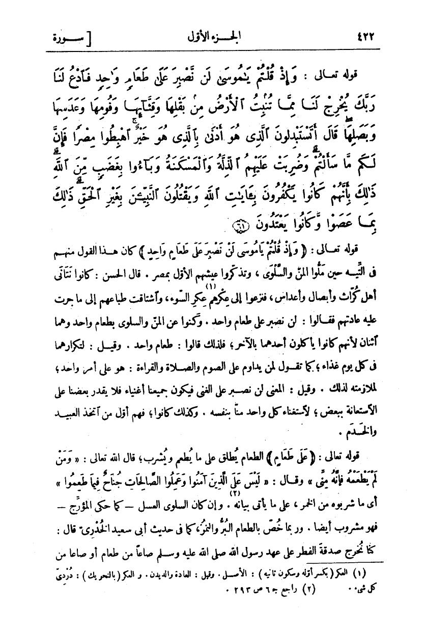 قَوْلُهُ تَعَالَى: (وَإِذْ قُلْتُمْ يَا مُوسى لَنْ نَصْبِرَ عَلى طَعامٍ واحِدٍ) كَانَ هَذَا الْقَوْلُ مِنْهُمْ فِي التِّيهِ حِينَ مَلُّوا الْمَنَّ وَالسَّلْوَى وَتَذَكَّرُوا عَيْشَهُمُ الْأَوَّلَ بِمِصْرَ. قَالَ الْحَسَنُ: كَانُوا نَتَانَى أَهْلَ كُرَّاثٍ وَأَبْصَالٍ وَأَعْدَاسٍ فَنَزَعُوا إِلَى عِكْرِهِمْ «١» عِكْرِ السُّوءِ وَاشْتَاقَتْ طِبَاعُهُمْ إِلَى مَا جَرَتْ عَلَيْهِ عَادَتُهُمْ فَقَالُوا: لَنْ نَصْبِرَ عَلى طَعامٍ واحِدٍ. وَكَنَّوْا عَنِ الْمَنِّ وَالسَّلْوَى بِطَعَامٍ وَاحِدٍ وَهُمَا اثْنَانِ لِأَنَّهُمْ كَانُوا يَأْكُلُونَ أَحَدَهُمَا بِالْآخَرِ فَلِذَلِكَ قَالُوا: طَعَامٌ وَاحِدٌ. وَقِيلَ: لِتَكْرَارِهِمَا فِي كُلِّ يَوْمٍ غِذَاءً كَمَا تَقُولُ لِمَنْ يُدَاوِمُ عَلَى الصَّوْمِ وَالصَّلَاةِ وَالْقِرَاءَةِ هُوَ عَلَى أَمْرٍ وَاحِدٍ لِمُلَازَمَتِهِ لِذَلِكَ. وَقِيلَ الْمَعْنَى لَنْ نَصْبِرَ عَلَى الْغِنَى فَيَكُونُ جَمِيعُنَا أَغْنِيَاءُ فَلَا يَقْدِرُ بَعْضُنَا عَلَى الِاسْتِعَانَةِ بِبَعْضٍ لِاسْتِغْنَاءِ كُلِّ وَاحِدٍ مِنَّا بِنَفْسِهِ. وَكَذَلِكَ كَانُوا فَهُمْ أَوَّلُ مَنِ اتَّخَذَ الْعَبِيدَ وَالْخَدَمَ. قَوْلُهُ تَعَالَى: (عَلى طَعامٍ) الطَّعَامُ يُطْلَقُ عَلَى مَا يُطْعَمُ وَيُشْرَبُ قَالَ اللَّهُ تَعَالَى" وَمَنْ لَمْ يَطْعَمْهُ فَإِنَّهُ مِنِّي" وَقَالَ" لَيْسَ عَلَى الَّذِينَ آمَنُوا وَعَمِلُوا الصَّالِحاتِ جُناحٌ فِيما طَعِمُوا" [المائدة: ٩٣] أَيْ مَا شَرِبُوهُ مِنَ الْخَمْرِ عَلَى مَا يَأْتِي بَيَانُهُ «٢». وَإِنْ كَانَ السَّلْوَى الْعَسَلُ- كَمَا حَكَى الْمُؤَرِّجُ- فَهُوَ مَشْرُوبٌ أَيْضًا. وَرُبَّمَا خُصَّ بِالطَّعَامِ الْبُرُّ وَالتَّمْرُ كَمَا فِي حَدِيثِ أَبِي سَعِيدٍ الْخُدْرِيِّ قَالَ: كُنَّا نُخْرِجُ صَدَقَةَ الْفِطْرِ عَلَى عَهْدِ رَسُولِ اللَّهِ صَلَّى اللَّهُ عَلَيْهِ وَسَلَّمَ صَاعًا مِنْ طَعَامٍ أَوْ صَاعًا مِنْ
