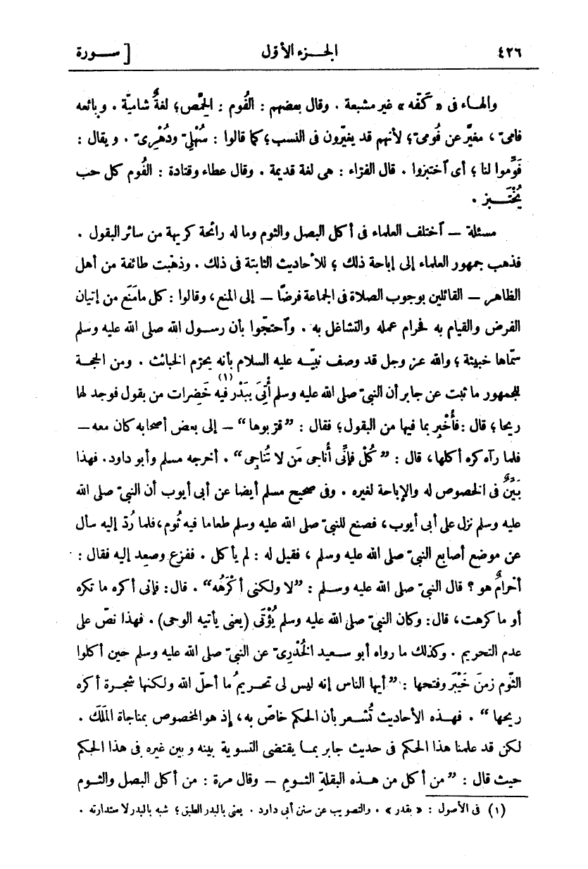 وَالْهَاءُ فِي" كَفِّهِ" غَيْرُ مُشْبَعَةٍ وَقَالَ بَعْضُهُمْ الْفُومُ الْحِمَّصُ لُغَةٌ شَامِيَّةٌ وَبَائِعُهُ فَامِيٌّ، مُغَيَّرٌ عَنْ فُومِيٍّ لِأَنَّهُمْ قَدْ يُغَيِّرُونَ فِي النَّسَبِ، كَمَا قَالُوا سُهْلِيٌّ وَدُهْرِيٌّ. وَيُقَالُ: فَوِّمُوا لَنَا أي اختبزوا. قال القراء: هِيَ لُغَةٌ قَدِيمَةٌ. وَقَالَ عَطَاءٌ وَقَتَادَةُ: الْفُومُ كُلُّ حَبٍّ يُخْتَبَزُ. مَسْأَلَةٌ- اخْتَلَفَ الْعُلَمَاءُ فِي أَكْلِ الْبَصَلِ وَالثُّومِ وَمَا لَهُ رَائِحَةٌ كَرِيهَةٌ مِنْ سَائِرِ الْبُقُولِ. فَذَهَبَ جُمْهُورُ الْعُلَمَاءِ إِلَى إِبَاحَةِ ذَلِكَ، لِلْأَحَادِيثِ الثَّابِتَةِ فِي ذَلِكَ. وَذَهَبَتْ طَائِفَةٌ مِنْ أَهْلِ الظَّاهِرِ الْقَائِلِينَ بِوُجُوبِ الصَّلَاةِ فِي الْجَمَاعَةِ فَرْضًا- إِلَى الْمَنْعِ، وَقَالُوا: كُلُّ مَا مَنَعَ مِنْ إِتْيَانِ الْفَرْضِ وَالْقِيَامِ بِهِ فَحَرَامٌ عَمَلُهُ وَالتَّشَاغُلُ بِهِ. وَاحْتَجُّوا بِأَنَّ رَسُولَ اللَّهِ صَلَّى اللَّهُ عَلَيْهِ وَسَلَّمَ سَمَّاهَا خَبِيثَةً، وَاللَّهُ عَزَّ وَجَلَّ قَدْ وَصَفَ نَبِيَّهُ عَلَيْهِ السَّلَامُ بِأَنَّهُ يُحَرِّمُ الْخَبَائِثَ. وَمِنَ الْحُجَّةِ لِلْجُمْهُورِ مَا ثَبَتَ عَنْ جَابِرٍ أَنَّ النَّبِيَّ صَلَّى اللَّهُ عَلَيْهِ وَسَلَّمَ أُتِيَ بِبَدْرٍ فِيهِ «١» خَضِرَاتٌ مِنْ بُقُولٍ فَوَجَدَ لَهَا رِيحًا، قَالَ: فَأُخْبِرَ بِمَا فِيهَا مِنَ الْبُقُولِ، فَقَالَ (قَرِّبُوهَا) إِلَى بَعْضِ أَصْحَابِهِ كَانَ مَعَهُ فَلَمَّا رَآهُ كَرِهَ أَكْلَهَا، قَالَ: (كُلْ فَإِنِّي أُنَاجِي مَنْ لَا تُنَاجِي). أَخْرَجَهُ مُسْلِمٌ وَأَبُو دَاوُدَ. فَهَذَا بَيِّنٌ فِي الْخُصُوصِ لَهُ وَالْإِبَاحَةِ لِغَيْرِهِ. وَفِي صَحِيحِ مُسْلِمٍ أَيْضًا عَنْ أَبِي أَيُّوبَ أَنَّ النَّبِيَّ صَلَّى اللَّهُ عَلَيْهِ وَسَلَّمَ نَزَلَ عَلَى أَبِي أَيُّوبَ، فَصَنَعَ لِلنَّبِيِّ صَلَّى اللَّهُ عَلَيْهِ وَسَلَّمَ طَعَامًا فِيهِ ثُومٌ، فَلَمَّا رُدَّ إِلَيْهِ سَأَلَ عَنْ مَوْضِعِ أَصَابِعِ النَّبِيِّ صَلَّى اللَّهُ عَلَيْهِ وَسَلَّمَ، فَقِيلَ لَهُ: لَمْ يَأْكُلْ. فَفَزِعَ وَصَعِدَ إِلَيْهِ فَقَالَ: أَحَرَامٌ هُوَ؟ قَالَ النَّبِيُّ صَلَّى اللَّهُ عَلَيْهِ وَسَلَّمَ: (لَا وَلَكِنِّي أَكْرَهُهُ). قَالَ فَإِنِّي أَكْرَهُ مَا تَكْرَهُ أَوْ مَا كَرِهْتَ، قَالَ: وَكَانَ النَّبِيُّ صَلَّى اللَّهُ عَلَيْهِ وَسَلَّمَ يُؤْتَى (يَعْنِي يَأْتِيهِ الْوَحْيُ) فَهَذَا نَصٌّ عَلَى عَدَمِ التَّحْرِيمِ. وَكَذَلِكَ مَا رَوَاهُ أَبُو سَعِيدٍ الْخُدْرِيُّ عَنِ النَّبِيِّ صَلَّى اللَّهُ عَلَيْهِ وَسَلَّمَ حِينَ أَكَلُوا الثُّومَ زَمَنَ خَيْبَرَ وَفَتْحِهَا: (أَيُّهَا النَّاسُ إِنَّهُ لَيْسَ لِي تَحْرِيمُ مَا أَحَلَّ اللَّهُ وَلَكِنَّهَا شَجَرَةٌ أَكْرَهُ رِيحَهَا). فَهَذِهِ الْأَحَادِيثُ تُشْعِرُ بِأَنَّ الْحُكْمَ خَاصٌّ بِهِ، إِذْ هُوَ الْمَخْصُوصُ بِمُنَاجَاةِ الْمَلَكِ. لَكِنْ قَدْ عَلِمْنَا هَذَا الْحُكْمَ فِي حَدِيثِ جَابِرٍ بِمَا يَقْتَضِي التَّسْوِيَةَ بَيْنَهُ وَبَيْنَ غَيْرِهِ فِي هَذَا الْحُكْمِ حَيْثُ قَالَ: (مَنْ أَكَلَ مِنْ هَذِهِ الْبَقْلَةِ الثُّومِ وقال مرة: من أكل البصل والثوم