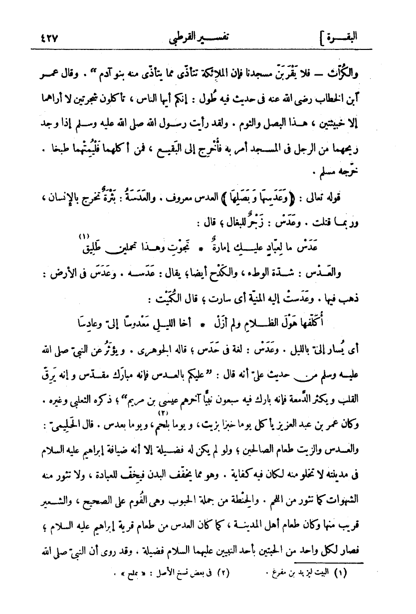 أَيْ يُسَارُ إِلَيَّ بِاللَّيْلِ. وَعَدَسٌ: لُغَةٌ فِي حَدَسٍ، قَالَهُ الْجَوْهَرِيُّ. وَيُؤْثَرُ عَنِ النَّبِيِّ صَلَّى اللَّهُ عَلَيْهِ وَسَلَّمَ مِنْ حَدِيثِ عَلِيٍّ أَنَّهُ قَالَ: (عَلَيْكُمْ بِالْعَدَسِ فَإِنَّهُ مُبَارَكٌ مُقَدَّسٌ وَإِنَّهُ يُرِقُّ الْقَلْبَ وَيُكْثِرُ الدَّمْعَةَ فَإِنَّهُ بَارَكَ فِيهِ سَبْعُونَ نَبِيًّا آخِرُهُمْ عِيسَى ابْنُ مَرْيَمَ)، ذَكَرَهُ الثَّعْلَبِيُّ وَغَيْرُهُ. وَكَانَ عُمَرُ بْنُ عَبْدِ الْعَزِيزِ يَأْكُلُ يَوْمًا خُبْزًا بِزَيْتٍ، وَيَوْمًا بِلَحْمٍ «٢»، وَيَوْمًا بِعَدَسٍ. قَالَ الْحَلِيمِيُّ: وَالْعَدَسُ وَالزَّيْتُ طَعَامُ الصَّالِحِينَ، وَلَوْ لَمْ يَكُنْ لَهُ فَضِيلَةٌ إِلَّا أَنَّهُ ضِيَافَةُ إِبْرَاهِيمَ عَلَيْهِ السَّلَامُ فِي مَدِينَتِهِ لَا تَخْلُو مِنْهُ لَكَانَ فِيهِ كِفَايَةٌ. وَهُوَ مِمَّا يُخَفِّفُ الْبَدَنَ فيخف للعبادة، ولا تَثُورُ مِنْهُ الشَّهَوَاتُ كَمَا تَثُورُ مِنَ اللَّحْمِ. وَالْحِنْطَةُ مِنْ جُمْلَةِ الْحُبُوبِ وَهِيَ الْفُومُ عَلَى الصَّحِيحِ، وَالشَّعِيرُ قَرِيبٌ مِنْهَا وَكَانَ طَعَامَ أَهْلِ الْمَدِينَةِ، كَمَا كَانَ الْعَدَسُ مِنْ طَعَامِ قَرْيَةِ إِبْرَاهِيمَ عَلَيْهِ السَّلَامُ، فَصَارَ لِكُلِّ وَاحِدٍ مِنَ الْحَبَّتَيْنِ بِأَحَدِ النَّبِيَّيْنِ عَلَيْهِمَا السَّلَامُ فَضِيلَةٌ. وَقَدْ روي أن النبي صلى الله
