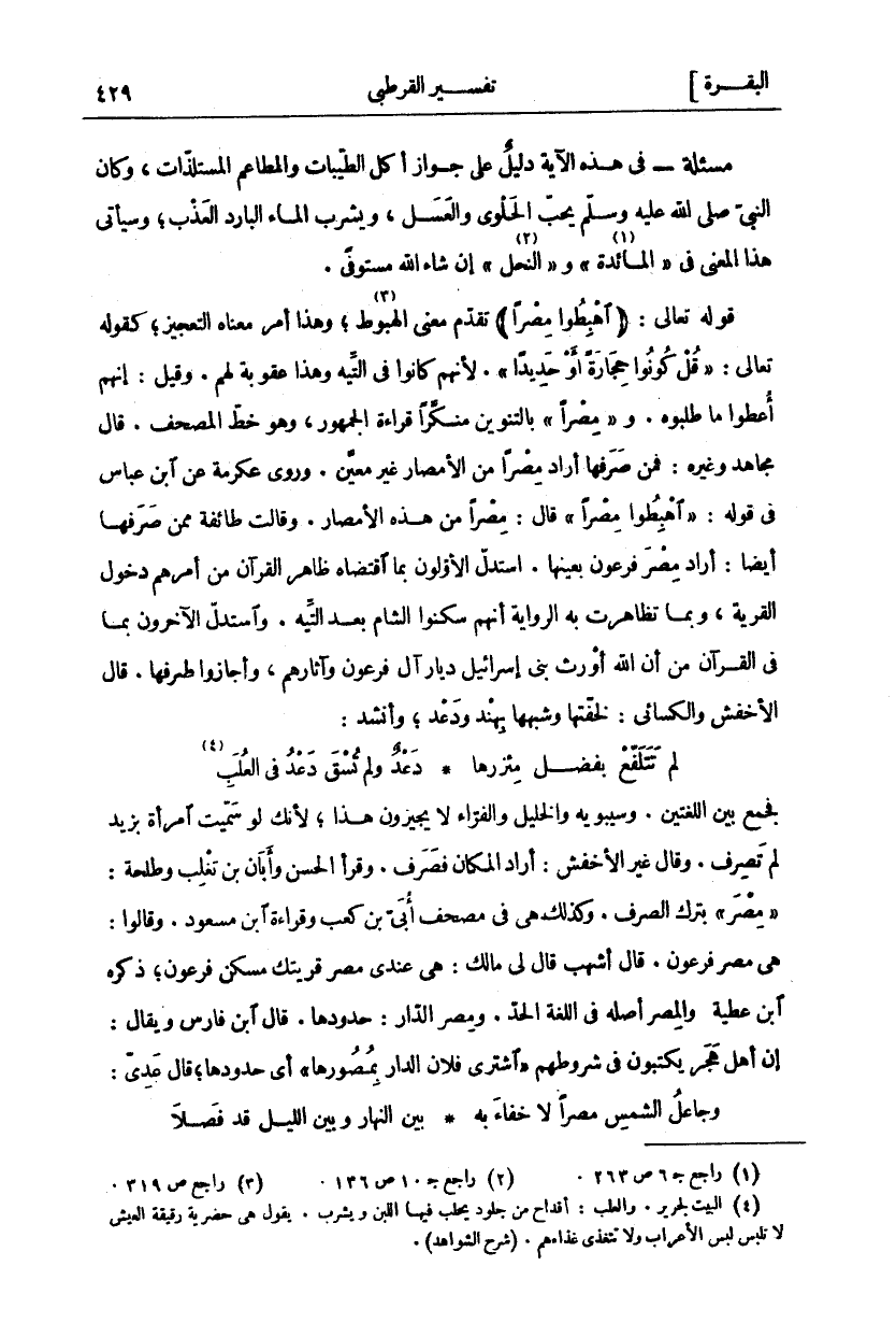فَجَمَعَ بَيْنَ اللُّغَتَيْنِ. وَسِيبَوَيْهِ وَالْخَلِيلُ وَالْفَرَّاءُ لَا يُجِيزُونَ هَذَا، لِأَنَّكَ لَوْ سَمَّيْتَ امْرَأَةً بِزَيْدٍ لَمْ تَصْرِفْ. وَقَالَ غَيْرُ الْأَخْفَشِ: أَرَادَ الْمَكَانَ فَصَرَفَ. وَقَرَأَ الْحَسَنُ وَأَبَانُ بْنُ تَغْلِبَ وَطَلْحَةُ:" مِصْرَ" بِتَرْكِ الصَّرْفِ. وَكَذَلِكَ هِيَ فِي مُصْحَفِ أُبَيِّ بْنِ كَعْبٍ وَقِرَاءَةِ ابْنِ مَسْعُودٍ. وَقَالُوا: هِيَ مِصْرُ فِرْعَوْنَ. قَالَ أَشْهَبُ قَالَ لِي مَالِكٌ: هِيَ عِنْدِي مِصْرُ قَرْيَتُكَ مَسْكَنُ فِرْعَوْنَ، ذَكَرَهُ ابْنُ عَطِيَّةَ وَالْمِصْرُ أَصْلُهُ فِي اللُّغَةِ الْحَدُّ. وَمِصْرُ الدَّارِ: حُدُودُهَا. قَالَ ابْنُ فَارِسٍ وَيُقَالُ: إِنَّ أَهْلَ هَجَرَ يَكْتُبُونَ فِي شُرُوطِهِمْ" اشْتَرَى فُلَانٌ الدَّارَ بِمُصُورِهَا" أَيْ حُدُودِهَا، قَالَ عَدِيٌّ: