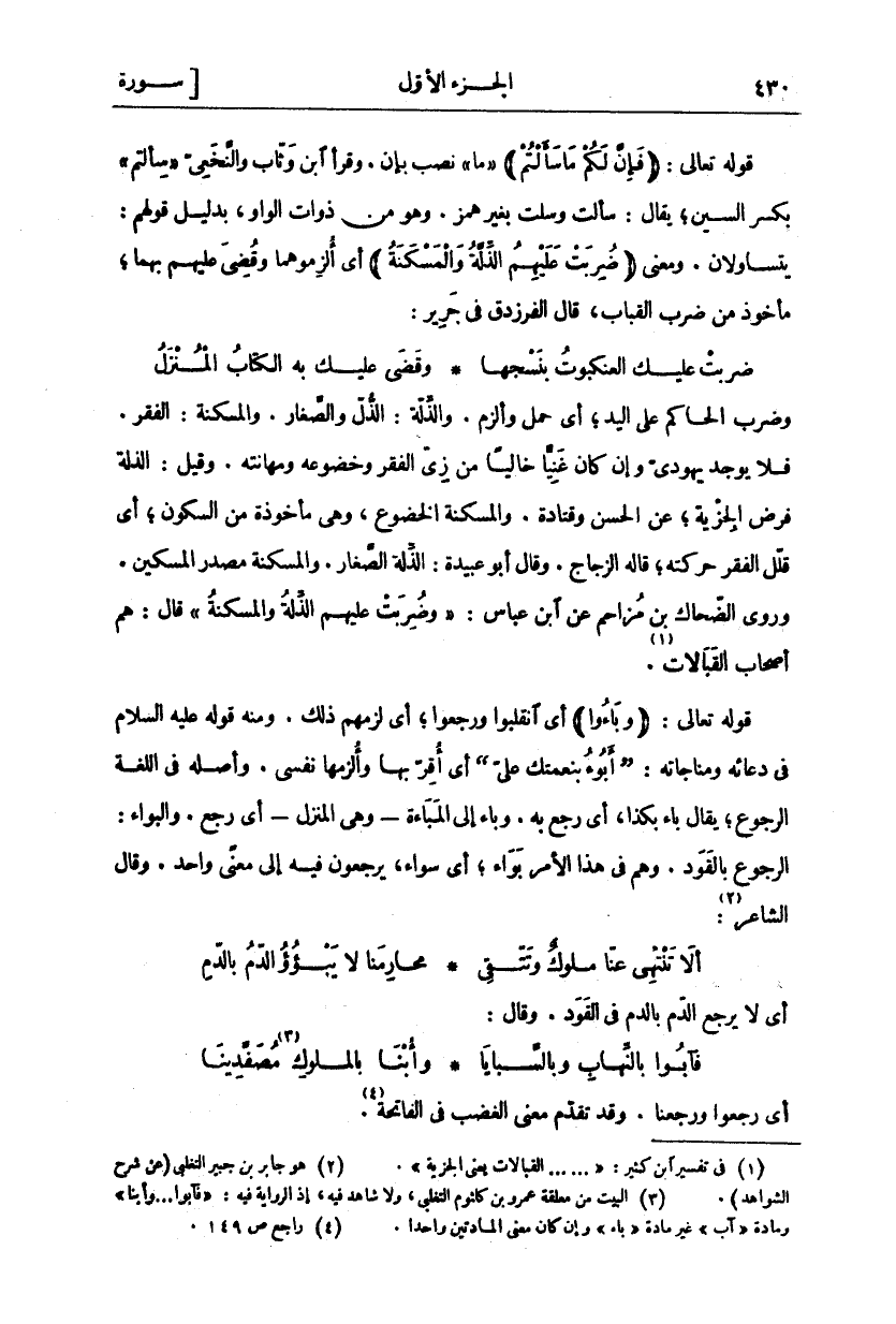 وَضَرَبَ الْحَاكِمُ عَلَى الْيَدِ، أَيْ حَمَلَ وَأَلْزَمَ. وَالذِّلَّةُ: الذُّلُّ وَالصَّغَارُ. وَالْمَسْكَنَةُ: الْفَقْرُ. فَلَا يُوجَدُ يَهُودِيٌّ وَإِنْ كَانَ غَنِيًّا خَالِيًا مِنْ زِيِّ الْفَقْرِ وَخُضُوعِهِ وَمَهَانَتِهِ. وَقِيلَ: الذِّلَّةُ فَرْضُ الْجِزْيَةِ، عَنِ الْحَسَنِ وَقَتَادَةَ. وَالْمَسْكَنَةُ الْخُضُوعُ، وَهِيَ مَأْخُوذَةٌ مِنَ السُّكُونِ، أَيْ قَلَّلَ الْفَقْرُ حَرَكَتَهُ، قَالَهُ الزَّجَّاجُ. وَقَالَ أَبُو عُبَيْدَةَ: الذِّلَّةُ الصَّغَارُ. وَالْمَسْكَنَةُ مَصْدَرُ الْمِسْكِينِ. وَرَوَى الضَّحَّاكُ بْنُ مُزَاحِمٍ عَنِ ابْنِ عَبَّاسٍ:" وَضُرِبَتْ عَلَيْهِمُ الذِّلَّةُ وَالْمَسْكَنَةُ" قَالَ: هُمْ أَصْحَابُ الْقَبَالَاتِ «١». قوله تعالى: (وَباؤُ) أَيِ انْقَلَبُوا وَرَجَعُوا، أَيْ لَزِمَهُمْ ذَلِكَ. وَمِنْهُ قول عَلَيْهِ السَّلَامُ فِي دُعَائِهِ وَمُنَاجَاتِهِ: (أَبُوءُ بِنِعْمَتِكَ عَلَيَّ) أَيْ أُقِرُّ بِهَا وَأُلْزِمُهَا نَفْسِي. وَأَصْلُهُ فِي اللُّغَةِ الرُّجُوعُ، يُقَالُ بَاءَ بِكَذَا، أَيْ رَجَعَ بِهِ، وَبَاءَ إِلَى الْمَبَاءَةِ وَهِيَ الْمَنْزِلُ أَيْ رَجَعَ. وَالْبَوَاءُ: الرُّجُوعُ بِالْقَوَدِ. وَهُمْ فِي هَذَا الْأَمْرِ بَوَاءٌ، أَيْ سَوَاءٌ، يَرْجِعُونَ فِيهِ إِلَى مَعْنًى وَاحِدٍ. وَقَالَ الشَّاعِرُ: «٢»