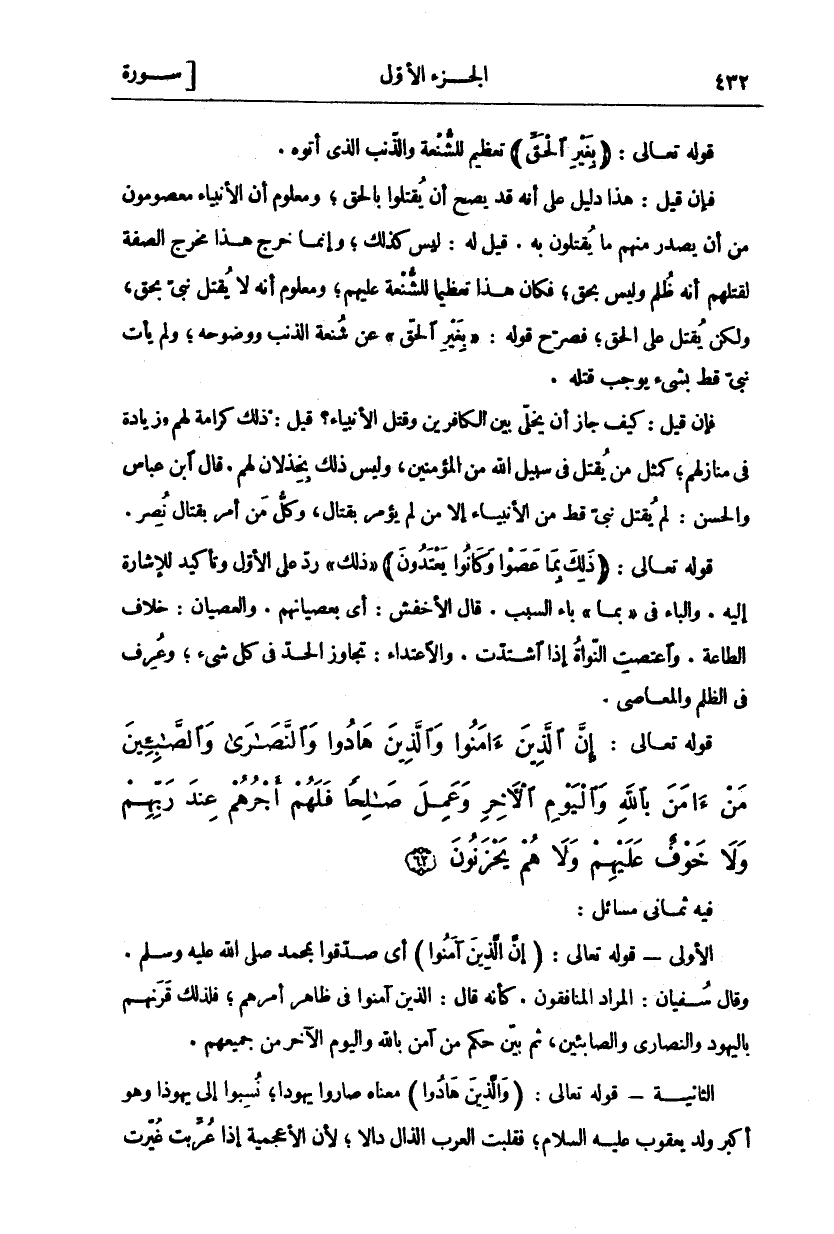 قَوْلُهُ تَعَالَى: (بِغَيْرِ الْحَقِّ) تَعْظِيمٌ لِلشُّنْعَةِ وَالذَّنْبِ الَّذِي أَتَوْهُ. فَإِنْ قِيلَ: هَذَا دَلِيلٌ عَلَى أَنَّهُ قَدْ يَصِحُّ أَنْ يُقْتَلُوا بِالْحَقِّ، وَمَعْلُومٌ أَنَّ الْأَنْبِيَاءَ مَعْصُومُونَ مِنْ أَنْ يَصْدُرَ مِنْهُمْ مَا يُقْتَلُونَ بِهِ. قِيلَ لَهُ: لَيْسَ كَذَلِكَ، وَإِنَّمَا خَرَجَ هَذَا مَخْرَجَ الصِّفَةِ لِقَتْلِهِمْ أَنَّهُ ظُلْمٌ وَلَيْسَ بِحَقٍّ، فَكَانَ هَذَا تَعْظِيمًا لِلشُّنْعَةِ عَلَيْهِمْ، وَمَعْلُومٌ أَنَّهُ لَا يُقْتَلُ نَبِيٌّ بِحَقٍّ، وَلَكِنْ يُقْتَلُ عَلَى الْحَقِّ، فَصَرَّحَ قَوْلُهُ:" بِغَيْرِ الْحَقِّ" عَنْ شُنْعَةِ الذَّنْبِ وَوُضُوحِهِ، وَلَمْ يَأْتِ نَبِيٌّ قَطُّ بِشَيْءٍ يُوجِبُ قَتْلَهُ. فَإِنْ قِيلَ: كَيْفَ جَازَ أَنْ يُخَلِّيَ بَيْنَ الْكَافِرِينَ وَقَتْلِ الْأَنْبِيَاءِ؟ قِيلَ: ذَلِكَ كَرَامَةٌ لَهُمْ وَزِيَادَةٌ فِي مَنَازِلِهِمْ، كَمَثَلِ مَنْ يُقْتَلُ فِي سَبِيلِ اللَّهِ مِنَ الْمُؤْمِنِينَ، وَلَيْسَ ذَلِكَ بِخِذْلَانٍ لَهُمْ. قَالَ ابْنُ عَبَّاسٍ وَالْحَسَنُ: لَمْ يُقْتَلْ نَبِيٌّ قَطُّ مِنَ الْأَنْبِيَاءِ إِلَّا مَنْ لَمْ يُؤْمَرْ بِقِتَالٍ، وَكُلُّ مَنْ أُمِرَ بِقِتَالٍ نُصِرَ. قَوْلُهُ تَعَالَى: (ذلِكَ بِما عَصَوْا وَكانُوا يَعْتَدُونَ) " ذَلِكَ" رَدٌّ عَلَى الْأَوَّلِ وَتَأْكِيدٌ لِلْإِشَارَةِ إِلَيْهِ. وَالْبَاءُ فِي" بِمَا" بَاءُ السَّبَبِ. قَالَ الْأَخْفَشُ: أَيْ بِعِصْيَانِهِمْ. وَالْعِصْيَانُ: خِلَافُ الطَّاعَةِ. وَاعْتَصَتِ النَّوَاةُ إِذَا اشْتَدَّتْ. والاعتداء: تجاوز الحد في كل شي، وعرف في الظلم والمعاصي.
