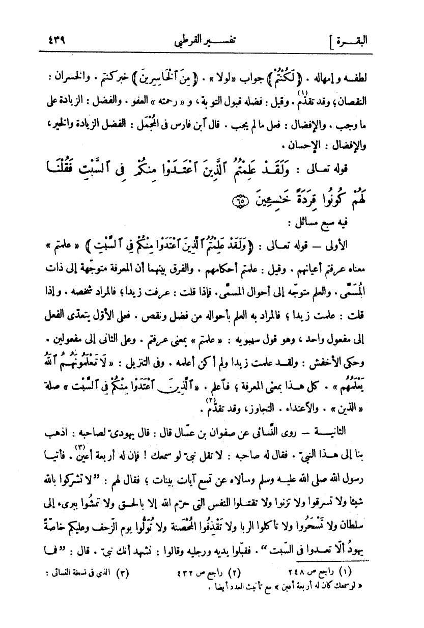 قَوْلُهُ تَعَالَى: وَلَقَدْ عَلِمْتُمُ الَّذِينَ اعْتَدَوْا مِنْكُمْ فِي السَّبْتِ فَقُلْنا لَهُمْ كُونُوا قِرَدَةً خاسِئِينَ (٦٥) فِيهِ سَبْعُ مَسَائِلَ: الْأُولَى- قَوْلُهُ تَعَالَى: (وَلَقَدْ عَلِمْتُمُ الَّذِينَ اعْتَدَوْا مِنْكُمْ فِي السَّبْتِ) " عَلِمْتُمُ" مَعْنَاهُ عَرَفْتُمْ أَعْيَانَهُمْ. وَقِيلَ: عَلِمْتُمْ أَحْكَامَهُمْ. وَالْفَرْقُ بَيْنَهُمَا أَنَّ الْمَعْرِفَةَ مُتَوَجِّهَةٌ إِلَى ذَاتِ الْمُسَمَّى. وَالْعِلْمُ مُتَوَجِّهٌ إِلَى أَحْوَالِ الْمُسَمَّى. فَإِذَا قُلْتَ: عَرَفْتُ زَيْدًا، فَالْمُرَادُ شَخْصُهُ. وَإِذَا قُلْتَ: عَلِمْتُ زَيْدًا، فَالْمُرَادُ بِهِ الْعِلْمُ بِأَحْوَالِهِ مِنْ فَضْلٍ وَنَقْصٍ. فَعَلَى الْأَوَّلِ يَتَعَدَّى الْفِعْلُ إِلَى مَفْعُولٍ وَاحِدٍ، وَهُوَ قَوْلُ سِيبَوَيْهِ:" عَلِمْتُمُ" بِمَعْنَى عَرَفْتُمْ. وَعَلَى الثَّانِي إِلَى مَفْعُولَيْنِ. وَحَكَى الْأَخْفَشُ: وَلَقَدْ عَلِمْتُ زَيْدًا وَلَمْ أَكُنْ أَعْلَمُهُ. وَفِي التَّنْزِيلِ:" لا تَعْلَمُونَهُمُ اللَّهُ يَعْلَمُهُمْ" [الأنفال: ٦٠]. كُلُّ هَذَا بِمَعْنَى الْمَعْرِفَةِ، فَاعْلَمْ." الَّذِينَ اعْتَدَوْا مِنْكُمْ فِي السَّبْتِ" [البقرة: ٦٥] صِلَةُ" الَّذِينَ". وَالِاعْتِدَاءُ. التَّجَاوُزُ، وَقَدْ تَقَدَّمَ «٢». الثَّانِيَةُ- رَوَى النَّسَائِيُّ عَنْ صَفْوَانَ بْنِ عَسَّالٍ قَالَ: قَالَ يَهُودِيٌّ لِصَاحِبِهِ: اذْهَبْ بِنَا إِلَى هَذَا النَّبِيِّ. فَقَالَ لَهُ صَاحِبُهُ: لَا تَقُلْ نَبِيٌّ لَوْ سَمِعَكَ! فَإِنَّ لَهُ أَرْبَعَةَ أَعْيُنٍ «٣». فَأَتَيَا رَسُولَ اللَّهِ صَلَّى اللَّهُ عَلَيْهِ وَسَلَّمَ وَسَأَلَاهُ عَنْ تِسْعِ آيَاتٍ بَيِّنَاتٍ، فَقَالَ لَهُمْ: (لَا تُشْرِكُوا بِاللَّهِ شَيْئًا وَلَا تَسْرِقُوا وَلَا تَزْنُوا وَلَا تَقْتُلُوا النَّفْسَ الَّتِي حَرَّمَ اللَّهُ إِلَّا بِالْحَقِّ وَلَا تمشوا ببري إِلَى سُلْطَانٍ وَلَا تَسْحَرُوا وَلَا تَأْكُلُوا الرِّبَا وَلَا تَقْذِفُوا الْمُحْصَنَةَ وَلَا تُوَلُّوا يَوْمَ الزَّحْفِ وَعَلَيْكُمْ خَاصَّةُ يَهُودَ أَلَّا تَعْدُوَا فِي السَّبْتِ (. فَقَبَّلُوا يَدَيْهِ وَرِجْلَيْهِ وَقَالُوا: نَشْهَدُ أَنَّكَ نَبِيٌّ. قال:) فما
