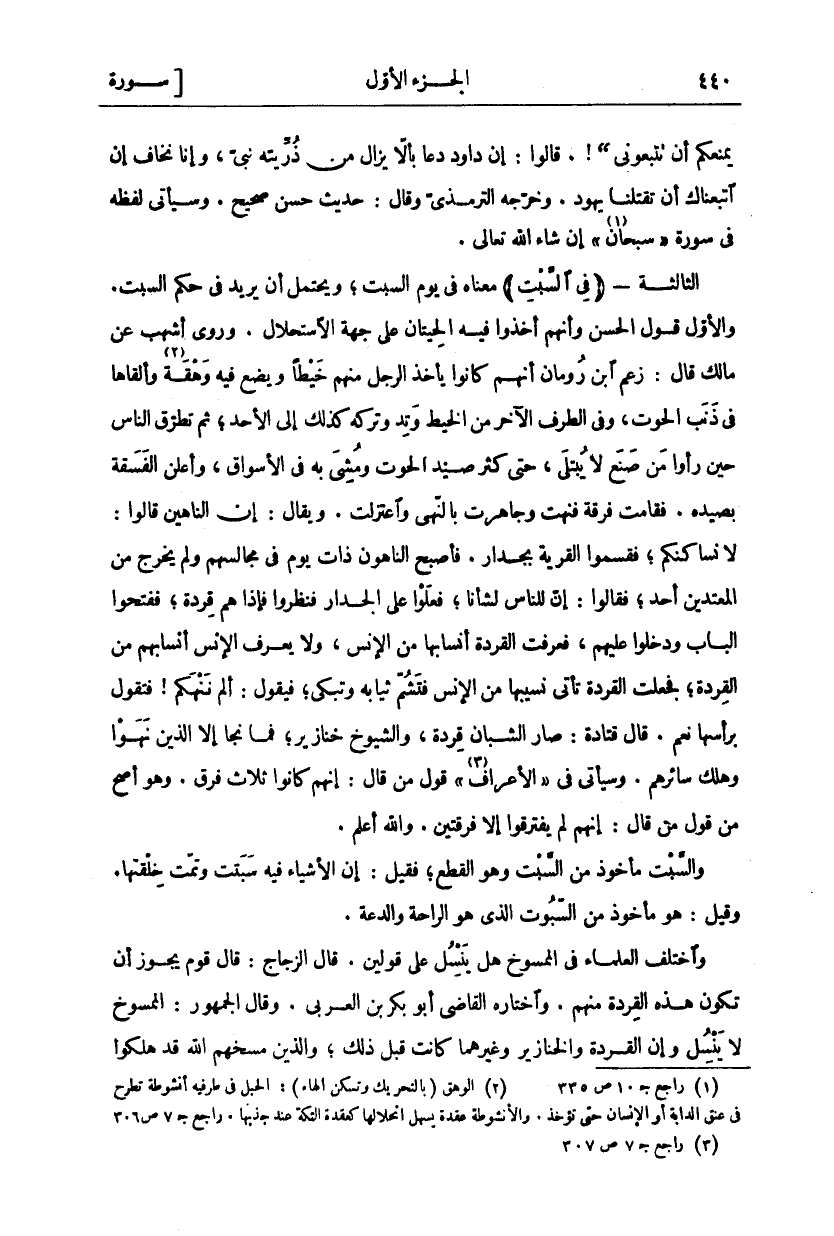 يَمْنَعُكُمْ أَنْ تَتَّبِعُونِي (!. قَالُوا: إِنَّ دَاوُدَ دَعَا بِأَلَّا يَزَالَ مِنْ ذُرِّيَّتِهِ نَبِيٌّ وَإِنَّا نَخَافُ إِنِ اتَّبَعْنَاكَ أَنْ تَقْتُلَنَا يَهُودُ. وَخَرَّجَهُ التِّرْمِذِيُّ وَقَالَ: حَدِيثٌ حَسَنٌ صَحِيحٌ. وَسَيَأْتِي لَفْظُهُ فِي سُورَةِ" سُبْحَانَ" «١» إِنْ شَاءَ اللَّهُ تَعَالَى. الثَّالِثَةُ- (فِي السَّبْتِ) مَعْنَاهُ فِي يَوْمِ السَّبْتِ، وَيُحْتَمَلُ أَنْ يُرِيدَ فِي حُكْمِ السَّبْتِ. وَالْأَوَّلُ قَوْلُ الْحَسَنِ وَأَنَّهُمْ أَخَذُوا فِيهِ الْحِيتَانَ عَلَى جِهَةِ الِاسْتِحْلَالِ. وَرَوَى أَشْهَبُ عَنْ مَالِكٍ قَالَ: زَعَمَ ابْنُ رُومَانَ أَنَّهُمْ كَانُوا يَأْخُذُ الرَّجُلُ مِنْهُمْ خَيْطًا وَيَضَعُ فِيهِ وَهْقَةً «٢» وَأَلْقَاهَا فِي ذَنَبِ الْحُوتِ، وَفِي الطَّرَفِ الْآخَرِ مِنَ الْخَيْطِ وَتَدٌ وَتَرَكَهُ كَذَلِكَ إِلَى الْأَحَدِ، ثُمَّ تَطَرَّقَ النَّاسُ حِينَ رَأَوْا مَنْ صَنَعَ لَا يُبْتَلَى، حَتَّى كَثُرَ صَيْدُ الْحُوتِ وَمُشِيَ بِهِ فِي الْأَسْوَاقِ، وَأَعْلَنَ الْفَسَقَةُ بِصَيْدِهِ. فَقَامَتْ فِرْقَةٌ فَنَهَتْ وَجَاهَرَتْ بِالنَّهْيِ وَاعْتَزَلَتْ. وَيُقَالُ: إِنَّ النَّاهِينَ قَالُوا: لَا نُسَاكِنُكُمْ، فَقَسَمُوا الْقَرْيَةَ بِجِدَارٍ. فَأَصْبَحَ النَّاهُونَ ذَاتَ يَوْمٍ فِي مَجَالِسِهِمْ وَلَمْ يَخْرُجْ مِنَ الْمُعْتَدِينَ أَحَدٌ، فَقَالُوا: إِنَّ لِلنَّاسِ لَشَأْنًا، فَعَلَوْا عَلَى الْجِدَارِ فَنَظَرُوا فَإِذَا هُمْ قِرَدَةٌ، فَفَتَحُوا الْبَابَ وَدَخَلُوا عَلَيْهِمْ، فَعَرَفَتِ الْقِرَدَةُ أَنْسَابَهَا مِنَ الْإِنْسِ، وَلَا يَعْرِفُ الْإِنْسُ أَنْسَابَهُمْ مِنَ الْقِرَدَةِ، فَجَعَلَتِ الْقِرَدَةُ تَأْتِي نَسِيبَهَا مِنَ الْإِنْسِ فَتَشُمُّ ثِيَابَهُ وَتَبْكِي، فَيَقُولُ: أَلَمْ نَنْهَكُمْ! فَتَقُولُ بِرَأْسِهَا نَعَمْ. قَالَ قَتَادَةُ: صَارَ الشُّبَّانُ قِرَدَةً، وَالشُّيُوخُ خَنَازِيرَ، فَمَا نَجَا إِلَّا الَّذِينَ نَهَوْا وَهَلَكَ سَائِرُهُمْ. وَسَيَأْتِي فِي" الْأَعْرَافِ" «٣» قَوْلُ مَنْ قَالَ: إِنَّهُمْ كَانُوا ثَلَاثَ فِرَقٍ. وَهُوَ أَصَحُّ مِنْ قَوْلِ مَنْ قَالَ: إِنَّهُمْ لَمْ يَفْتَرِقُوا إِلَّا فِرْقَتَيْنِ. وَاللَّهُ أَعْلَمُ. وَالسَّبْتُ مَأْخُوذٌ مِنَ السَّبْتِ وَهُوَ القطع، فقيل: إن الأشياء فيه سَبَتَتْ وَتَمَّتْ خِلْقَتُهَا. وَقِيلَ: هُوَ مَأْخُوذٌ مِنَ السُّبُوتِ الَّذِي هُوَ الرَّاحَةُ وَالدَّعَةُ. وَاخْتَلَفَ الْعُلَمَاءُ فِي الْمَمْسُوخِ هَلْ يَنْسِلُ عَلَى قَوْلَيْنِ. قَالَ الزَّجَّاجُ: قَالَ قَوْمٌ يَجُوزُ أَنْ تَكُونَ هَذِهِ الْقِرَدَةُ مِنْهُمْ. وَاخْتَارَهُ الْقَاضِي أَبُو بَكْرِ بْنُ الْعَرَبِيِّ. وَقَالَ الْجُمْهُورُ: الْمَمْسُوخُ لَا يَنْسِلُ وَإِنَّ الْقِرَدَةَ وَالْخَنَازِيرَ وَغَيْرُهُمَا كَانَتْ قَبْلَ ذَلِكَ، وَالَّذِينَ مسخهم الله قد هلكوا