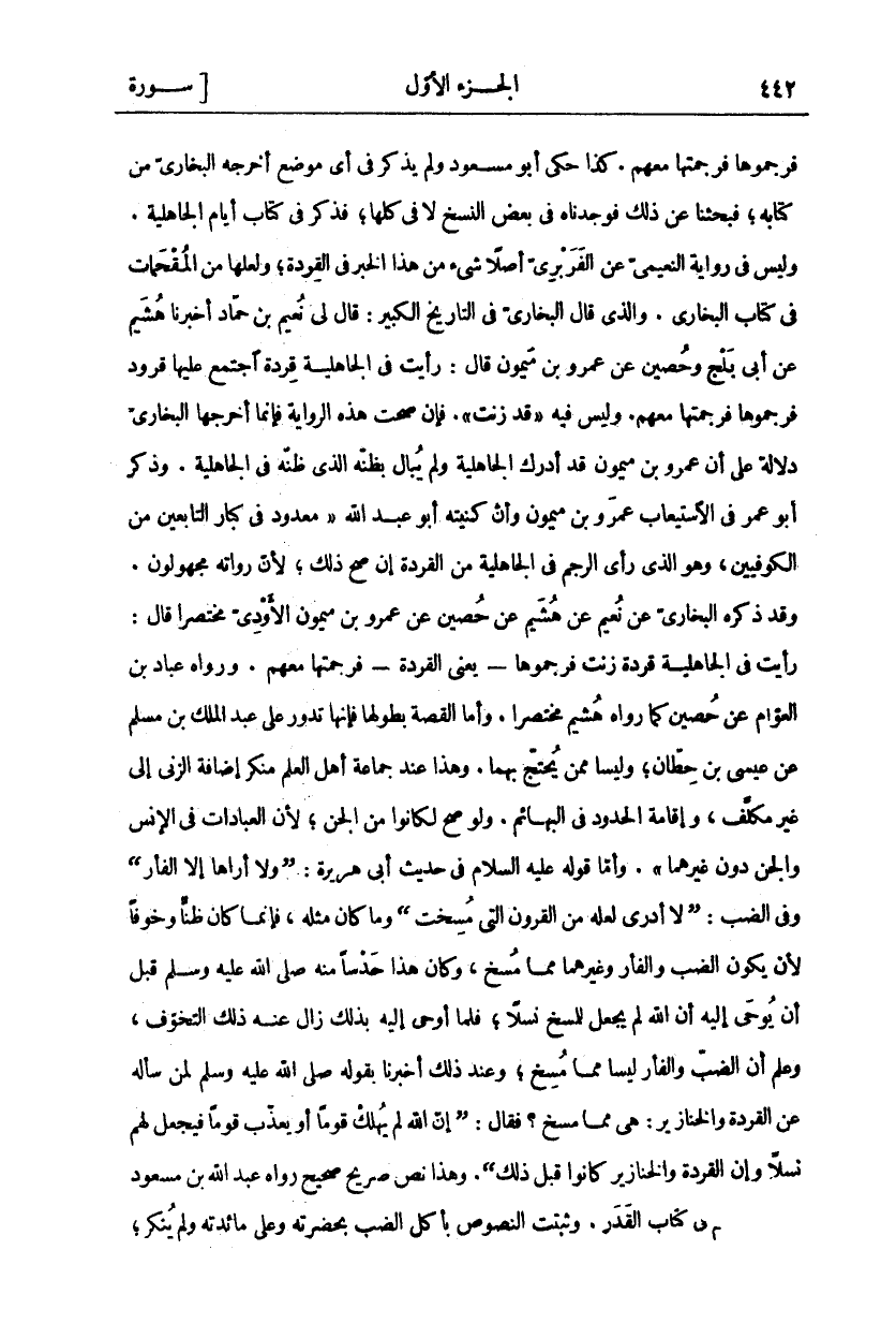 فَرَجَمُوهَا فَرَجَمْتُهَا مَعَهُمْ. كَذَا حَكَى أَبُو مَسْعُودٍ وَلَمْ يَذْكُرْ فِي أَيِّ مَوْضِعٍ أَخْرَجَهُ الْبُخَارِيُّ مِنْ كِتَابِهِ، فَبَحَثْنَا عَنْ ذَلِكَ فَوَجَدْنَاهُ فِي بَعْضِ النُّسَخِ لَا فِي كُلِّهَا، فَذُكِرَ فِي كِتَابِ أَيَّامِ الْجَاهِلِيَّةِ. وَلَيْسَ فِي رِوَايَةِ النُّعَيْمِيِّ عن الفربري أصلا شي مِنْ هَذَا الْخَبَرِ فِي الْقِرَدَةِ، وَلَعَلَّهَا مِنَ الْمُقْحَمَاتِ فِي كِتَابِ الْبُخَارِيِّ. وَالَّذِي قَالَ الْبُخَارِيُّ فِي التَّارِيخِ الْكَبِيرِ: قَالَ: لِي نُعَيْمُ بْنُ حَمَّادٍ أَخْبَرَنَا هُشَيْمٌ عَنْ أَبِي بَلْجٍ وَحُصَيْنٍ عَنْ عَمْرِو بْنِ مَيْمُونٍ قَالَ: رَأَيْتُ فِي الْجَاهِلِيَّةِ قِرْدَةً اجْتَمَعَ عَلَيْهَا قُرُودٌ فَرَجَمُوهَا فَرَجَمْتُهَا مَعَهُمْ. وَلَيْسَ فِيهِ" قَدْ زَنَتْ". فَإِنْ صَحَّتْ هَذِهِ الرِّوَايَةُ فَإِنَّمَا أَخْرَجَهَا الْبُخَارِيُّ دَلَالَةً عَلَى أَنَّ عَمْرَو بْنَ مَيْمُونٍ قَدْ أَدْرَكَ الْجَاهِلِيَّةَ وَلَمْ يُبَالِ بِظَنِّهِ الَّذِي ظَنَّهُ فِي الْجَاهِلِيَّةِ. وَذَكَرَ أَبُو عُمَرَ فِي الِاسْتِيعَابِ عَمْرُو بْنُ مَيْمُونٍ وَأَنَّ كُنْيَتَهُ أَبُو عَبْدِ اللَّهِ" مَعْدُودٌ فِي كِبَارِ التَّابِعِينَ مِنَ الْكُوفِيِّينَ، وَهُوَ الَّذِي رَأَى الرَّجْمَ فِي الْجَاهِلِيَّةِ مِنَ الْقِرَدَةِ إِنْ صَحَّ ذَلِكَ، لِأَنَّ رُوَاتَهُ مَجْهُولُونَ. وَقَدْ ذَكَرَهُ الْبُخَارِيُّ عَنْ نُعَيْمٍ عَنْ هُشَيْمٍ عَنْ حُصَيْنٍ عَنْ عَمْرِو بْنِ مَيْمُونٍ الْأَوْدِيِّ مُخْتَصَرًا قَالَ: رَأَيْتُ فِي الْجَاهِلِيَّةِ قِرْدَةً زَنَتْ فَرَجَمُوهَا- يَعْنِي الْقِرَدَةَ- فَرَجَمْتُهَا مَعَهُمْ. وَرَوَاهُ عَبَّادُ بْنُ الْعَوَّامِ عَنْ حُصَيْنٍ كَمَا رَوَاهُ هُشَيْمٌ مُخْتَصَرًا. وَأَمَّا الْقِصَّةُ بِطُولِهَا فَإِنَّهَا تَدُورُ عَلَى عَبْدِ الْمَلِكِ بْنِ مُسْلِمٍ عَنْ عِيسَى بْنِ حِطَّانَ، وَلَيْسَا مِمَّنْ يُحْتَجُّ بِهِمَا. وَهَذَا عِنْدَ جَمَاعَةِ أَهْلِ الْعِلْمِ مُنْكَرٌ إِضَافَةُ الزِّنَى إِلَى غَيْرِ مُكَلَّفٍ، وَإِقَامَةُ الْحُدُودِ فِي الْبَهَائِمِ. وَلَوْ صَحَّ لَكَانُوا مِنَ الْجِنِّ، لِأَنَّ الْعِبَادَاتِ فِي الْإِنْسِ وَالْجِنِّ دُونَ غَيْرِهِمَا". وَأَمَّا قَوْلُهُ عَلَيْهِ السَّلَامُ فِي حَدِيثِ أَبِي هُرَيْرَةَ: (وَلَا أَرَاهَا إِلَّا الْفَأْرَ) وَفِي الضَّبِّ: (لَا أَدْرِي لَعَلَّهُ مِنَ الْقُرُونِ الَّتِي مُسِخَتْ) وَمَا كَانَ مِثْلَهُ، فَإِنَّمَا كَانَ ظَنًّا وَخَوْفًا لِأَنْ يَكُونَ الضَّبُّ وَالْفَأْرُ وَغَيْرُهُمَا مِمَّا مُسِخَ، وَكَانَ هَذَا حَدْسًا مِنْهُ صَلَّى اللَّهُ عَلَيْهِ وَسَلَّمَ قَبْلَ أَنْ يُوحَى إِلَيْهِ أَنَّ اللَّهَ لَمْ يَجْعَلْ لِلْمَسْخِ نَسْلًا، فَلَمَّا أُوْحِيَ إِلَيْهِ بِذَلِكَ زَالَ عَنْهُ ذَلِكَ التَّخَوُّفُ، وَعَلِمَ أَنَّ الضَّبَّ وَالْفَأْرَ لَيْسَا مِمَّا مُسِخَ، وَعِنْدَ ذَلِكَ أَخْبَرَنَا بِقَوْلِهِ صَلَّى اللَّهُ عَلَيْهِ وَسَلَّمَ لِمَنْ سَأَلَهُ عَنِ الْقِرَدَةِ وَالْخَنَازِيرِ: هِيَ مِمَّا مُسِخَ؟ فَقَالَ: (إِنَّ اللَّهَ لَمْ يُهْلِكْ قَوْمًا أَوْ يُعَذِّبْ قَوْمًا فَيَجْعَلُ لَهُمْ نَسْلًا وَإِنَّ الْقِرَدَةَ وَالْخَنَازِيرَ كَانُوا قَبْلَ ذَلِكَ (. وَهَذَا نَصٌّ صَرِيحٌ صَحِيحٌ رَوَاهُ عَبْدُ اللَّهِ بْنُ مَسْعُودٍ أَخْرَجَهُ مُسْلِمٌ فِي كِتَابِ الْقَدَرِ. وَثَبَتَتِ النُّصُوصُ بِأَكْلِ الضَّبِّ بِحَضْرَتِهِ وَعَلَى مَائِدَتِهِ وَلَمْ ينكر،