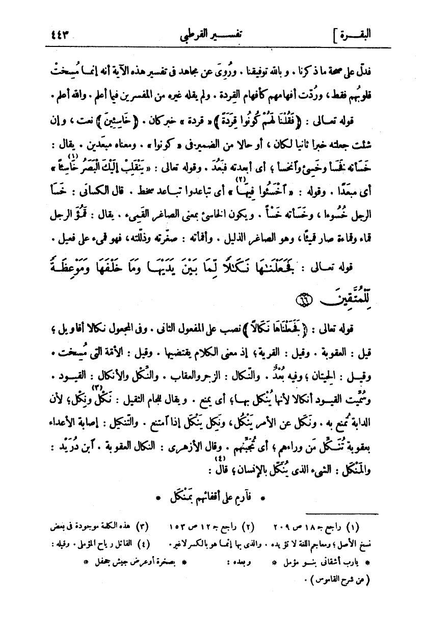 قَوْلُهُ تَعَالَى: (فَجَعَلْناها نَكالًا) نَصْبٌ عَلَى الْمَفْعُولِ الثَّانِي. وَفِي الْمَجْعُولِ نَكَالًا أَقَاوِيلُ، قِيلَ: الْعُقُوبَةُ. وَقِيلَ: الْقَرْيَةُ، إِذْ مَعْنَى الْكَلَامِ يَقْتَضِيهَا. وَقِيلَ: الْأُمَّةُ الَّتِي مُسِخَتْ. وَقِيلَ: الْحِيتَانُ، وَفِيهِ بُعْدٌ. وَالنَّكَالُ: الزَّجْرُ وَالْعِقَابُ. وَالنِّكْلُ وَالْأَنْكَالُ: الْقُيُودُ. وَسُمِّيَتِ الْقُيُودُ أَنْكَالًا لِأَنَّهَا يُنْكَّلُ بِهَا، أَيْ يُمْنَعُ. وَيُقَالُ لِلِّجَامِ الثَّقِيلِ: نَكْلٌ «٣» وَنِكْلٌ، لِأَنَّ الدَّابَّةَ تُمْنَعُ بِهِ. وَنَكَلَ عَنِ الْأَمْرِ يَنْكُلُ، وَنَكِلَ يَنْكَلُ إِذَا امْتَنَعَ. وَالتَّنْكِيلُ: إِصَابَةُ الْأَعْدَاءِ بِعُقُوبَةٍ تُنَكِّلُ مَنْ وَرَاءَهُمْ، أَيْ تُجَبِّنُهُمْ. وَقَالَ الْأَزْهَرِيُّ: النَّكَالُ الْعُقُوبَةُ. ابْنُ دُرَيْدٍ: وَالْمَنْكَلُ: الشيء الذي ينكل بالإنسان، قال: «٤»