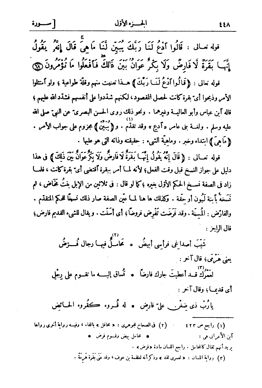 بَقَرَ بَطْنَهُ، أَيْ شَقَّهُ، فَالْبَقَرَةُ تَشُقُّ الْأَرْضَ بِالْحَرْثِ وَتُثِيرُهُ. وَمِنْهُ الْبَاقِرُ لِأَبِي جَعْفَرٍ مُحَمَّدِ بْنِ عَلِيٍّ زَيْنِ الْعَابِدِينَ، لِأَنَّهُ بَقَرَ الْعِلْمَ وَعَرَفَ أَصْلَهُ، أَيْ شَقَّهُ. وَالْبَقِيرَةُ: ثَوْبٌ يُشَقُّ فَتُلْقِيهِ الْمَرْأَةُ فِي عُنُقِهَا مِنْ غَيْرِ كُمَّيْنِ. وَفِي حَدِيثِ ابْنِ عَبَّاسٍ فِي شَأْنِ الْهُدْهُدِ (فَبَقَرَ الْأَرْضَ). قَالَ شَمِرٌ: بَقَرَ نَظَرَ مَوْضِعَ الْمَاءِ، فَرَأَى الْمَاءَ تَحْتَ الْأَرْضِ. قَالَ الْأَزْهَرِيُّ: الْبَقَرُ اسْمٌ لِلْجِنْسِ وَجَمْعُهُ «١» بَاقِرٌ. ابْنُ عَرَفَةَ: يُقَالُ بَقِيرٌ وَبَاقِرٌ وَبَيْقُورٌ. وَقَرَأَ عِكْرِمَةُ وَابْنُ يَعْمُرَ" إِنَّ الْبَاقِرَ". وَالثَّوْرُ: وَاحِدُ الثِّيرَانِ. وَالثَّوْرُ: السيد من الرجال. والثور القطعة من القط. وَالثَّوْرُ: الطُّحْلُبُ. وَثَوْرٌ: جَبَلٌ. وَثَوْرٌ: قَبِيلَةٌ مِنَ الْعَرَبِ. وَفِي الْحَدِيثِ: (وَوَقْتُ الْعِشَاءِ مَا لَمْ يَغِبْ ثَوْرُ الشَّفَقِ) يَعْنِي انْتِشَارَهُ، يُقَالُ: ثَارَ يَثُورُ ثَوْرًا وَثَوَرَانًا إِذَا انْتَشَرَ فِي الْأُفُقِ. وَفِي الْحَدِيثِ: (مَنْ أَرَادَ الْعِلْمَ فَلْيُثَوِّرِ الْقُرْآنَ). قَالَ شَمِرٌ: تَثْوِيرُ الْقُرْآنِ قِرَاءَتُهُ وَمُفَاتَشَةُ الْعُلَمَاءِ بِهِ. قَوْلُهُ تَعَالَى: (قالُوا أَتَتَّخِذُنا هُزُواً) هَذَا جَوَابٌ مِنْهُمْ لِمُوسَى عَلَيْهِ السَّلَامُ لَمَّا قَالَ لَهُمْ:" إِنَّ اللَّهَ يَأْمُرُكُمْ أَنْ تَذْبَحُوا بَقَرَةً" [البقرة: ٦٧] وَذَلِكَ أَنَّهُمْ وَجَدُوا قَتِيلًا بَيْنَ أَظْهُرِهِمْ قِيلَ: اسْمُهُ عَامِيلُ- وَاشْتَبَهَ أَمْرُ قَاتِلِهِ عَلَيْهِمْ، وَوَقَعَ بَيْنَهُمْ خِلَافٌ، فَقَالُوا: نَقْتَتِلُ وَرَسُولُ اللَّهِ بَيْنَ أَظْهُرِنَا، فَأَتَوْهُ وَسَأَلُوهُ الْبَيَانَ- وَذَلِكَ قَبْلَ نُزُولِ الْقَسَامَةِ «٢» فِي التَّوْرَاةِ، فَسَأَلُوا مُوسَى أَنْ يَدْعُوَ اللَّهَ- فَسَأَلَ مُوسَى عَلَيْهِ السَّلَامُ رَبَّهُ فَأَمَرَهُمْ بِذَبْحِ بَقَرَةٍ، فَلَمَّا سَمِعُوا ذَلِكَ مِنْ مُوسَى وَلَيْسَ فِي ظَاهِرِهِ جَوَابٌ عَمَّا سَأَلُوهُ عَنْهُ وَاحْتَكَمُوا فِيهِ عِنْدَهُ، قَالُوا: أَتَتَّخِذُنَا هُزُؤًا؟ وَالْهُزْءُ: اللَّعِبُ وَالسُّخْرِيَةُ، وَقَدْ تَقَدَّمَ «٣». وَقَرَأَ الْجَحْدَرِيُّ" أَيَتَّخِذُنَا" بِالْيَاءِ، أَيْ قَالَ ذَلِكَ بَعْضُهُمْ لِبَعْضٍ فَأَجَابَهُمْ مُوسَى عَلَيْهِ السَّلَامُ بِقَوْلِهِ:" أَعُوذُ بِاللَّهِ أَنْ أَكُونَ مِنَ الْجاهِلِينَ" [البقرة: ٦٧] لِأَنَّ الْخُرُوجَ عَنْ جَوَابِ السَّائِلِ الْمُسْتَرْشِدِ إِلَى الْهُزْءِ جَهْلٌ، فَاسْتَعَاذَ مِنْهُ عَلَيْهِ السَّلَامُ، لِأَنَّهَا صِفَةٌ تَنْتَفِي عَنِ الْأَنْبِيَاءِ. وَالْجَهْلُ نَقِيضُ الْعِلْمِ. فَاسْتَعَاذَ مِنَ الْجَهْلِ، كَمَا جَهِلُوا فِي قَوْلِهِمْ: أَتَتَّخِذُنا هُزُواً،