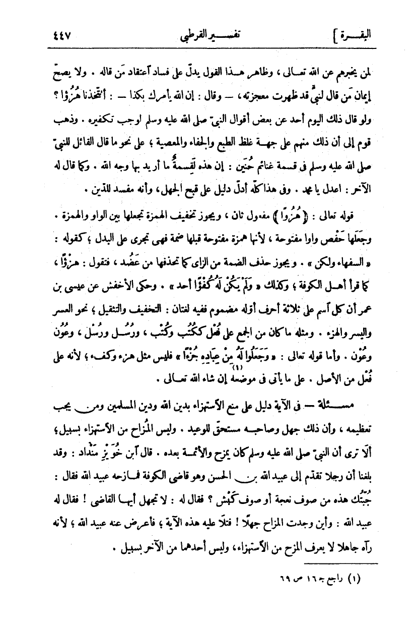 لِمَنْ يُخْبِرُهُمْ عَنِ اللَّهِ تَعَالَى، وَظَاهِرُ هَذَا الْقَوْلِ يَدُلُّ عَلَى فَسَادِ اعْتِقَادِ مَنْ قَالَهُ. وَلَا يَصِحُّ إِيمَانُ مَنْ قَالَ لِنَبِيٍّ قَدْ ظَهَرَتْ مُعْجِزَتُهُ،- وَقَالَ: إِنَّ اللَّهَ يَأْمُرُكَ بِكَذَا-: أَتَتَّخِذُنَا هُزُؤًا؟ وَلَوْ قَالَ ذَلِكَ الْيَوْمَ أَحَدٌ عَنْ بَعْضِ أَقْوَالِ النَّبِيِّ صَلَّى اللَّهُ عَلَيْهِ وَسَلَّمَ لَوَجَبَ تَكْفِيرُهُ. وَذَهَبَ قَوْمٌ إِلَى أَنَّ ذَلِكَ مِنْهُمْ عَلَى جِهَةِ غِلَظِ الطَّبْعِ وَالْجَفَاءِ وَالْمَعْصِيَةِ، عَلَى نَحْوِ مَا قَالَ الْقَائِلُ لِلنَّبِيِّ صَلَّى اللَّهُ عَلَيْهِ وَسَلَّمَ فِي قِسْمَةِ غَنَائِمِ حُنَيْنٍ: إِنَّ هَذِهِ لَقِسْمَةٌ مَا أُرِيدَ بِهَا وَجْهَ اللَّهِ. وَكَمَا قَالَ لَهُ الْآخَرُ: اعْدِلْ يَا مُحَمَّدُ. وَفِي هَذَا كُلِّهِ أَدَلُّ دَلِيلٍ عَلَى قُبْحِ الْجَهْلِ، وَأَنَّهُ مُفْسِدٌ لِلدِّينِ. قَوْلُهُ تَعَالَى:" هُزُواً" مَفْعُولٌ ثَانٍ، وَيَجُوزُ تَخْفِيفُ الْهَمْزَةِ تَجْعَلُهَا بَيْنَ الْوَاوِ وَالْهَمْزَةِ. وَجَعَلَهَا حَفْصٌ وَاوًا مَفْتُوحَةً، لِأَنَّهَا هَمْزَةٌ مَفْتُوحَةٌ قَبْلَهَا ضَمَّةٌ فَهِيَ تَجْرِي عَلَى الْبَدَلِ، كَقَوْلِهِ:" السُّفَهاءُ وَلكِنْ". وَيَجُوزُ حَذْفُ الضَّمَّةِ مِنَ الزَّايِ كَمَا تَحْذِفُهَا مِنْ عَضُدٍ، فَتَقُولُ: هُزْؤًا، كَمَا قَرَأَ أَهْلُ الْكُوفَةِ، وَكَذَلِكَ" وَلَمْ يَكُنْ لَهُ كُفُؤًا أَحَدٌ". وَحَكَى الْأَخْفَشُ عَنْ عِيسَى بْنِ عُمَرَ أَنَّ كُلَّ اسْمٍ عَلَى ثَلَاثَةِ أَحْرُفٍ أَوَّلُهُ مَضْمُومٌ فَفِيهِ لُغَتَانِ: التَّخْفِيفُ وَالتَّثْقِيلُ، نَحْوُ الْعُسْرِ وَالْيُسْرِ وَالْهُزْءِ. وَمِثْلُهُ مَا كَانَ مِنَ الْجَمْعِ عَلَى فُعُلٍ كَكُتُبٍ وَكُتْبٍ، وَرُسُلٍ وَرُسْلٍ، وَعُوُنٍ وَعُوْنٍ. وَأَمَّا قَوْلُهُ تَعَالَى:" وَجَعَلُوا لَهُ مِنْ عِبادِهِ جُزْءاً" [الزخرف: ١٥] فَلَيْسَ مِثْلَ هُزْءٍ وَكُفْءٍ، لِأَنَّهُ عَلَى فُعْلٍ مِنَ الْأَصْلِ. عَلَى مَا يَأْتِي فِي مَوْضِعِهِ «١» إِنْ شَاءَ اللَّهُ تَعَالَى. مَسْأَلَةٌ: فِي الْآيَةِ دَلِيلٌ عَلَى مَنْعِ الِاسْتِهْزَاءِ بِدِينِ اللَّهِ وَدِينِ الْمُسْلِمِينَ وَمَنْ يَجِبُ تَعْظِيمُهُ، وَأَنَّ ذَلِكَ جَهْلٌ وَصَاحِبُهُ مُسْتَحِقٌّ لِلْوَعِيدِ. وَلَيْسَ الْمُزَاحُ مِنَ الِاسْتِهْزَاءِ بِسَبِيلٍ، أَلَا تَرَى أَنَّ النَّبِيَّ صَلَّى اللَّهُ عَلَيْهِ وَسَلَّمَ كَانَ يَمْزَحُ وَالْأَئِمَّةَ بَعْدَهُ. قَالَ ابْنُ خُوَيْزِ مَنْدَادُ: وَقَدْ بَلَغَنَا أَنَّ رَجُلًا تَقَدَّمَ إِلَى عُبَيْدِ اللَّهِ بْنِ الْحَسَنِ وَهُوَ قَاضِي الْكُوفَةِ فَمَازَحَهُ عُبَيْدُ اللَّهِ فَقَالَ: جُبَّتُكَ هَذِهِ مِنْ صُوفِ نَعْجَةٍ أَوْ صُوفِ كَبْشٍ؟ فَقَالَ لَهُ: لَا تَجْهَلْ أَيُّهَا الْقَاضِي! فَقَالَ له عبيد الله: وأين وجدت المزاج جَهْلًا! فَتَلَا عَلَيْهِ هَذِهِ الْآيَةَ، فَأَعْرَضَ عَنْهُ عُبَيْدُ اللَّهِ، لِأَنَّهُ رَآهُ جَاهِلًا لَا يَعْرِفُ الْمَزْحَ مِنَ الِاسْتِهْزَاءِ، وَلَيْسَ أَحَدُهُمَا مِنَ الْآخَرِ بسبيل.