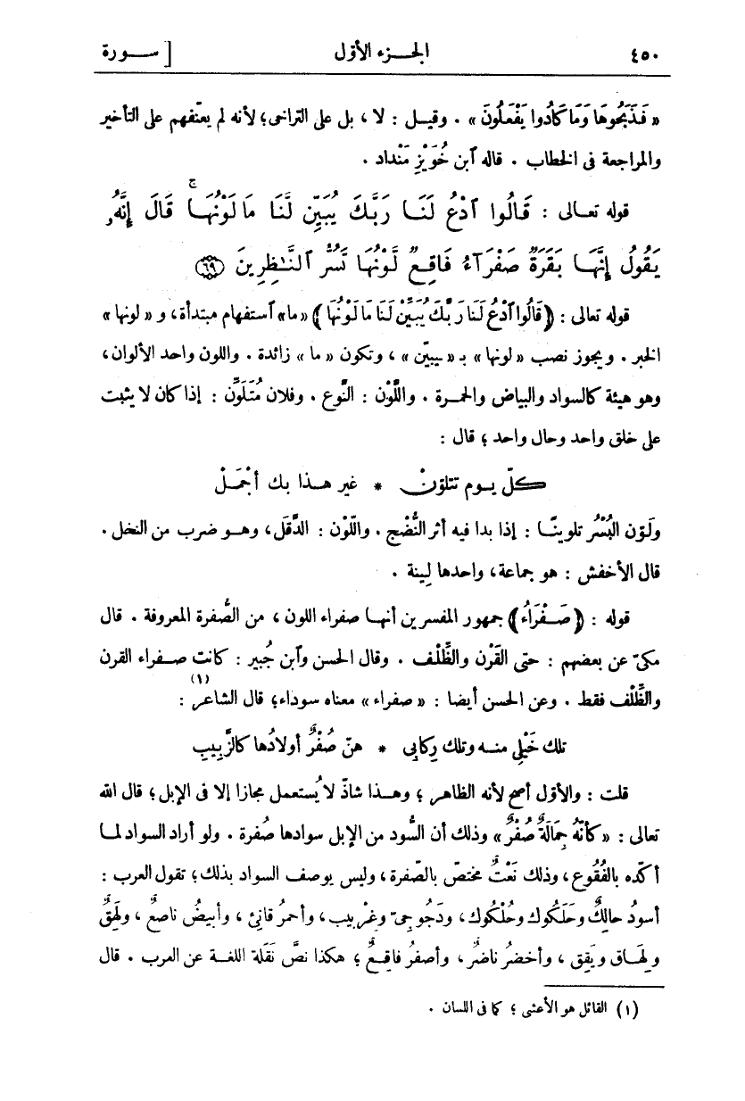 قُلْتُ: وَالْأَوَّلُ أَصَحُّ لِأَنَّهُ الظَّاهِرُ، وَهَذَا شَاذٌّ لَا يُسْتَعْمَلُ مَجَازًا إِلَّا فِي الْإِبِلِ، قَالَ اللَّهُ تَعَالَى:" كَأَنَّهُ جِمالَتٌ صُفْرٌ" [المرسلات: ٣٣] وَذَلِكَ أَنَّ السُّودَ مِنَ الْإِبِلِ سَوَادُهَا صُفْرَةٌ. وَلَوْ أَرَادَ السَّوَادَ لَمَا أَكَّدَهُ بِالْفُقُوعِ، وَذَلِكَ نَعْتٌ مُخْتَصٌّ بِالصُّفْرَةِ، وَلَيْسَ يُوصَفُ السَّوَادُ بِذَلِكَ تَقُولُ الْعَرَبُ: أَسْوَدُ حَالِكٌ وَحَلَكُوكٌ وَحُلْكُوكٌ، وَدَجُوجِيٌّ وَغِرْبِيبٌ، وَأَحْمَرُ قَانِئٌ، وَأَبْيَضُ نَاصِعٌ وَلَهِقٌ وَلِهَاقٌ وَيَقَقٌ، وَأَخْضَرُ نَاضِرٌ، وَأَصْفَرُ فَاقِعٌ، هَكَذَا نَصَّ نقلة اللغة عن العرب. قال