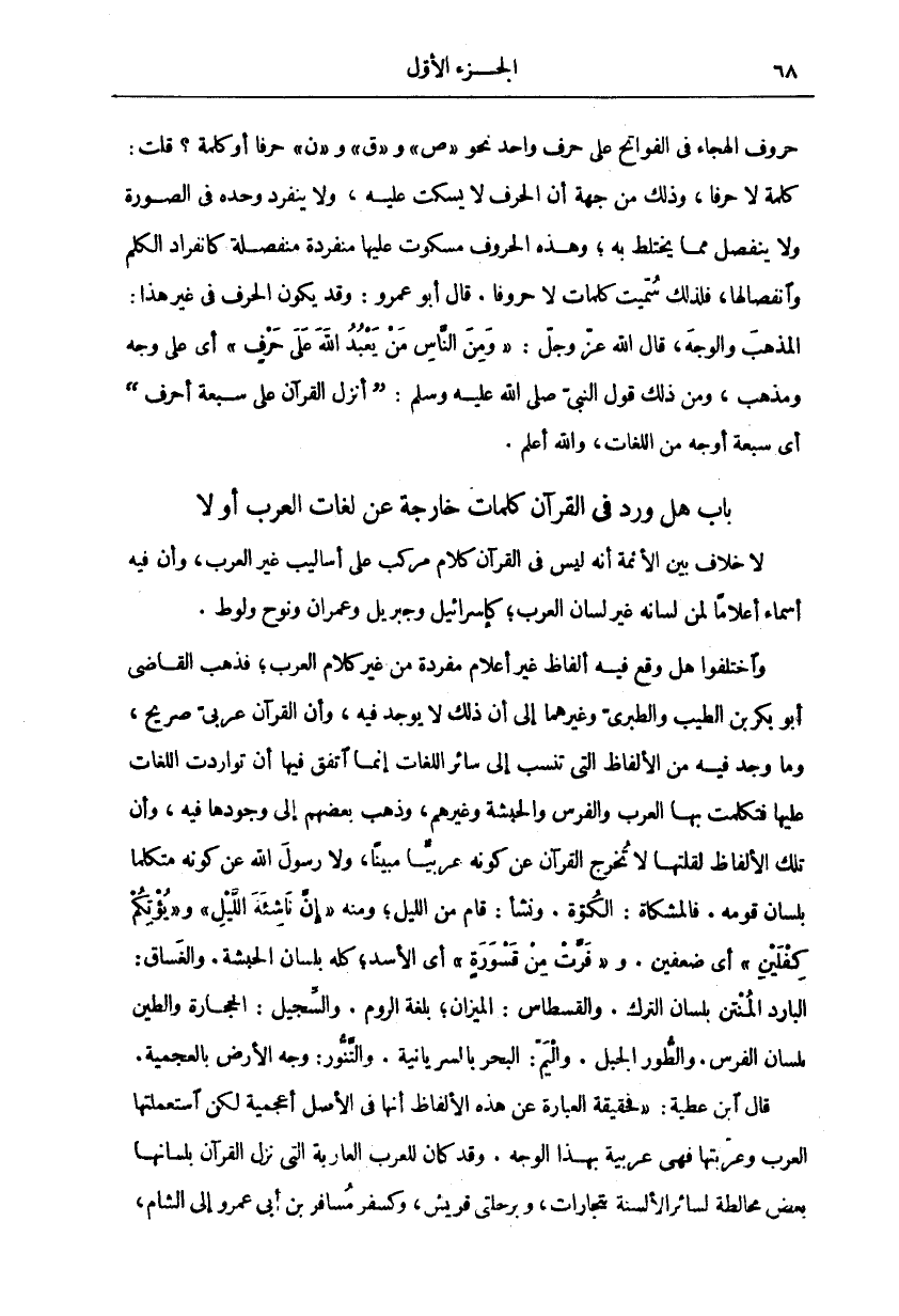 لَا خِلَافَ بَيْنَ الْأَئِمَّةِ أَنَّهُ لَيْسَ فِي الْقُرْآنِ كَلَامٌ مُرَكَّبٌ عَلَى أَسَالِيبَ غَيْرِ الْعَرَبِ، وَأَنَّ فِيهِ أَسْمَاءٌ أَعْلَامًا لِمَنْ لِسَانُهُ غَيْرُ الْعَرَبِ، كَإِسْرَائِيلَ وَجِبْرِيلَ وَعِمْرَانَ وَنُوحٍ وَلُوطٍ. وَاخْتَلَفُوا هَلْ وَقَعَ فِيهِ أَلْفَاظٌ غَيْرُ أَعْلَامٍ مُفْرَدَةٍ من كلام غير الْعَرَبِ، فَذَهَبَ الْقَاضِي أَبُو بَكْرِ بْنُ الطَّيِّبِ وَالطَّبَرَيُّ وَغَيْرُهُمَا إِلَى أَنَّ ذَلِكَ لَا يُوجَدُ فِيهِ، وَأَنَّ الْقُرْآنَ عَرَبِيٌّ صَرِيحٌ، وَمَا وُجِدَ فِيهِ مِنَ الْأَلْفَاظِ الَّتِي تُنْسَبُ إِلَى سَائِرِ اللُّغَاتِ إِنَّمَا اتُّفِقَ فِيهَا أَنْ تَوَارَدَتِ اللُّغَاتُ عَلَيْهَا فَتَكَلَّمَتْ بِهَا الْعَرَبُ وَالْفُرْسُ وَالْحَبَشَةُ وَغَيْرُهُمْ، وَذَهَبَ بَعْضُهُمْ إِلَى وُجُودِهَا فِيهِ، وَأَنَّ تِلْكَ الْأَلْفَاظَ لِقِلَّتِهَا لَا تُخْرِجُ الْقُرْآنُ عَنْ كَوْنِهِ عَرَبِيًّا مُبَيِنًا، وَلَا رَسُولَ اللَّهِ عَنْ كَوْنِهِ متكلما بلسان قومه، فالمشكاة: الكوة وو نشأ: قَامَ مِنَ اللَّيْلِ، وَمِنْهُ" إِنَّ ناشِئَةَ اللَّيْلِ" و" يُؤْتِكُمْ كِفْلَيْنِ" أي ضعفين. و" فَرَّتْ مِنْ قَسْوَرَةٍ" أَيِ الْأَسَدِ، كُلُّهُ بِلِسَانِ الْحَبَشَةِ. وَالْغَسَّاقُ: الْبَارِدُ الْمُنْتِنُ بِلِسَانِ التُّرْكِ. وَالْقِسْطَاسُ: الْمِيزَانُ، بِلُغَةِ الرُّومِ. وَالسِّجِّيلُ: الْحِجَارَةُ وَالطِّينُ بِلِسَانِ الْفُرْسِ. وَالطُّورُ الْجَبَلُ. وَالْيَمُّ الْبَحْرُ بِالسُّرْيَانِيَّةِ. وَالتَّنُّورُ: وَجْهُ الْأَرْضِ بِالْعَجَمِيَّةِ. قَالَ ابْنُ عَطِيَّةَ:" فَحَقِيقَةُ الْعِبَارَةِ عَنْ هَذِهِ الْأَلْفَاظِ أَنَّهَا فِي الْأَصْلِ أَعْجَمِيَّةٌ لَكِنِ اسْتَعْمَلَتْهَا الْعَرَبُ وَعَرَّبَتْهَا فَهِيَ عَرَبِيَّةٌ بِهَذَا الْوَجْهِ. وَقَدْ كان العرب الْعَارِبَةِ الَّتِي نَزَلَ الْقُرْآنُ بِلِسَانِهَا بَعْضُ مُخَالَطَةٍ لسائر الألسنة تحارت، وَبِرِحْلَتِي قُرَيْشٍ، وَكَسَفَرِ مُسَافِرِ بْنِ أَبِي عَمْرٍو إلى الشام،